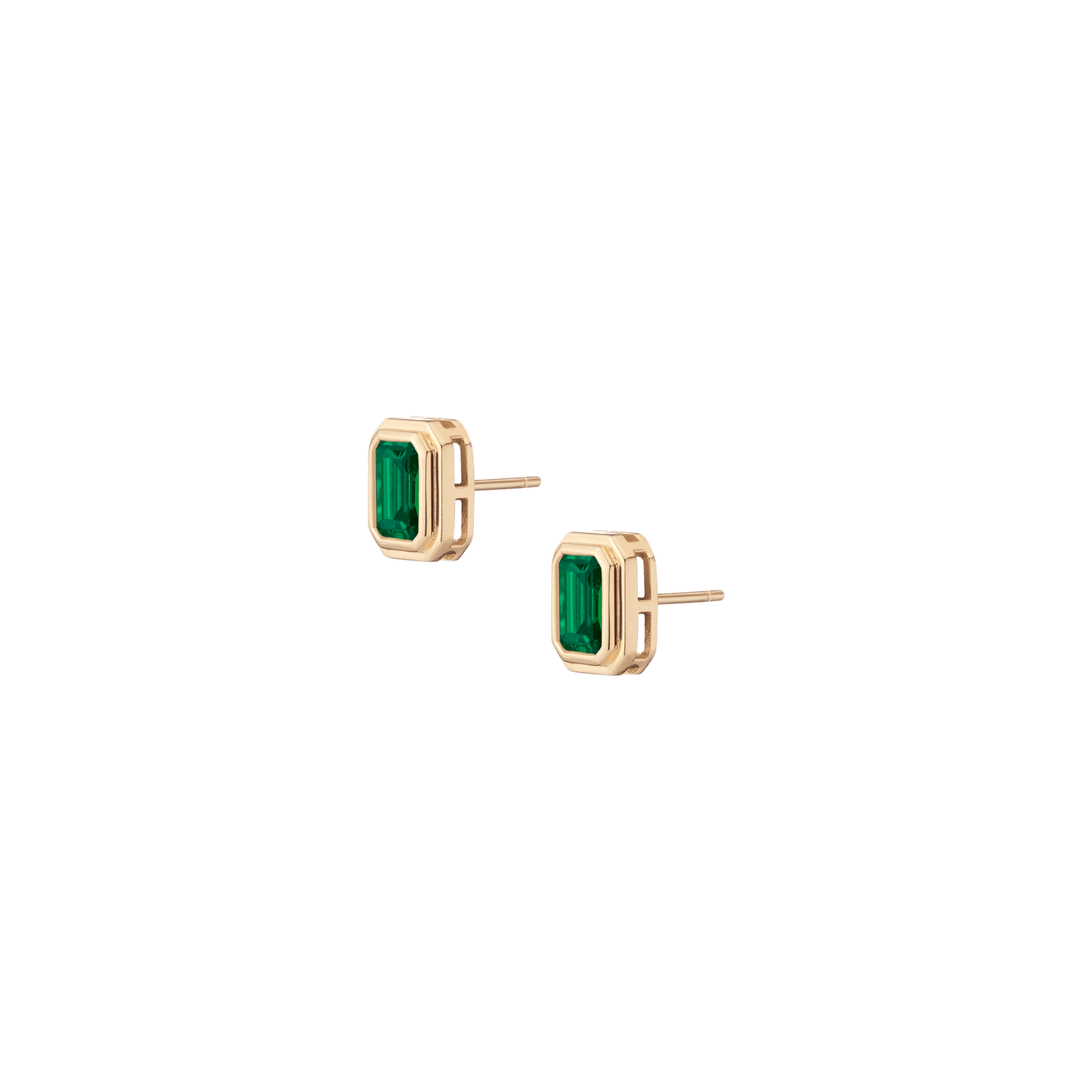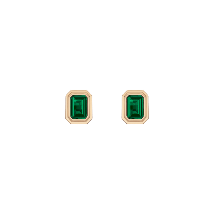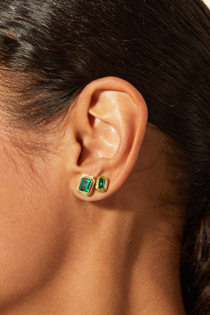 Crafted in gold vermeil with 7×5mm AAA quality lab grown emeralds. Stud size: 7.85×17mm. Thickness: 3.84mm. Weight: 2.1g. Secured with post and wingnut.