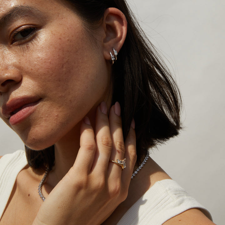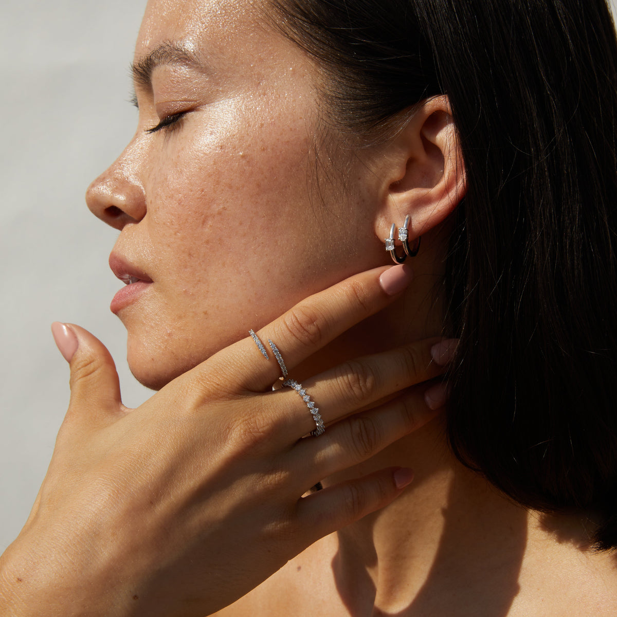 These Emerald Lab Grown Diamond Huggies by Aurate in sterling silver bring modern sophistication to your ear stack. Featuring brilliant emerald-cut lab diamonds prong-set along a classic hinged huggie silhouette, these earrings are a versatile and polished choice.