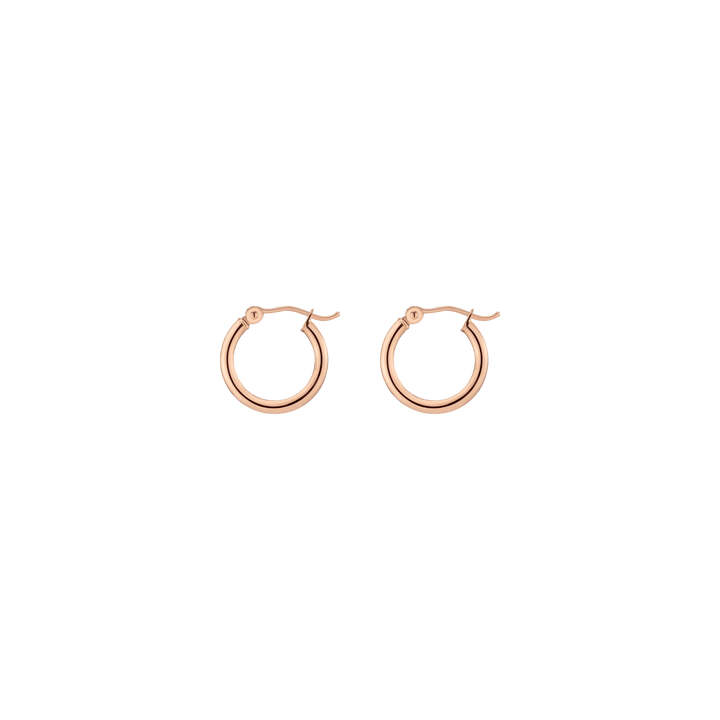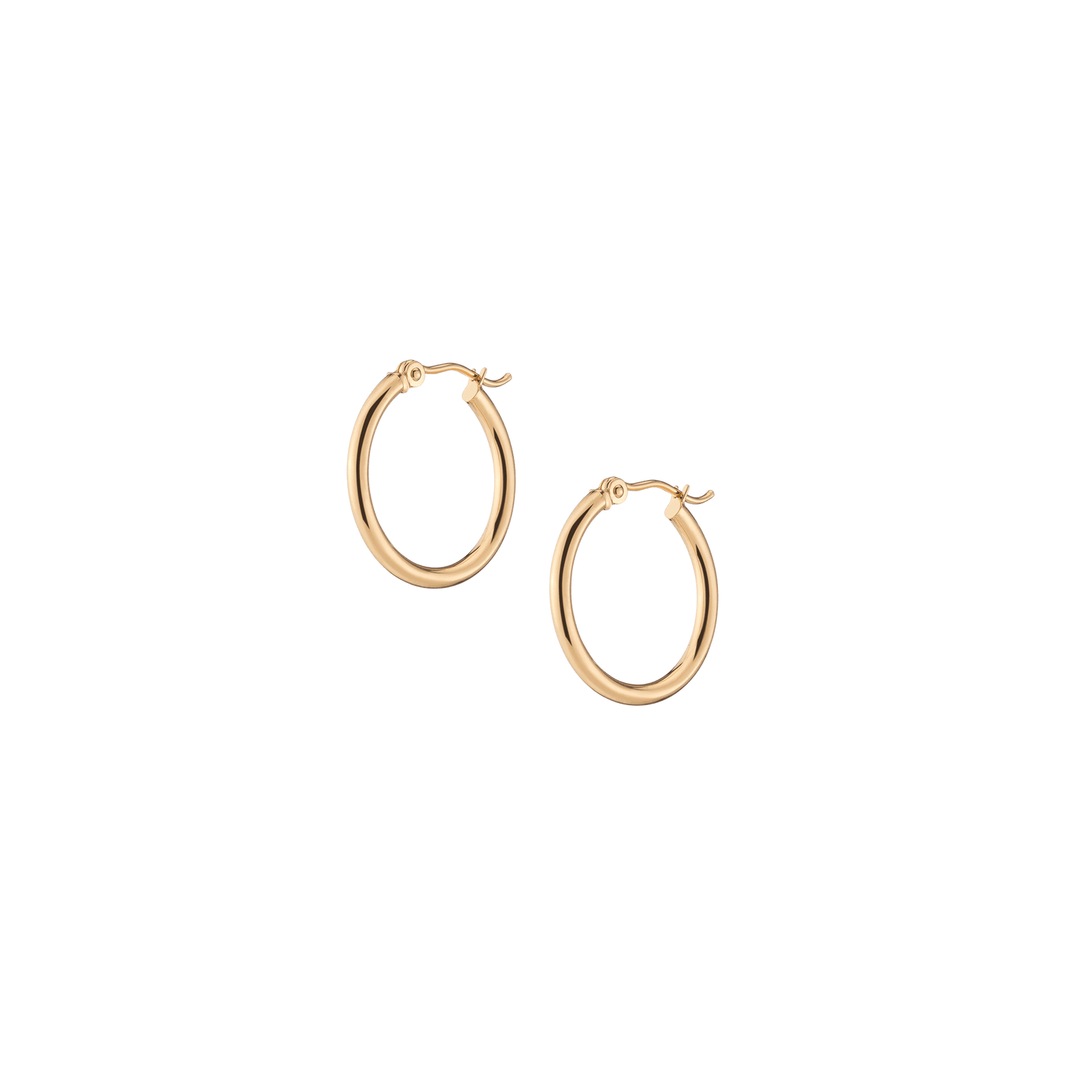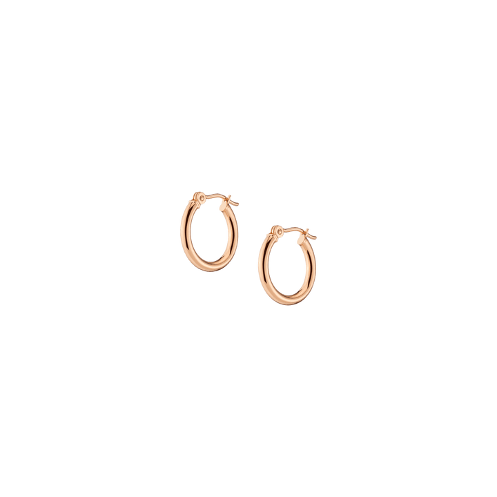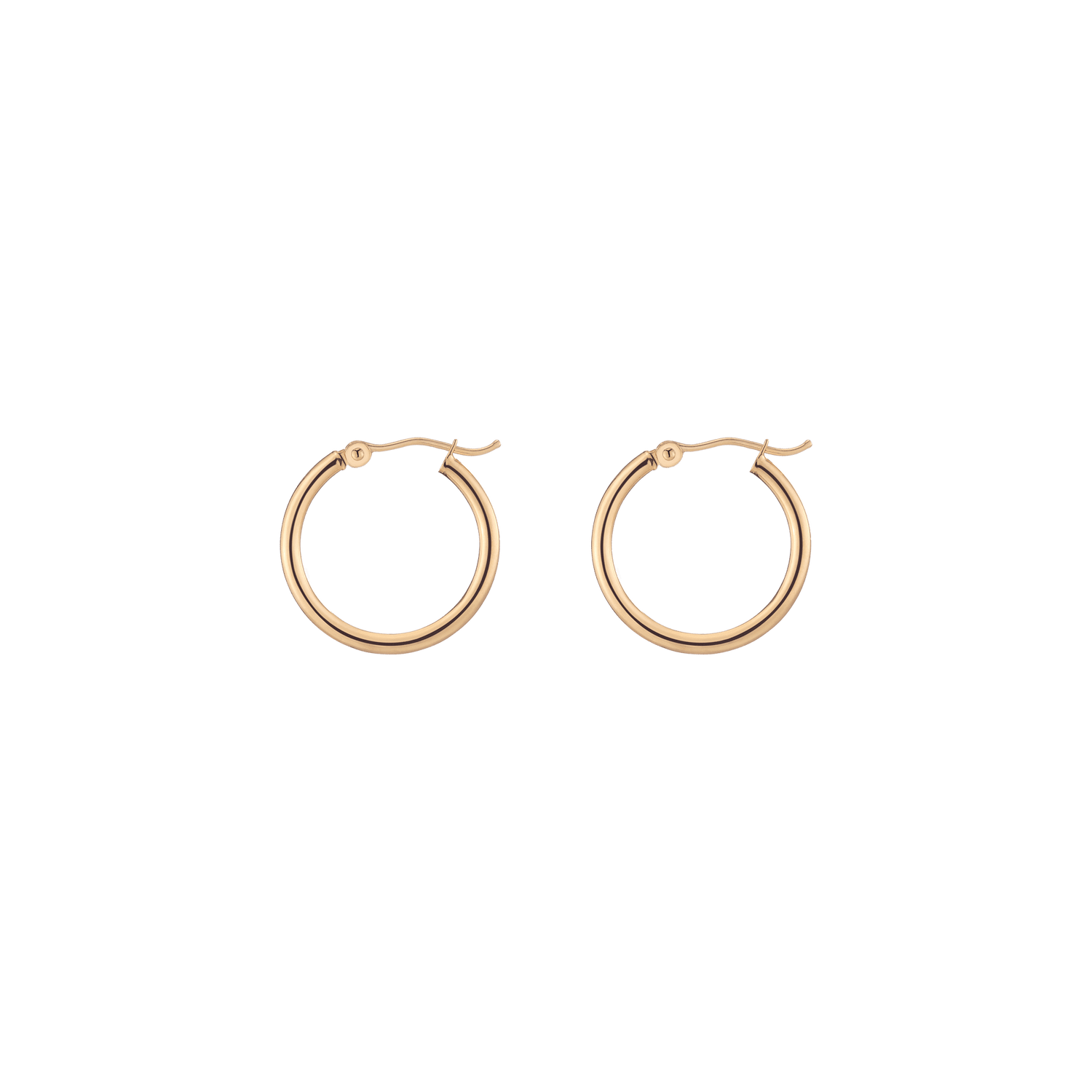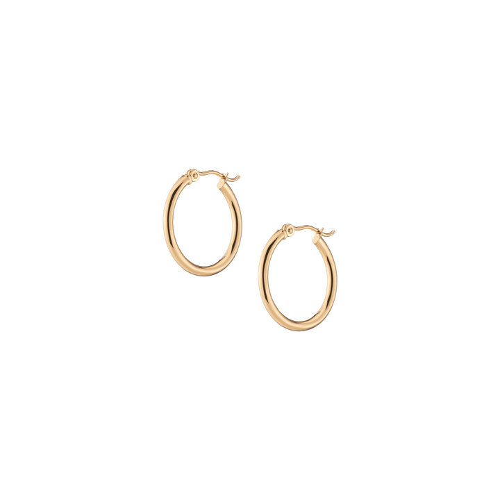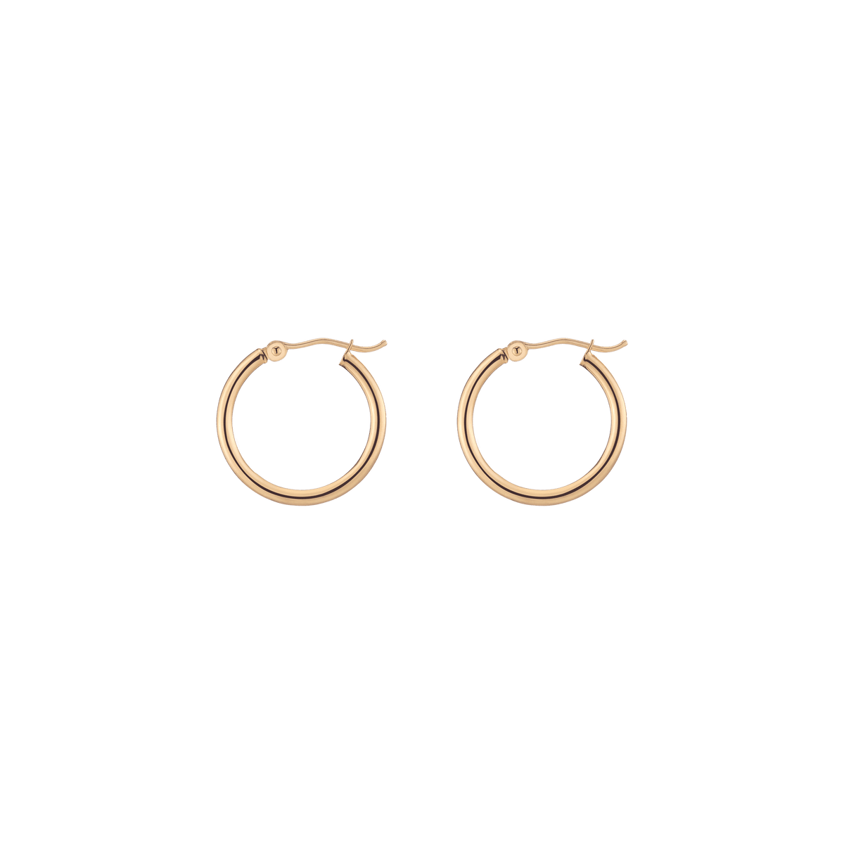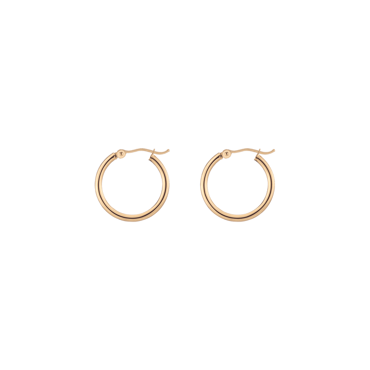 Hollow hoops in 14k gold alloy, 2mm width and thickness. Available diameters: 15mm (0.9g), 20mm (1.1g), 25mm (1.2g), 30mm (1.4g), 40mm (1.7g), 50mm (2.9g), 60mm (3.5g). Hinge post with secure latch.
