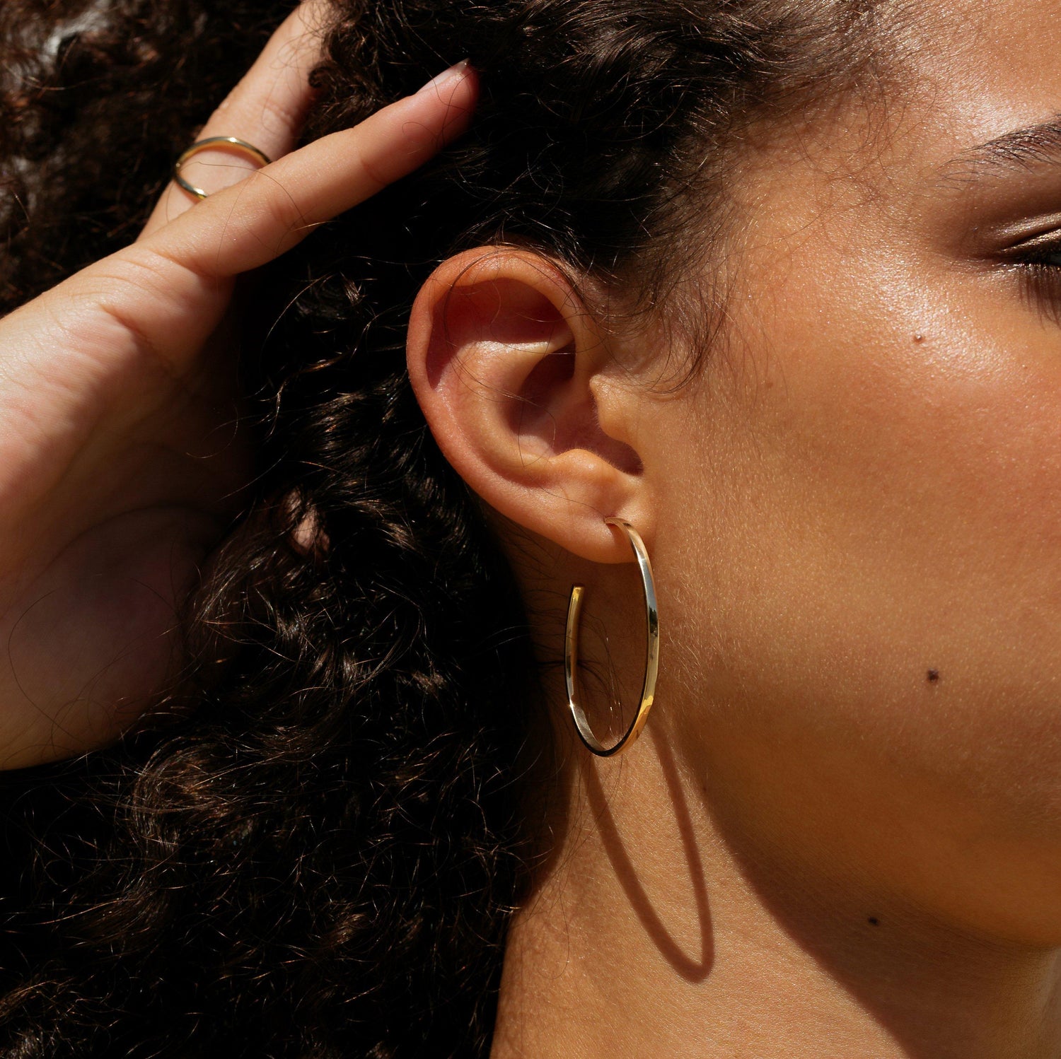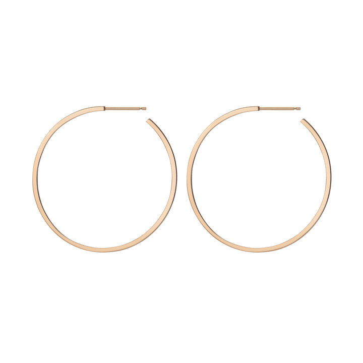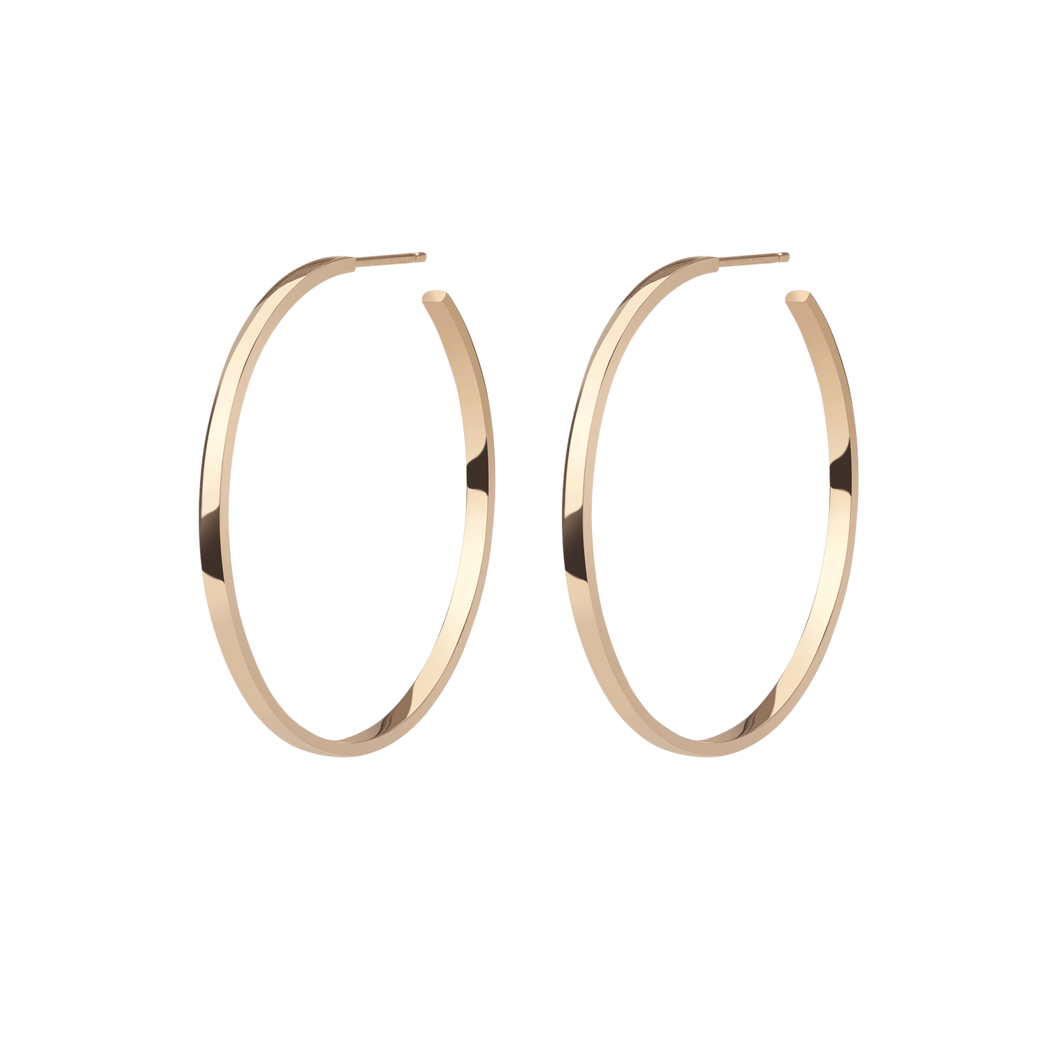 Crafted in 14k gold. Diameter: 3.7cm. Thickness: 1.2mm. Weight: 2.6g–3.4g (single). Secured with post and wingnut closures.