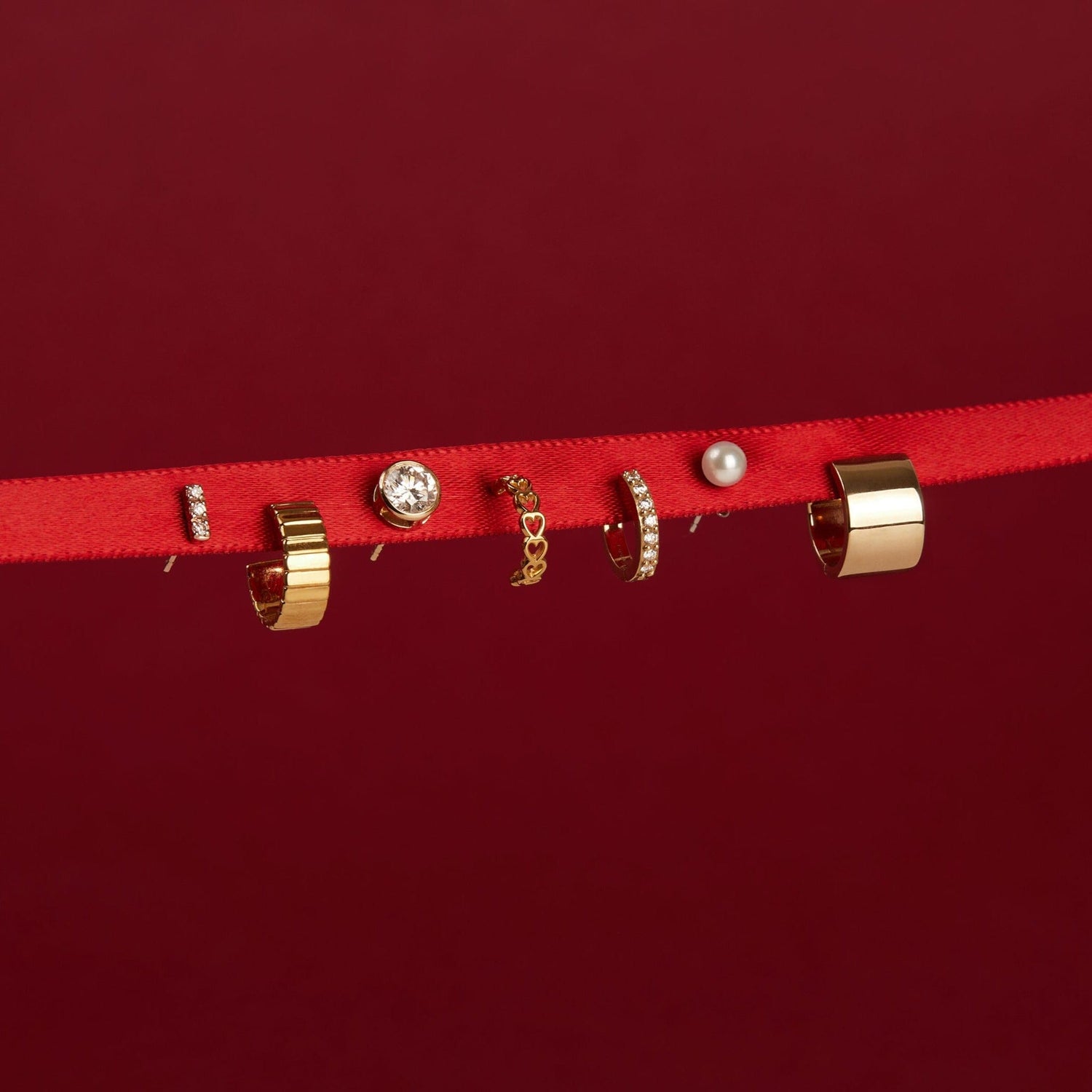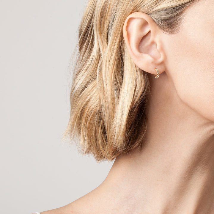 These Infinity Heart Huggie Earrings by Aurate in vermeil wrap the ear in a delicate trail of gold hearts. Symbolizing infinite affection, their playful form and polished finish make them an easy everyday statement.
