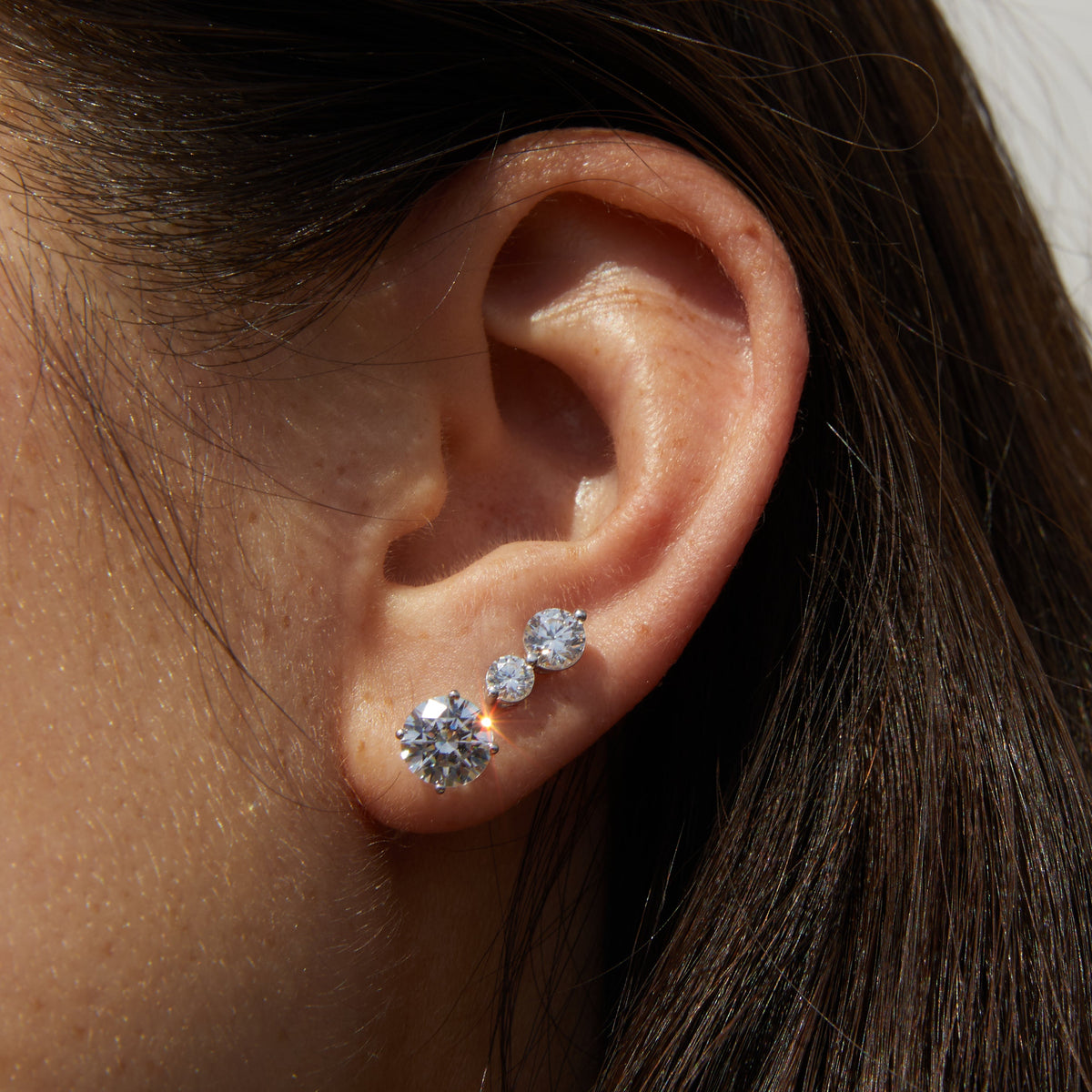 Crafted in sterling silver with SI2 clarity, F/G color lab grown diamonds (3.4mm and 4.4mm). Earrings measure 4.5x10mm, 3.8mm thick, and weigh 1.1g. Priced as a pair.