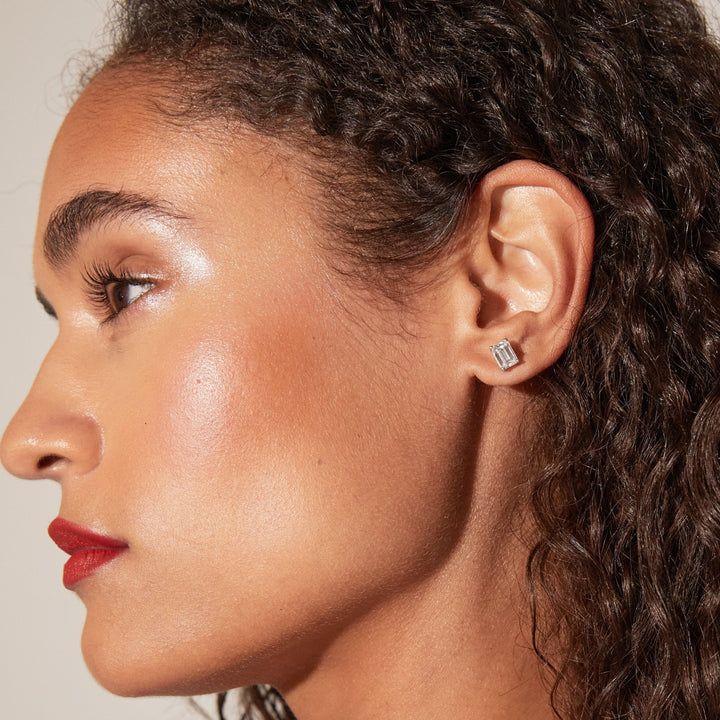 These Luxury Emerald Lab Grown Diamond Studs by Aurate in 14k gold bring regal elegance to everyday wear. The emerald-cut diamonds are set in delicate gold baskets, designed to highlight their crisp facets and rich sparkle. With a secure screw-back post, these 2 carat total weight studs are crafted for beauty, comfort, and confidence.