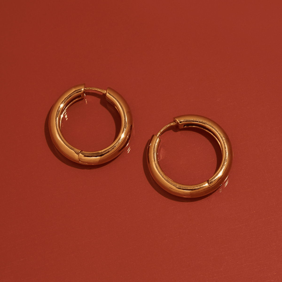 These Medium Chunky Hinged Hoop Earrings by Aurate in 18k gold redefine bold elegance with their sculptural form and polished shine. Designed for everyday wearability, their domed surface catches the light beautifully while their hollow construction ensures all-day comfort. A modern staple for elevating casual and formal looks alike.