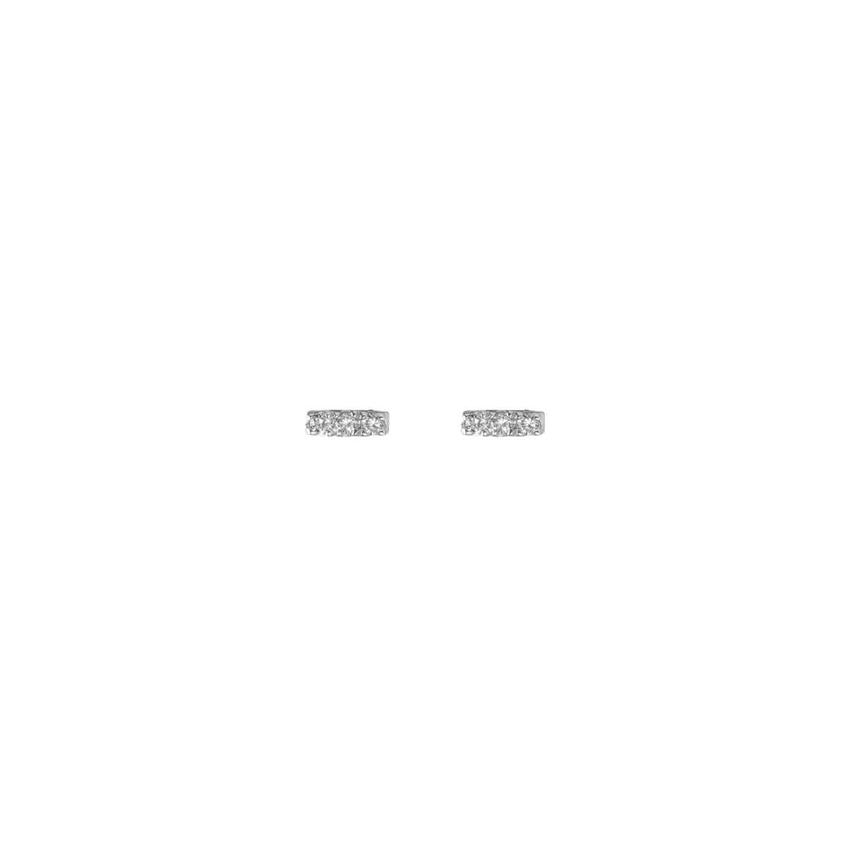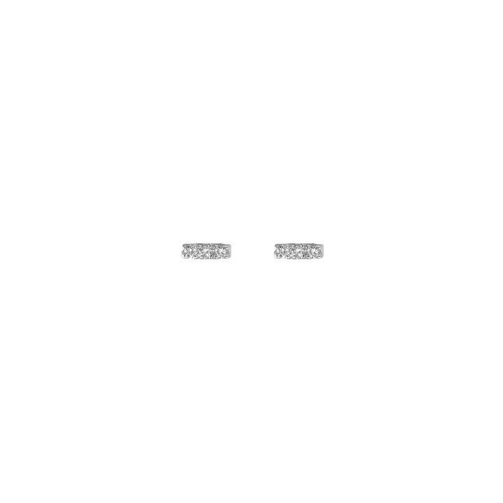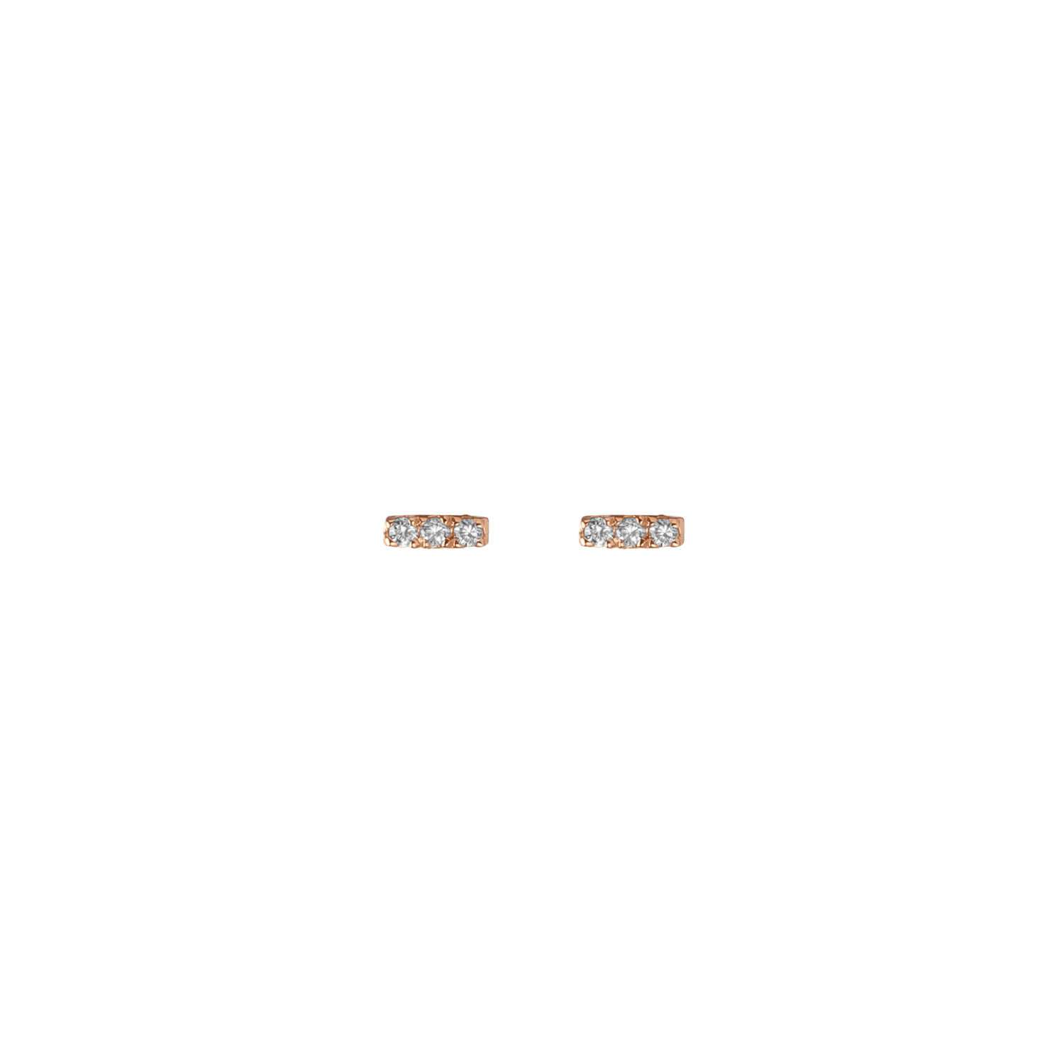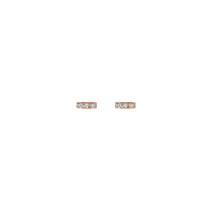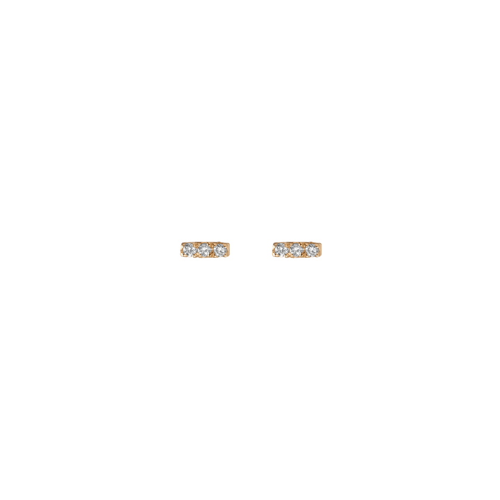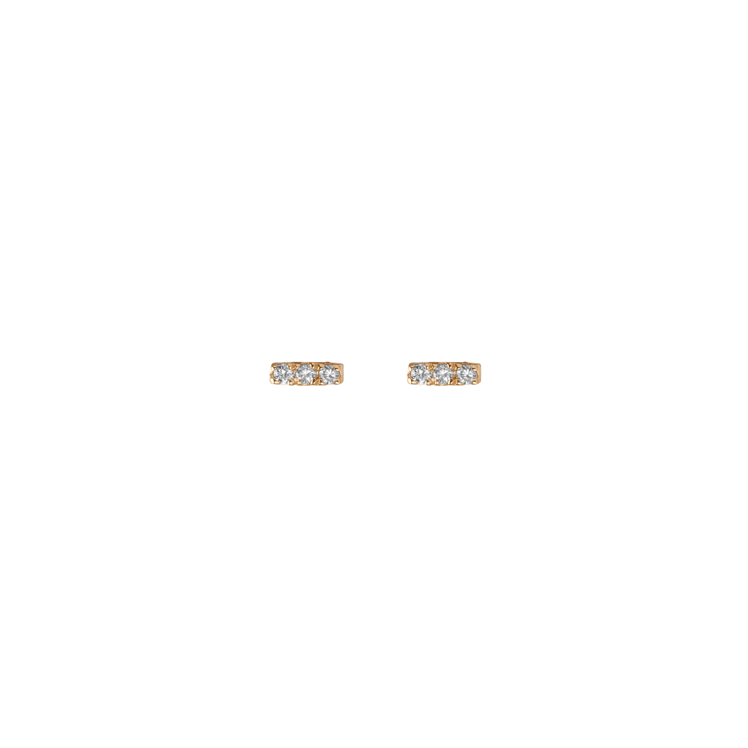 Handcrafted in 14k gold. Each earring features 3 round brilliant-cut SI clarity diamonds (1.4mm, 0.012ct each). Total length: 5mm. Width & Thickness: 1.5mm. Weight: 0.2g (single). Secured with wing nut closure.