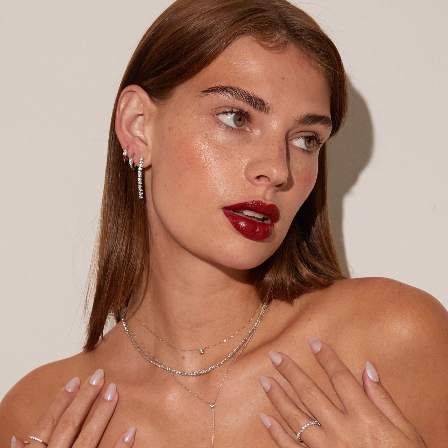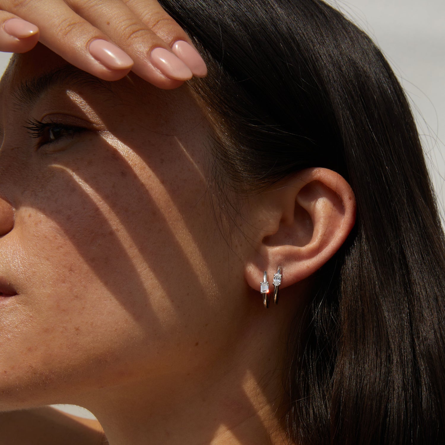 These Oval Lab Grown Diamond Huggies by Aurate in sterling silver bring playful polish to everyday style. Featuring prong-set oval diamonds and a secure hinging post, they balance classic sparkle with a contemporary silhouette. Lightweight yet luminous, they’re your next go-to pair.