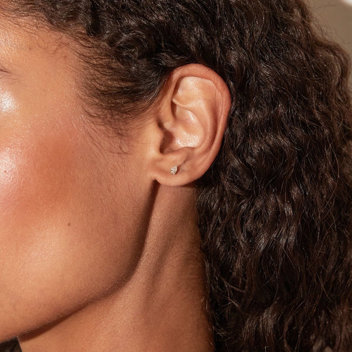 Crafted in 14k recycled gold with G SI1 pear lab-grown diamonds totaling 0.4tcw (4×2mm each). Basket width: 5×3mm. Setting height: 4mm. Weight: 0.8g. Secured with post and wingnut.