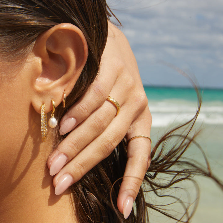 These Pearl Drop Huggie Earrings by Aurate (18k) redefine classic elegance with a twist of modern romance. Featuring luminous, baroque-shaped pearls suspended from sleek gold huggies, they move with grace and light. Whether dressed up or worn casually, they add a refined touch of natural beauty.