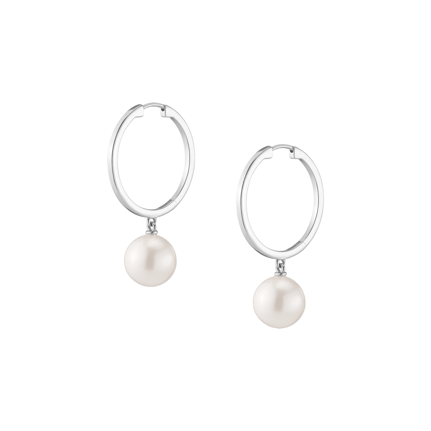 Handcrafted in 18k gold with AAA grade 9mm freshwater cultured pearls. Hinged hoop design. Diameter: 20mm. Thickness: 1.75mm. Weight: 5g.