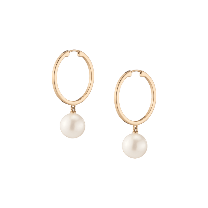 These Pearl Hoop Earrings by Aurate in 18k gold blend modern edge with classic charm. A luminous 9mm freshwater pearl dangles from each sleek gold hoop, offering a stylish contrast of shape and texture. Ideal for dressing up your daily look or pairing with crisp whites and beachy waves.