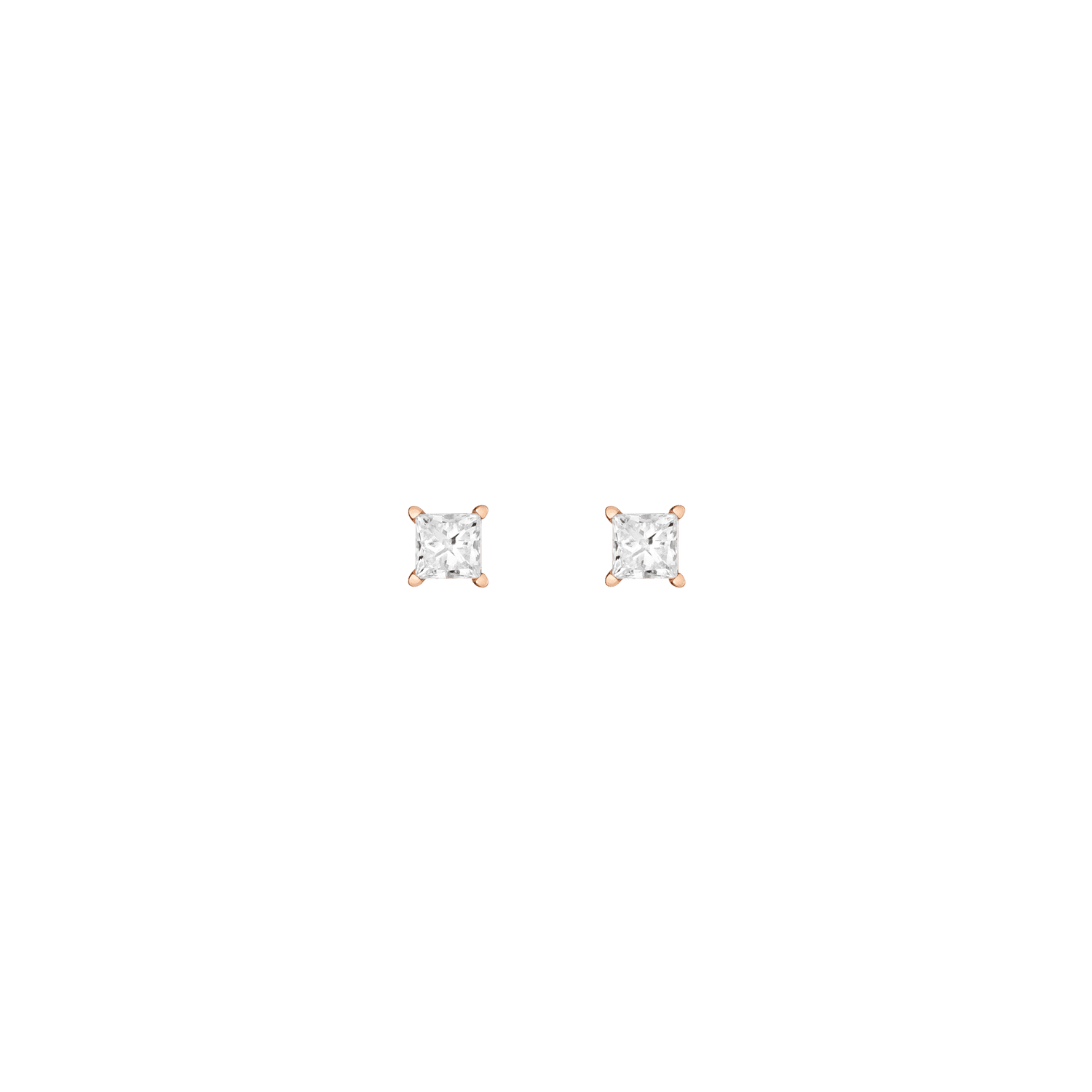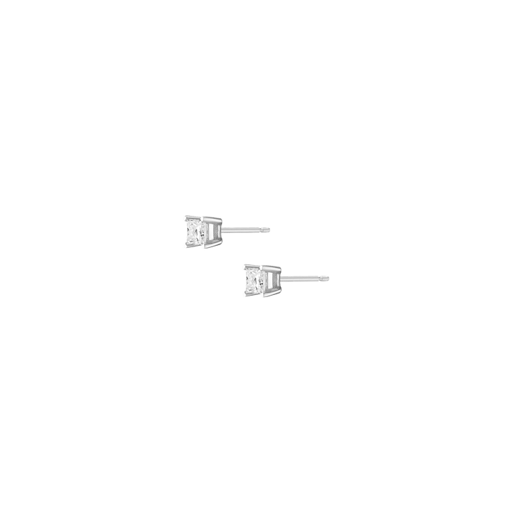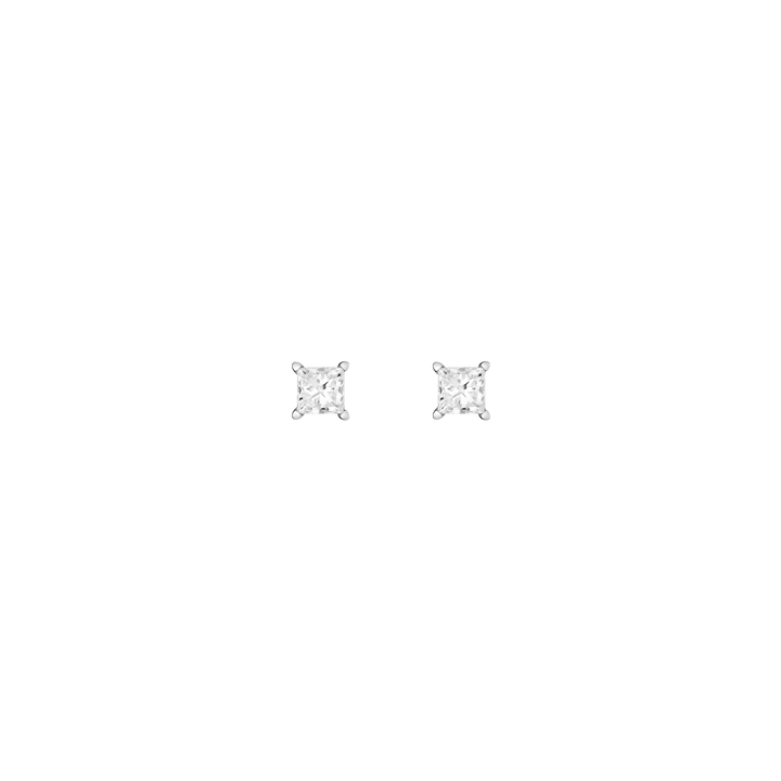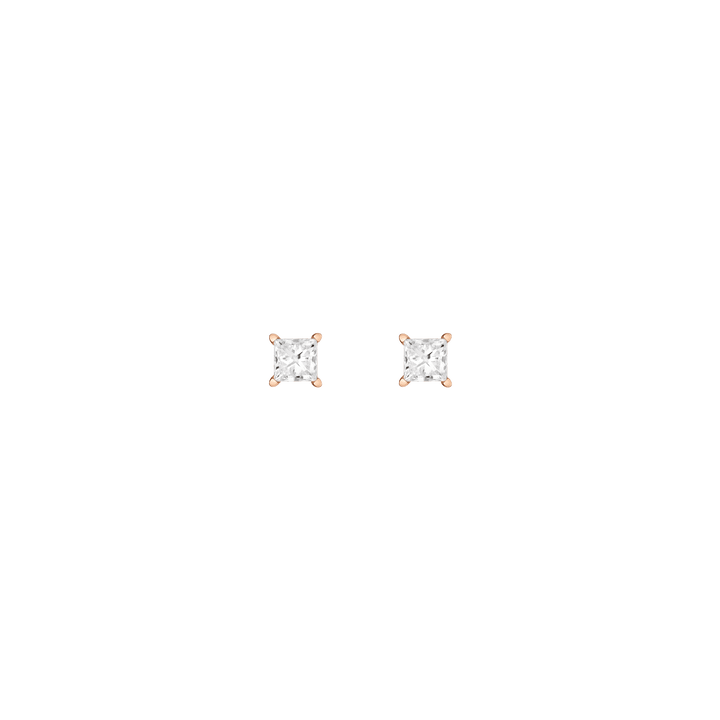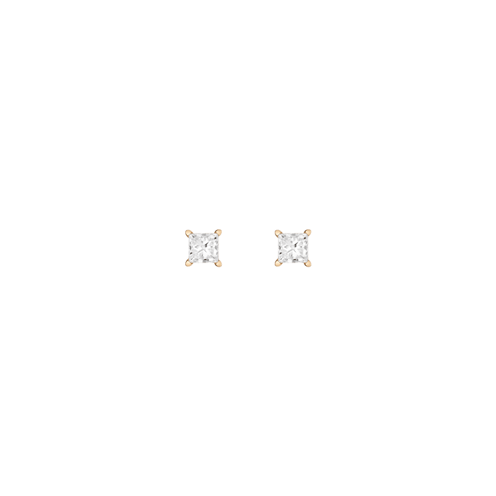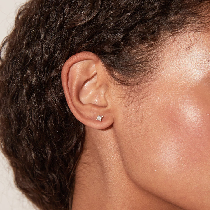 Crafted in 18k recycled gold with G SI1 princess-cut lab grown diamonds (3.3mm), 0.4tcw. Basket size: 4×4mm. Setting height: 4mm. Weight: 0.8g. Post and wingnut closure.