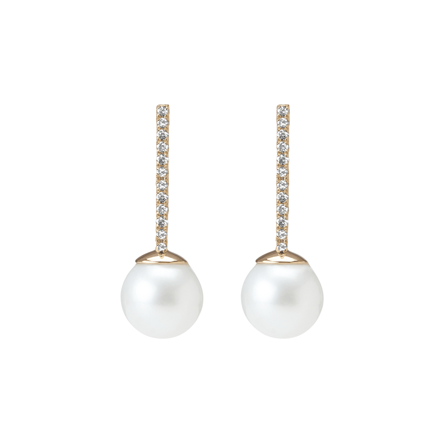 Crafted in 18-karat gold with 12x 1.4mm round brilliant diamonds per earring (SI clarity, total 0.3ct). AAA freshwater pearls, 12mm diameter. Length: 32mm, width: 12mm. Wingnut post closure.