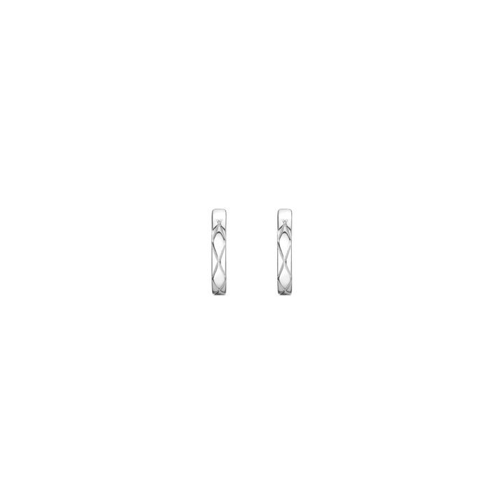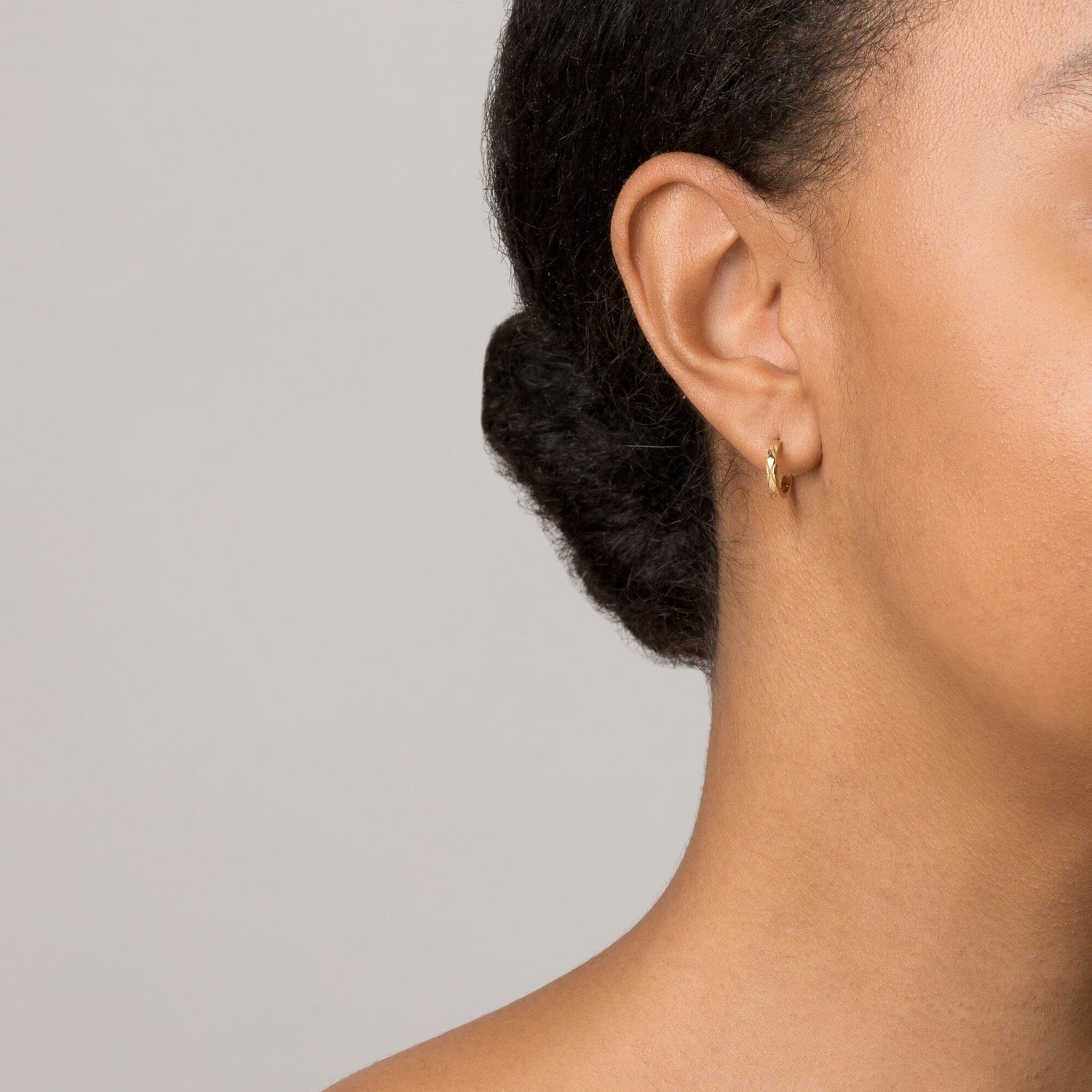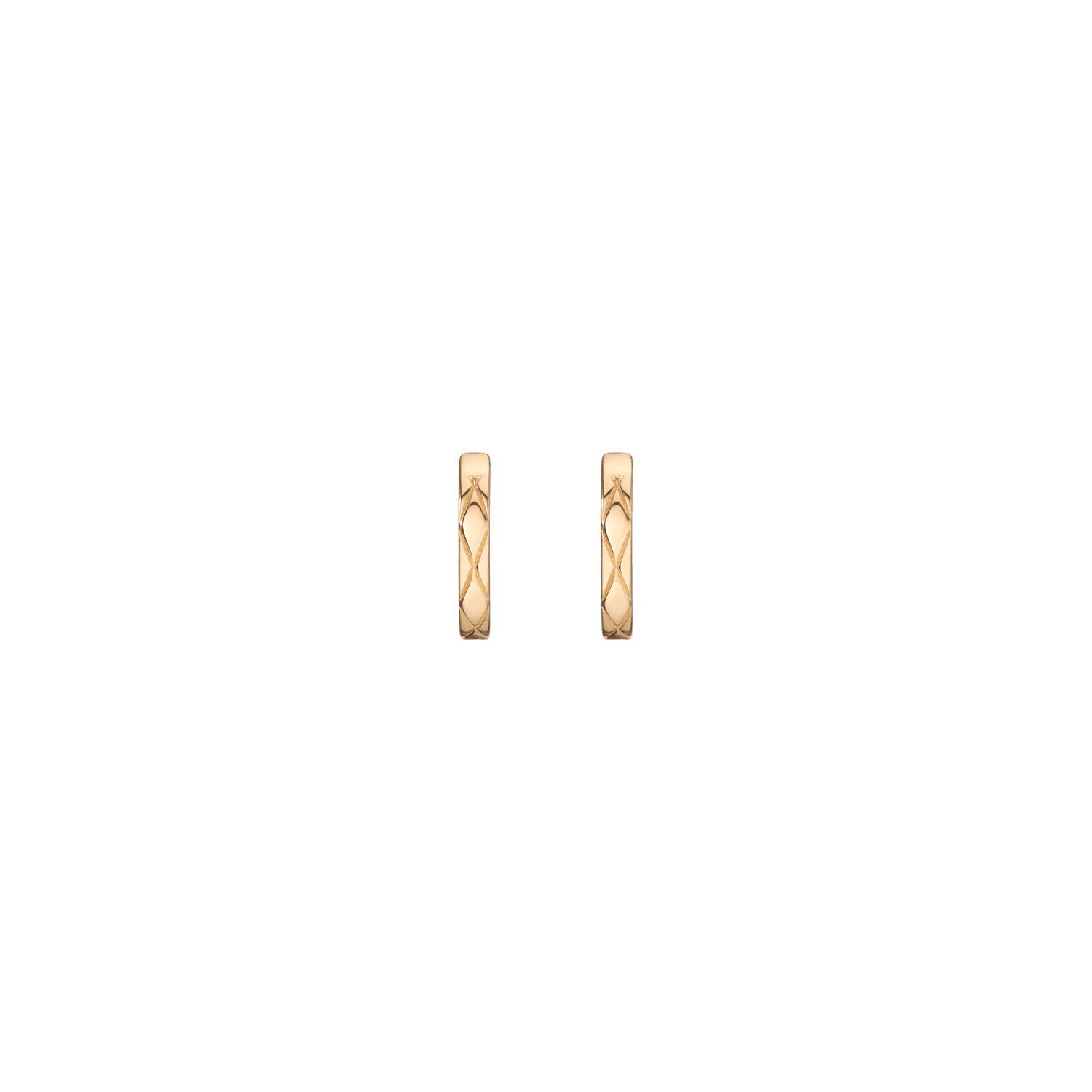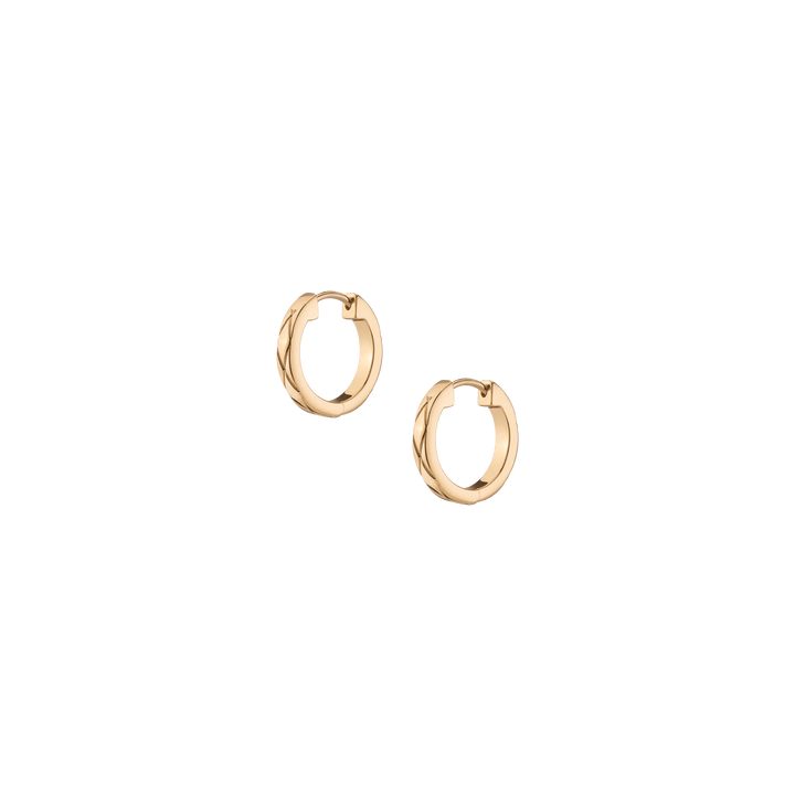 Handcrafted in high-quality vermeil with a flat X-pattern. 10mm hoop diameter, 2mm thick, 2g total weight. Hinged at the bottom with a secure click-in closure.