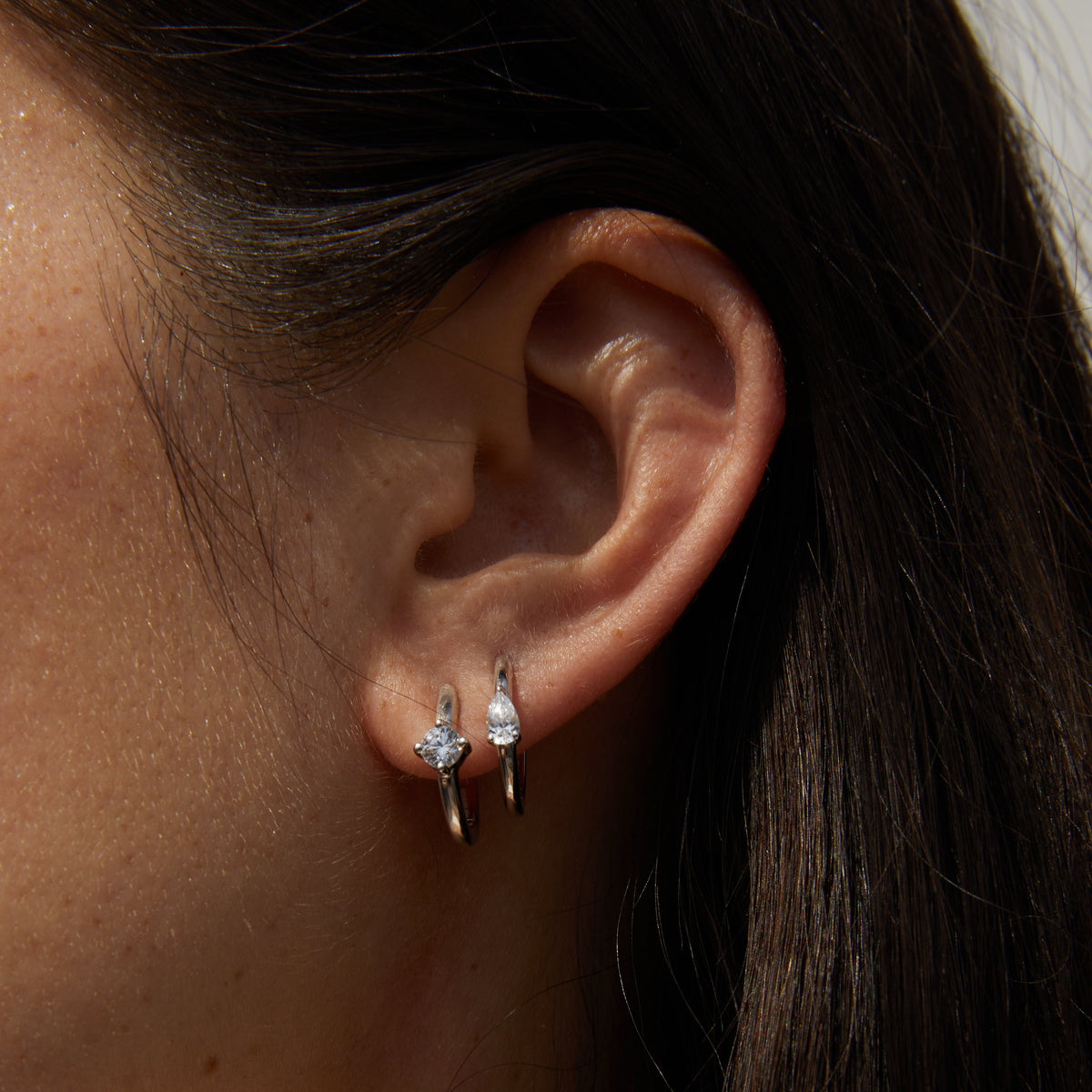 These Round Lab Grown Diamond Huggies by Aurate in silver bring playful charm and subtle sparkle to the everyday. Featuring prong-set emerald-cut lab grown diamonds, this hinged huggie design hugs the lobe with clean, modern lines. A dynamic duo for effortless polish.
