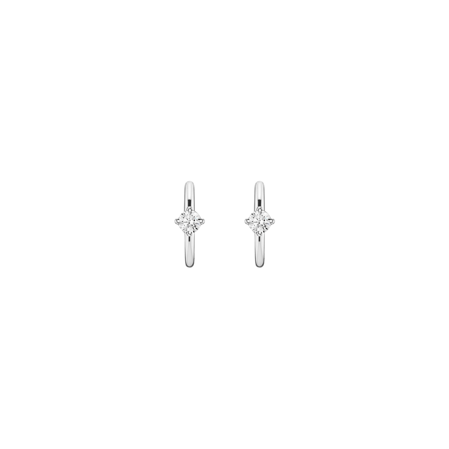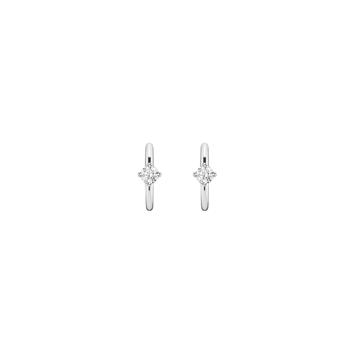 Crafted in sterling silver with SI2 clarity, F/G color emerald-cut lab grown diamonds (3.7mm). Internal diameter: 10mm. Thickness: 2mm. Weight: 1.25g. Hinged post mechanism.