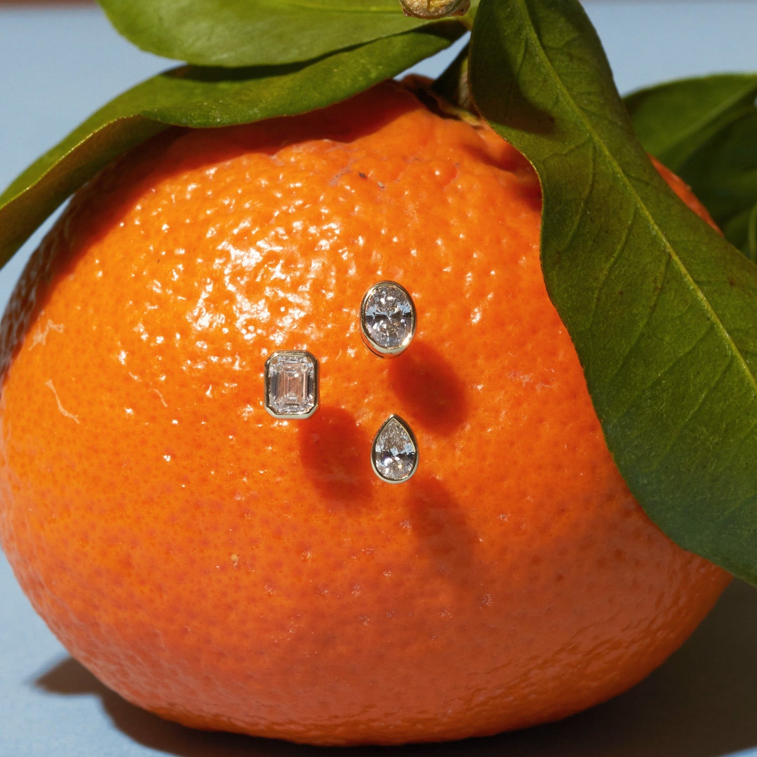 Crafted in 18k gold with two 4x3mm brilliant cut lab-grown diamonds (0.4tcw). Bezel setting. Secured with post and wing nut backings.