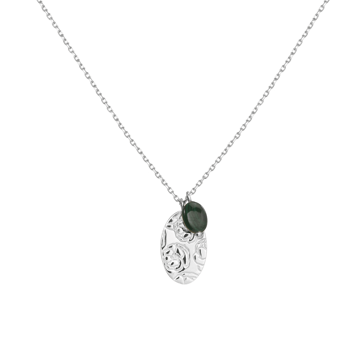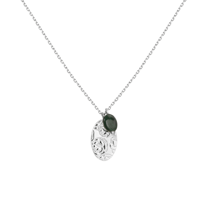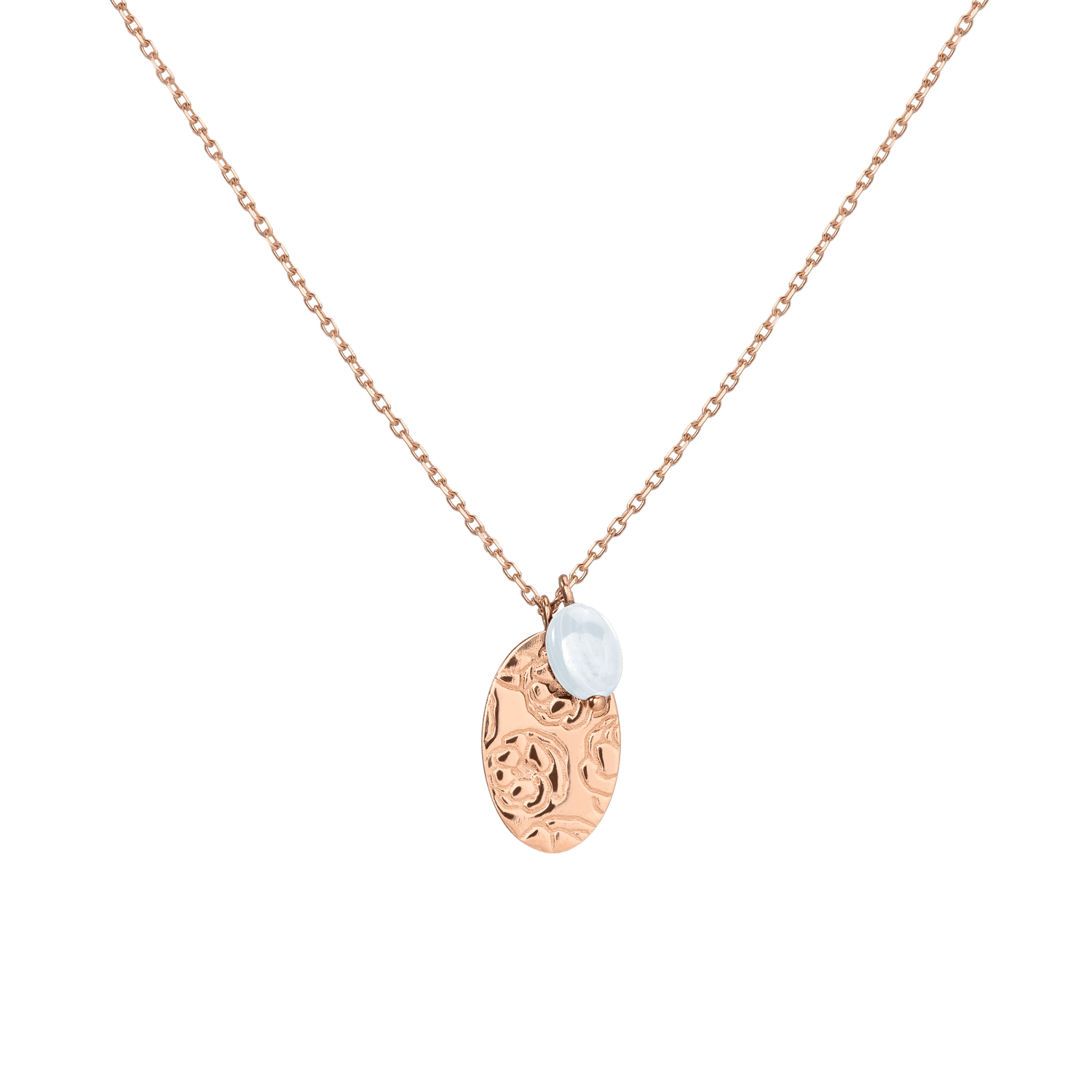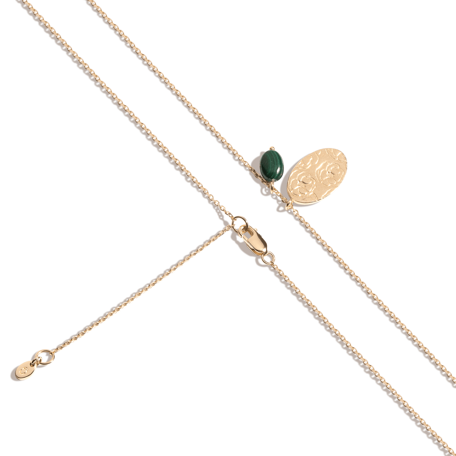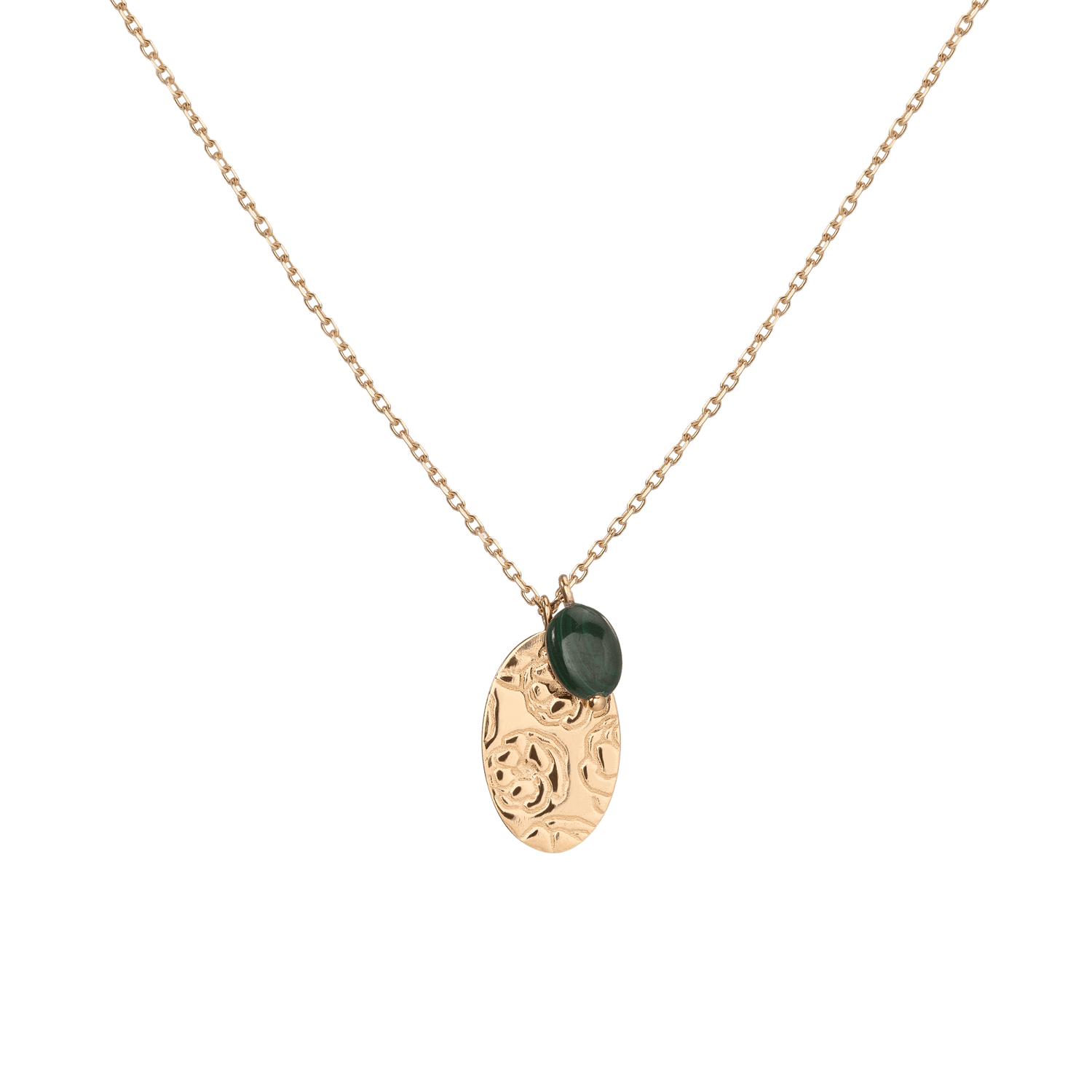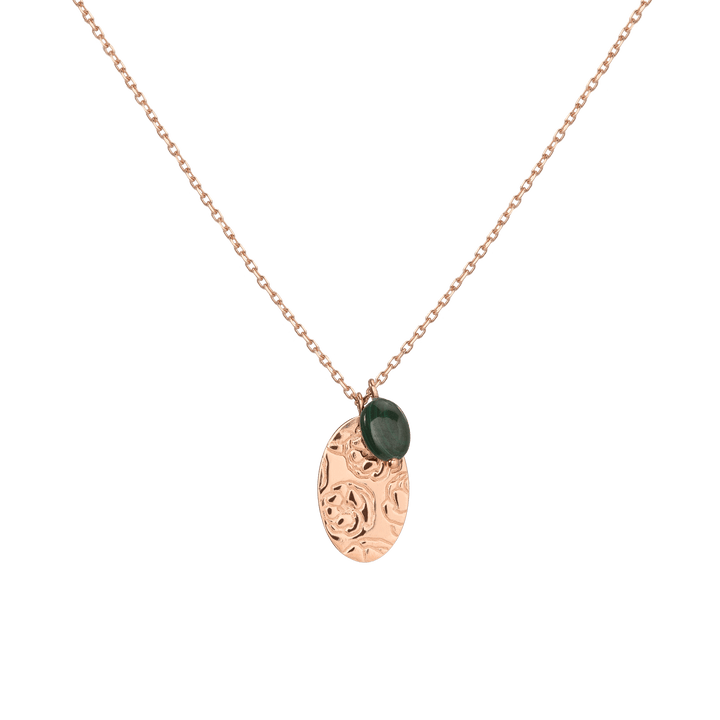 Crafted in gold vermeil with a 15x10mm high-polished pendant. Debossed rose motif with choice of 7x4mm oval White Opal or Green Malachite accent. Thickness: 1mm, Weight: 3g.