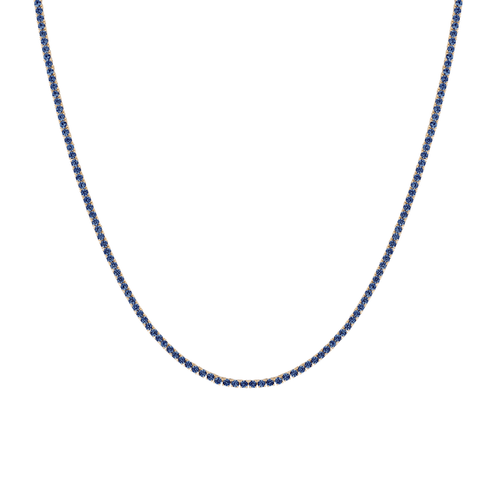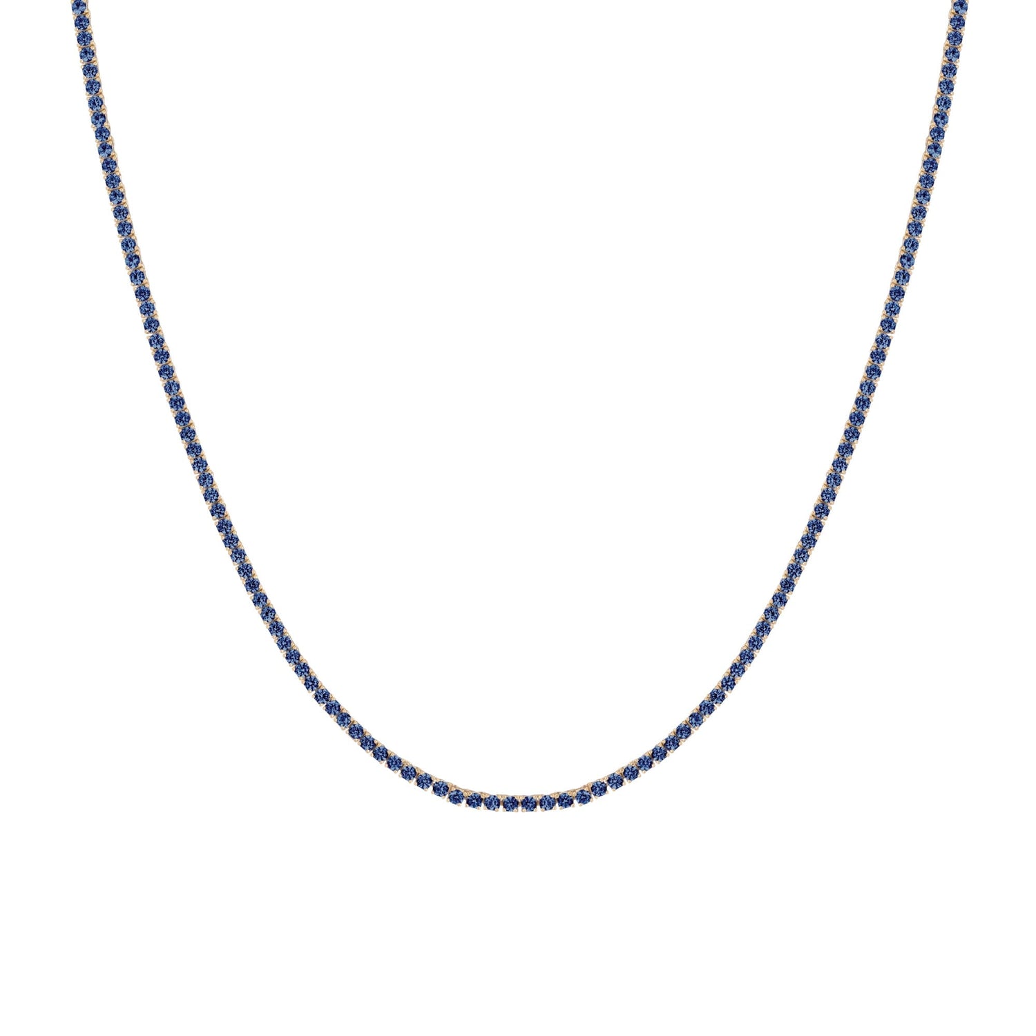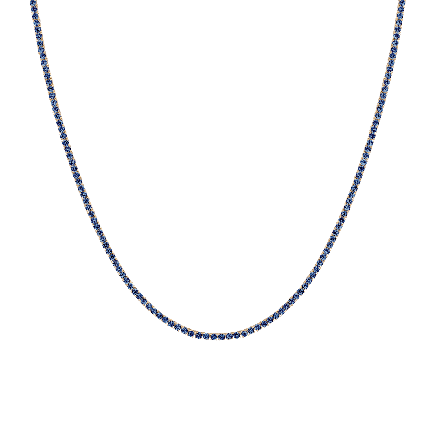 Crafted in gold vermeil with AAA quality round lab-grown Blue Sapphires (2.6mm / 0.07ct each), totaling approximately 7tcw. Length: 16', Width: 2.8mm, Thickness: 3mm, Weight: 20g. Features box clasp and safety hook.
