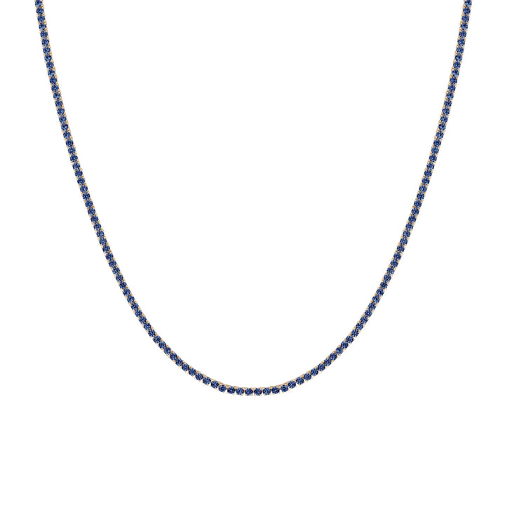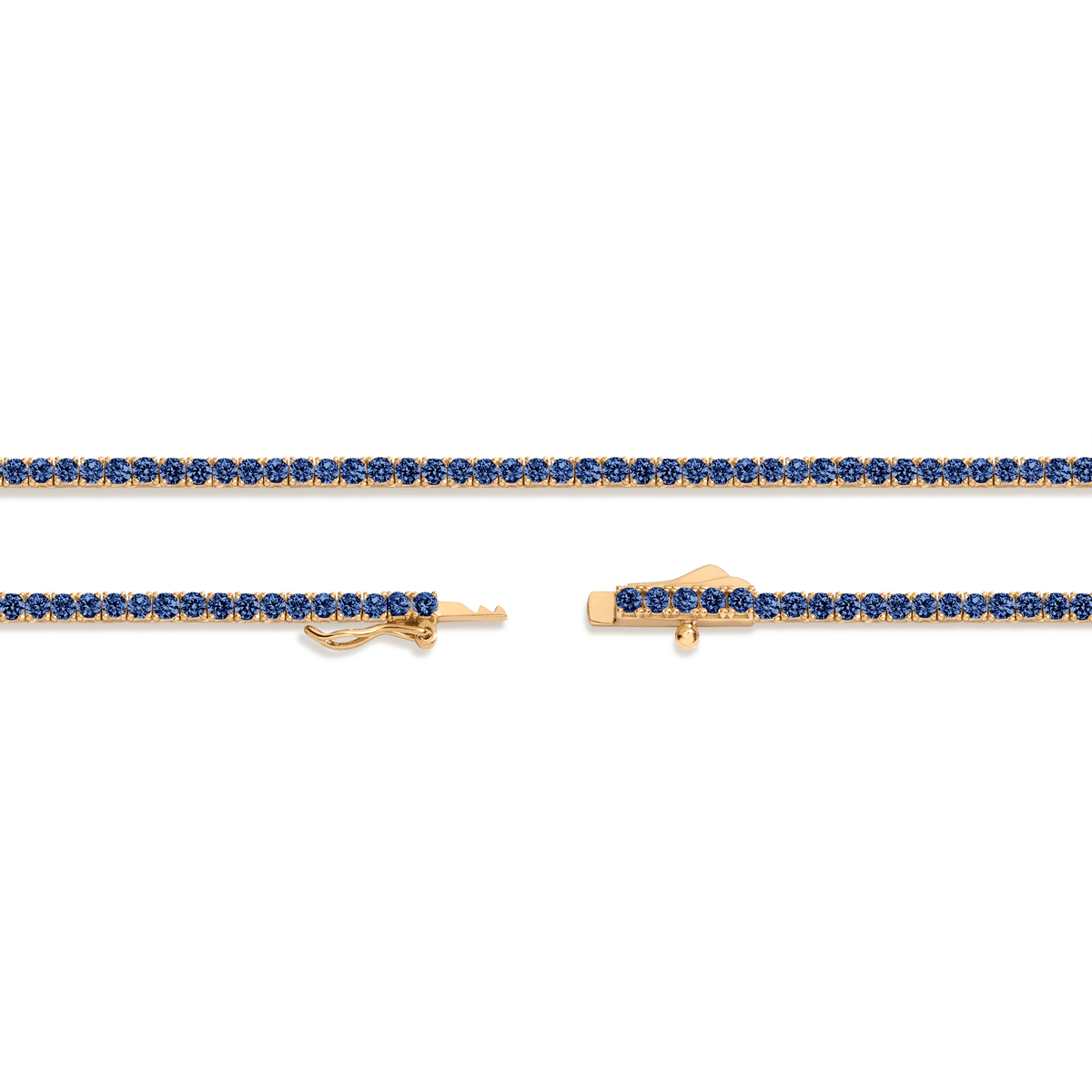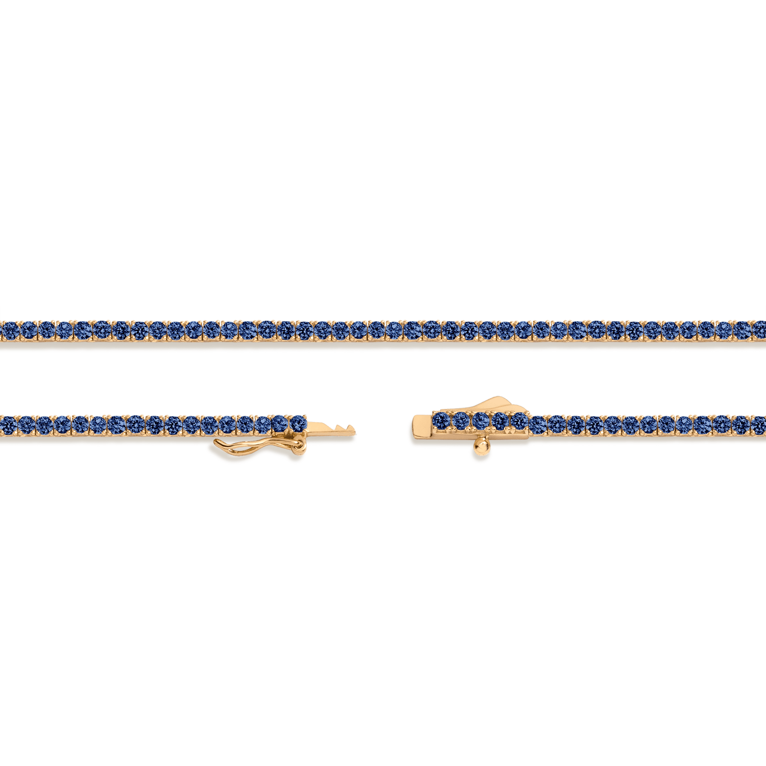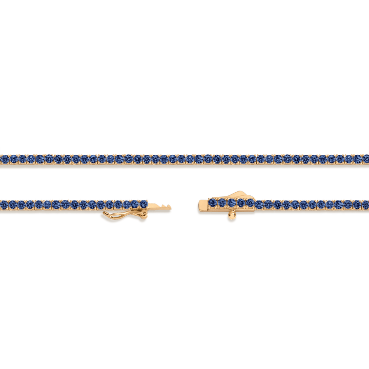 Crafted in gold vermeil with AAA quality round lab-grown Blue Sapphires (2.6mm / 0.07ct each), totaling approximately 7tcw. Length: 16', Width: 2.8mm, Thickness: 3mm, Weight: 20g. Features box clasp and safety hook.