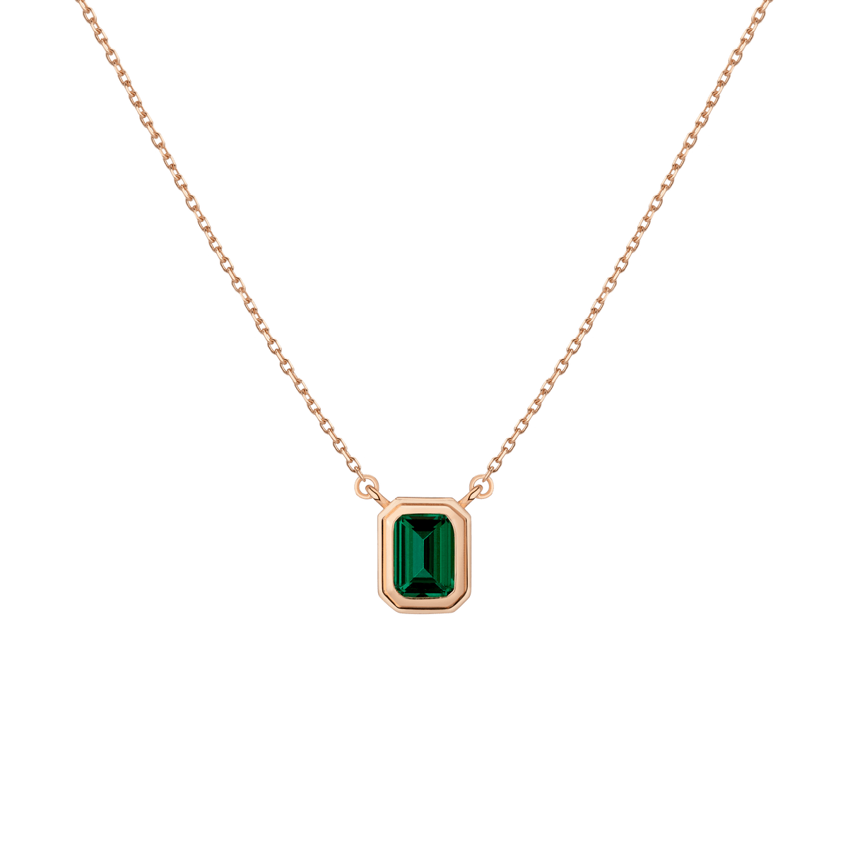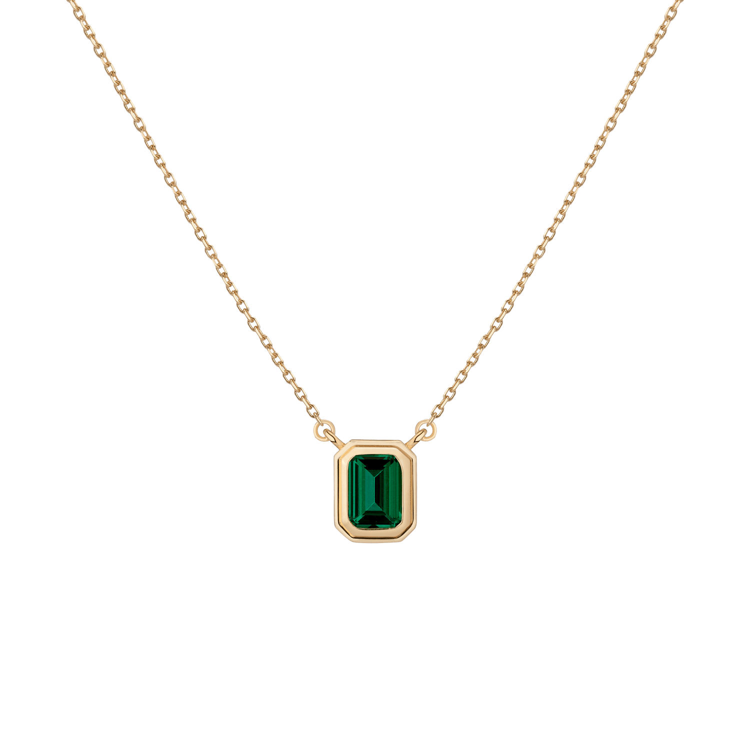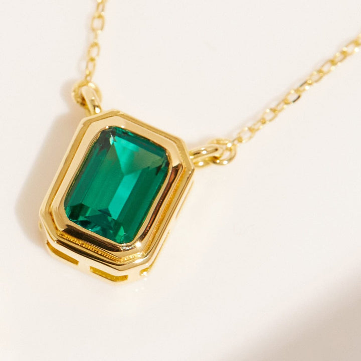 Crafted in gold vermeil with a 7x5mm AAA quality lab-grown emerald. Pendant width: 7.85x9.8mm. Thickness: 3.84mm. Chain: diamond-cut cable, 18' with a jump ring at 15'. Weight: 2.1g.