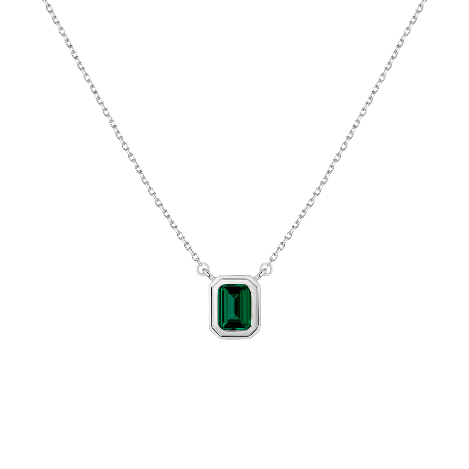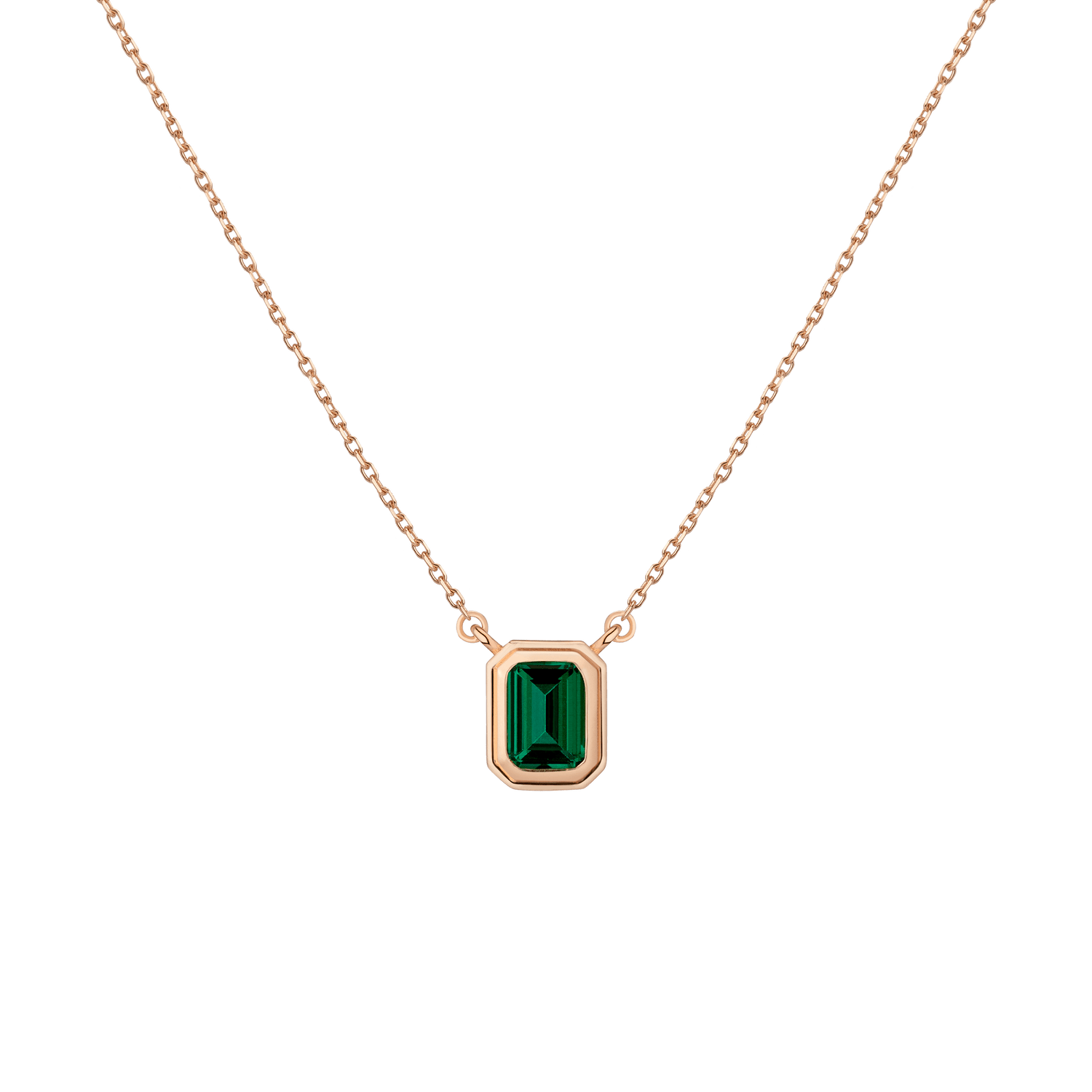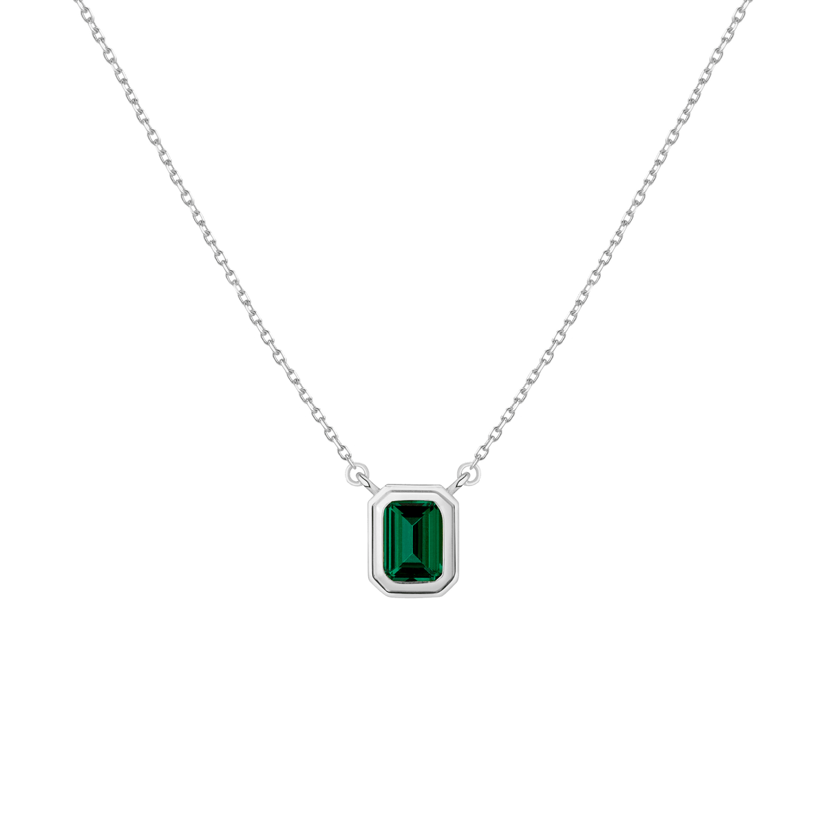 Crafted in gold vermeil with a 7x5mm AAA quality lab-grown emerald. Pendant width: 7.85x9.8mm. Thickness: 3.84mm. Chain: diamond-cut cable, 18' with a jump ring at 15'. Weight: 2.1g.