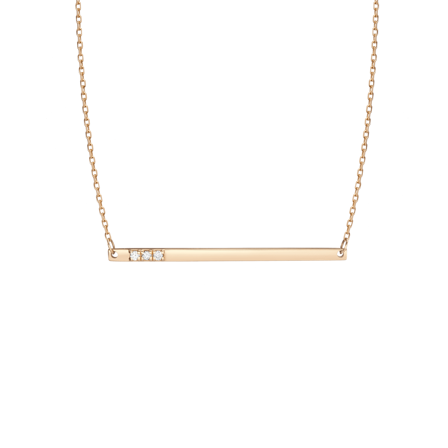 Handcrafted in 18-karat gold with three round brilliant SI clarity diamonds (0.01 carat each, 1.4mm). The bar measures 34.7mm x 1.9mm x 1.3mm, total weight 2.3g. Comes with an 18'' chain, extra jump ring at 15'', secured by a spring ring clasp.
