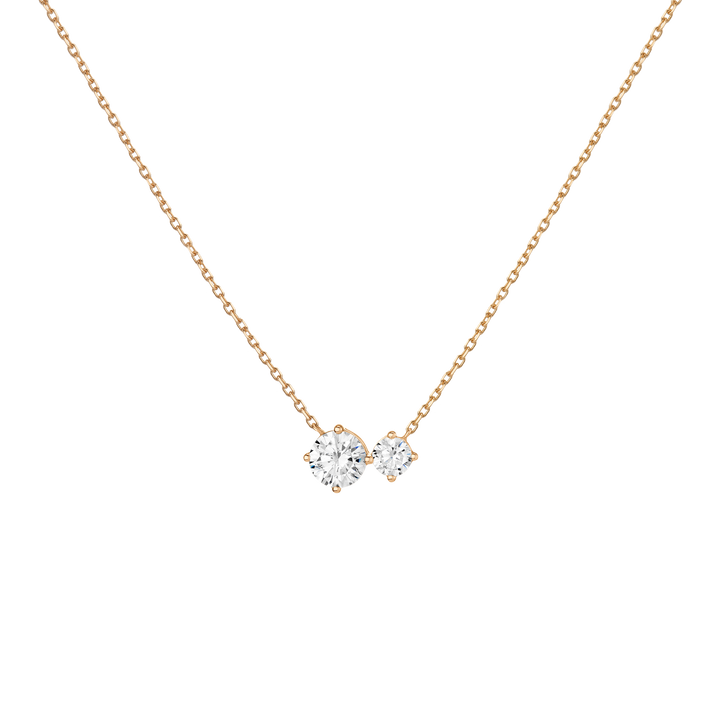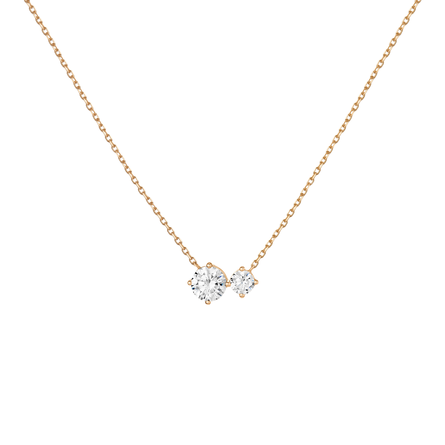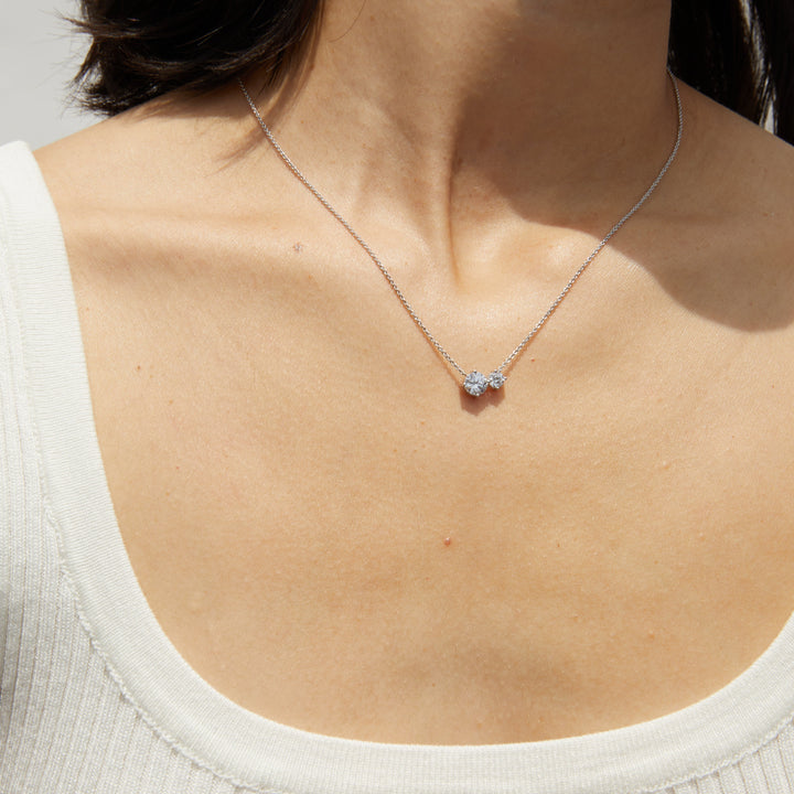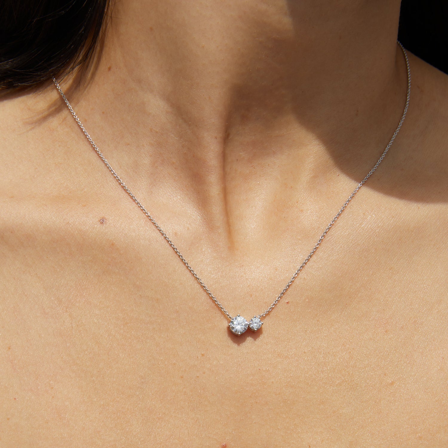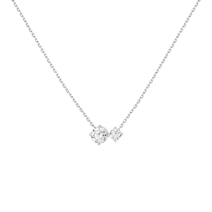This Lab Grown Diamond Duo Necklace by Aurate in Silver is a playful yet polished design featuring two prong-set mismatched diamonds. Delicately suspended on an 18'' sterling silver chain, this asymmetrical pair captures modern contrast and balance in one refined statement.