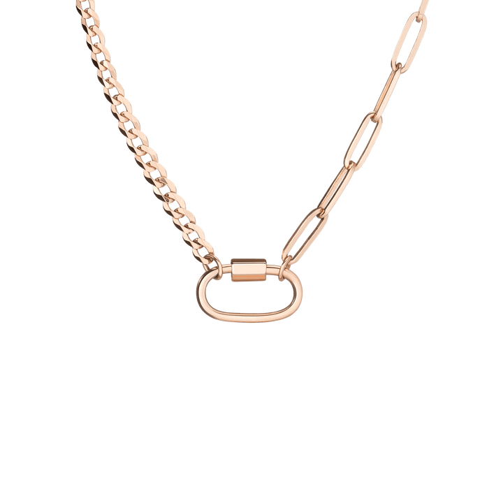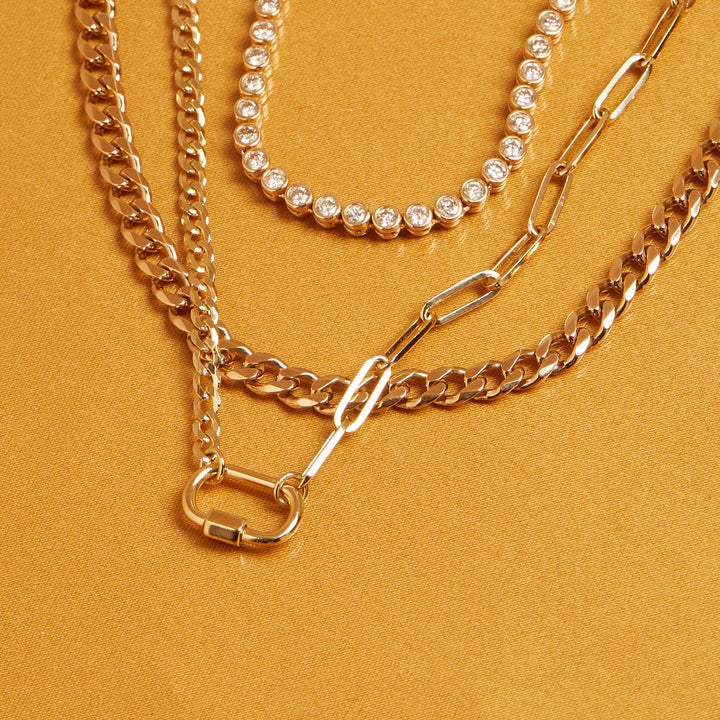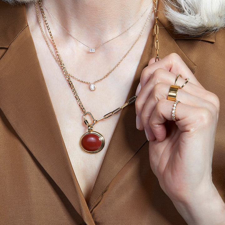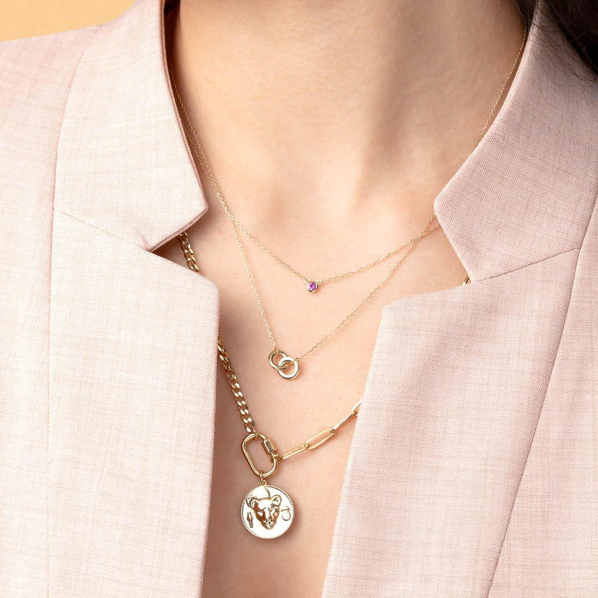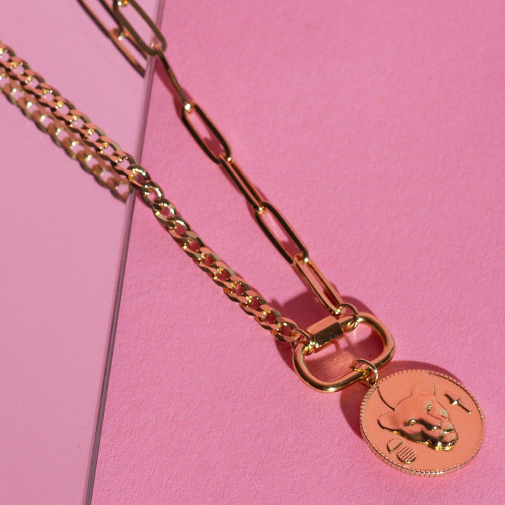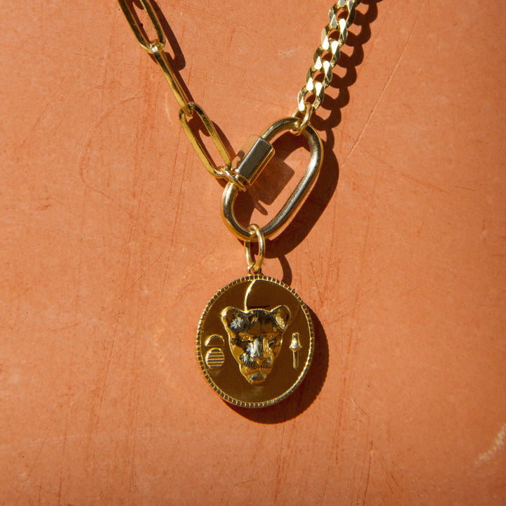 This AURATE X KERRY: Lioness Pendant by Aurate merges strength and elegance in a bold collaboration piece. Two distinct gold chains—the Large Chain and Curb Chain—unite to symbolize empowerment and harmony. At the heart of the Lioness Collection, this mixed-link necklace makes a statement on its own or layered. With a striking link-lock carabiner closure, it's a modern icon for those who wear their power with style.