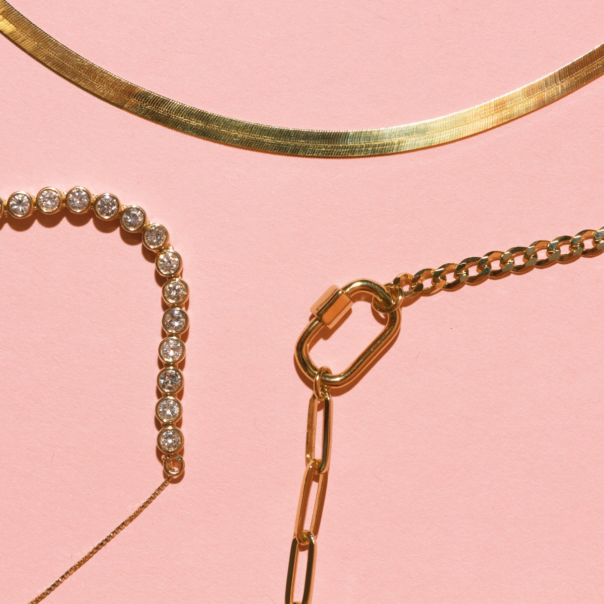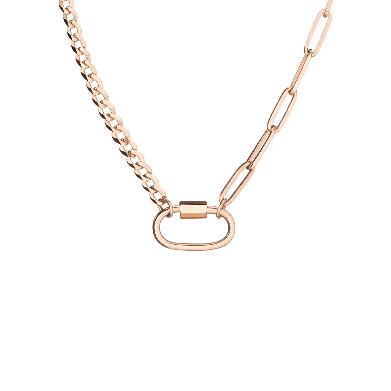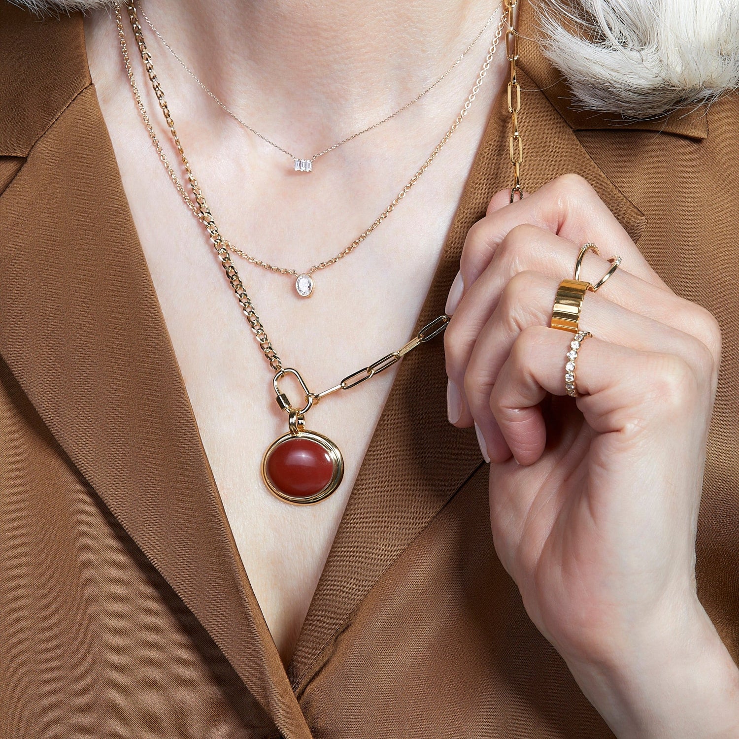 This AURATE X KERRY: Lioness Pendant by Aurate merges strength and elegance in a bold collaboration piece. Two distinct gold chains—the Large Chain and Curb Chain—unite to symbolize empowerment and harmony. At the heart of the Lioness Collection, this mixed-link necklace makes a statement on its own or layered. With a striking link-lock carabiner closure, it's a modern icon for those who wear their power with style.