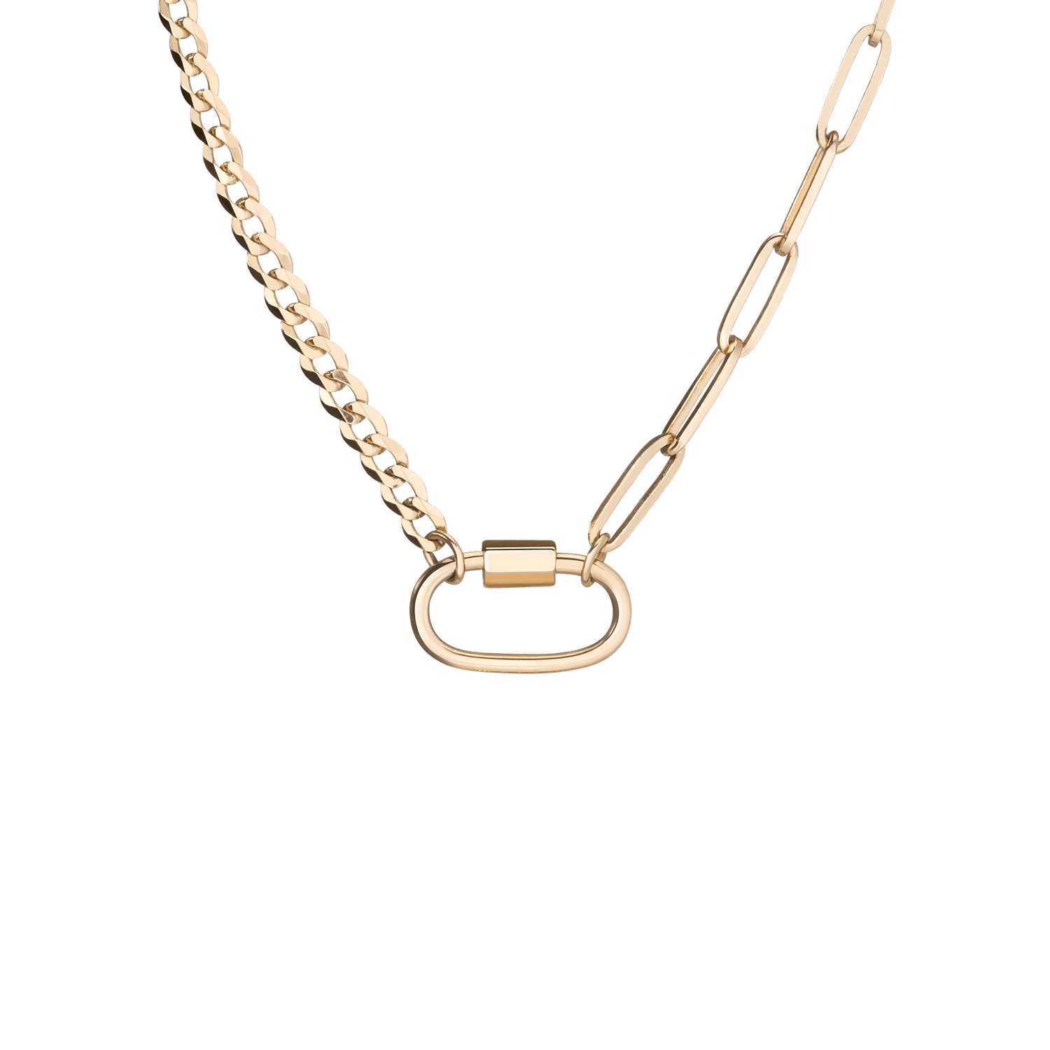 Handcrafted in high-quality vermeil with combined large and curb chains. Secured with link-lock carabiner and lobster clasp. Total length: 20.5'; width: 3.5mm; thickness: 6.5mm; weight: 10.2g. Link-lock dimensions: 16x11mm.