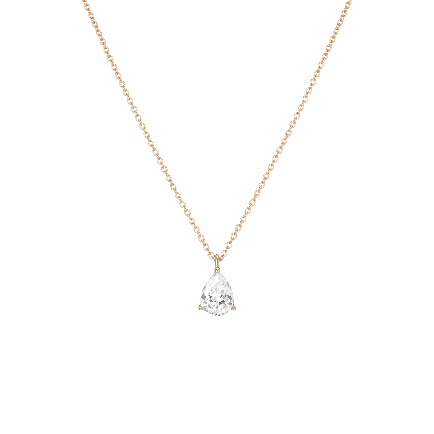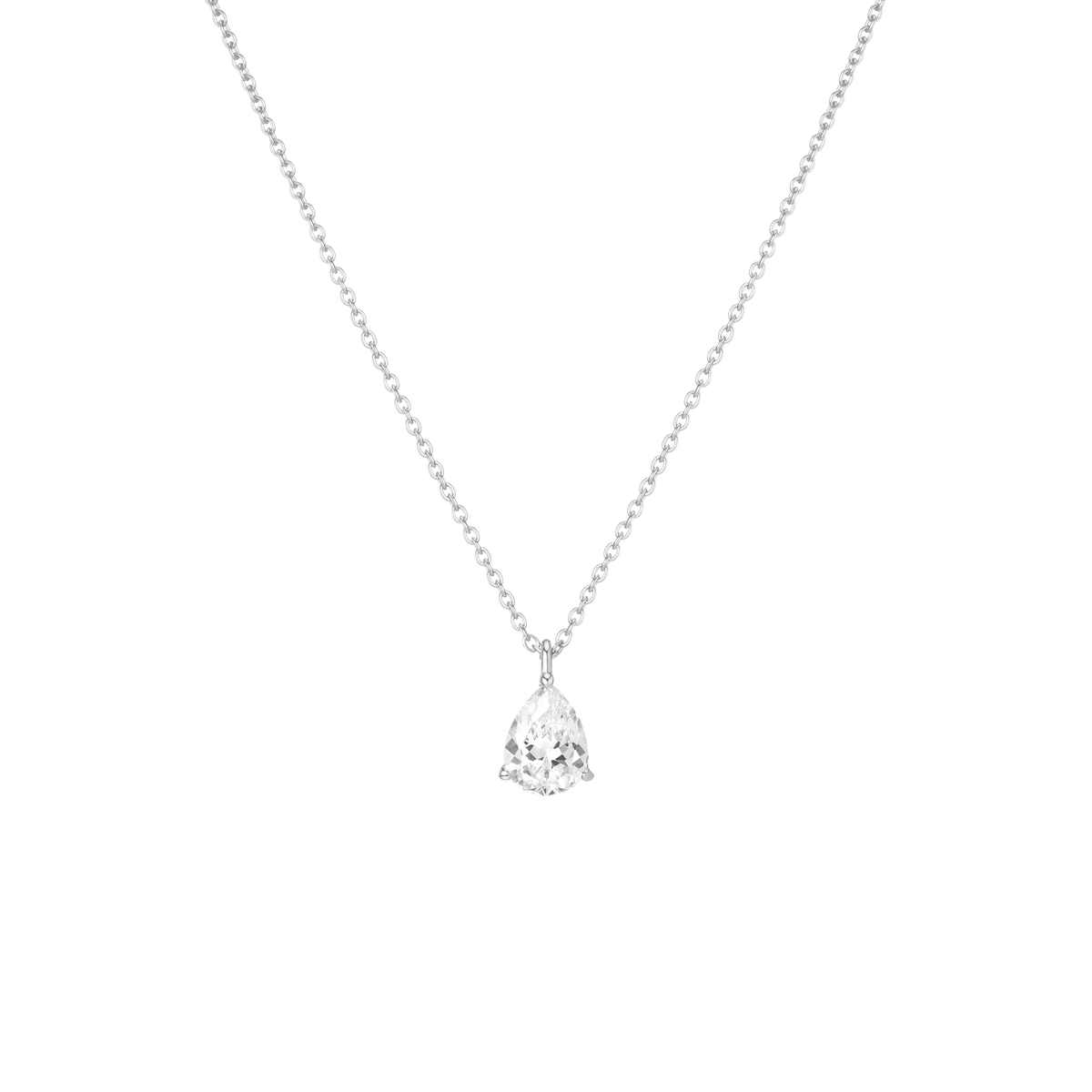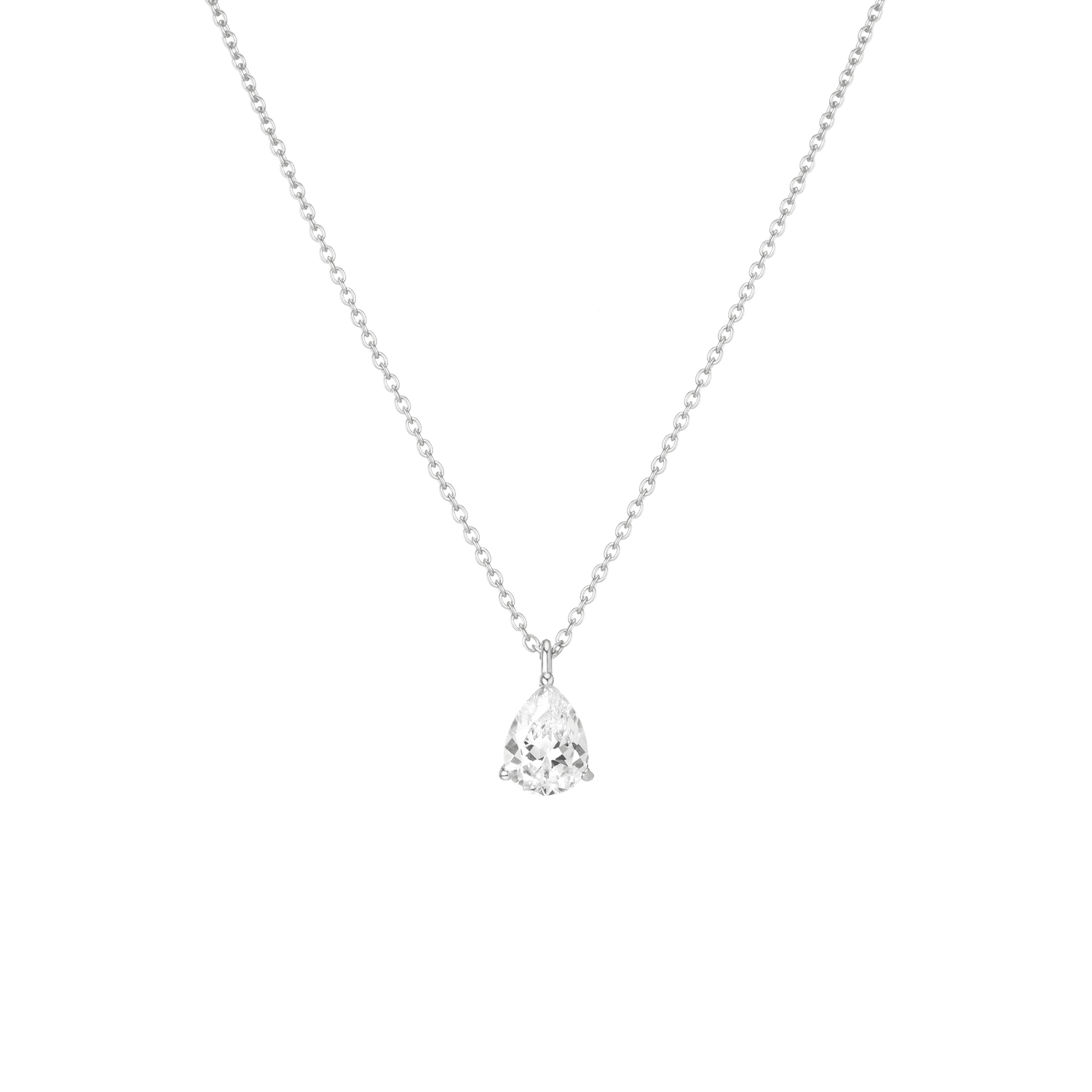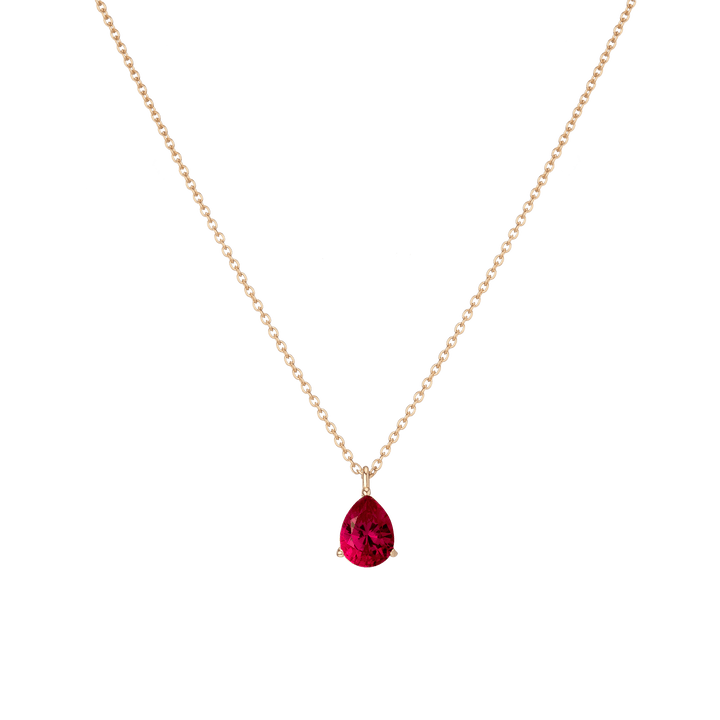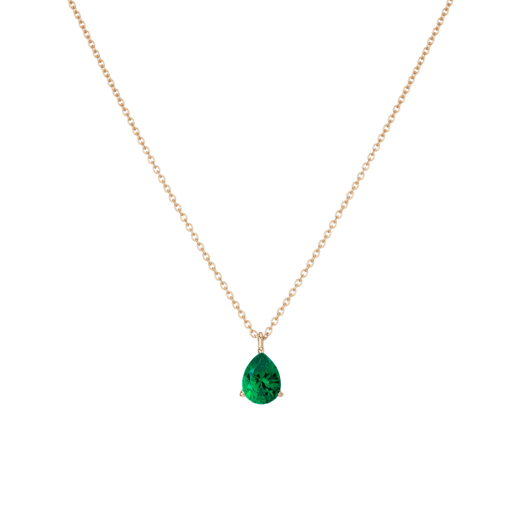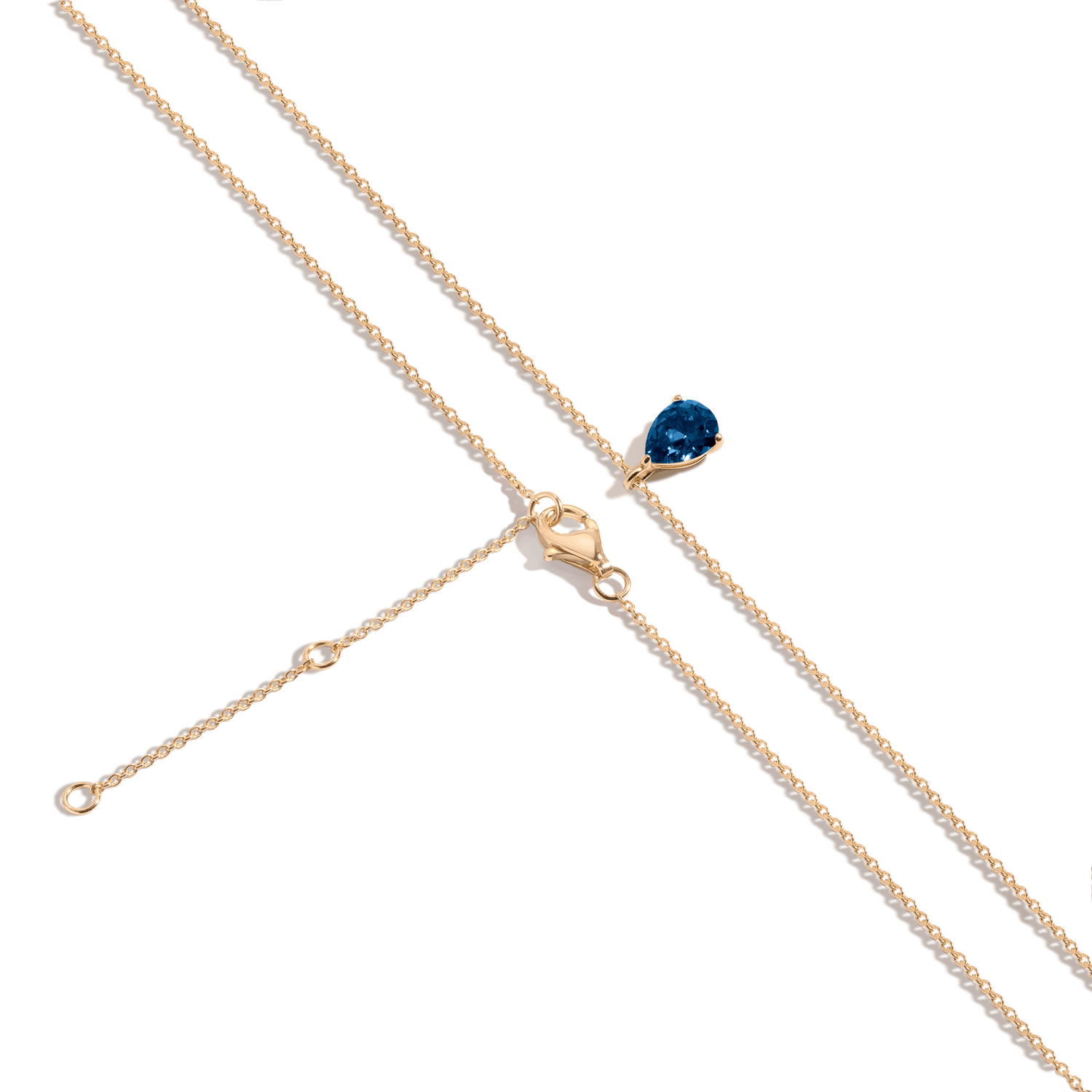 Prong set in gold vermeil with a 9x6mm (2ct) pear-cut AAA quality created White Sapphire, Emerald, Ruby, Blue Sapphire, or Aquamarine. Chain: 18' with 3 size adjustments. Lobster clasp. Thickness: 5mm, Weight: 2.5g.