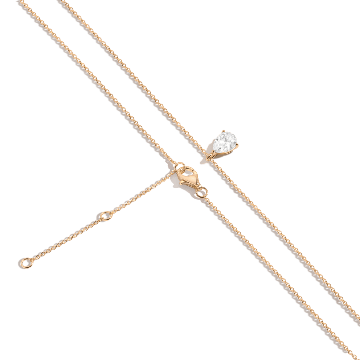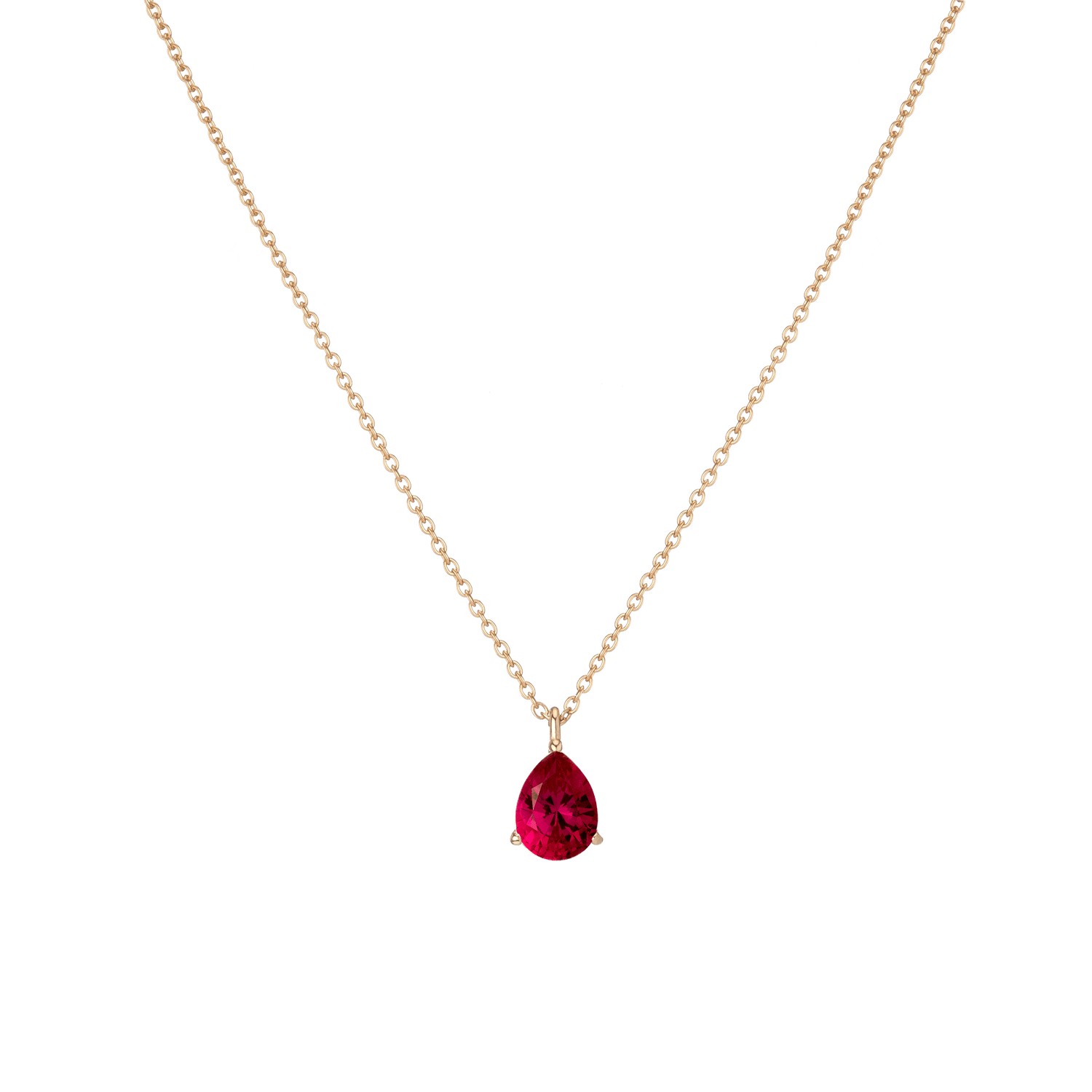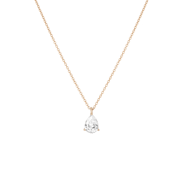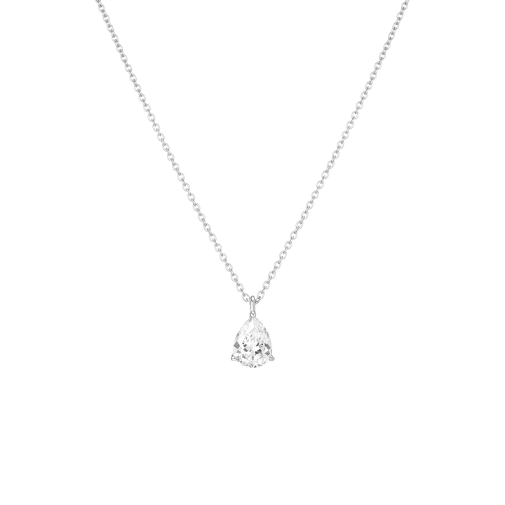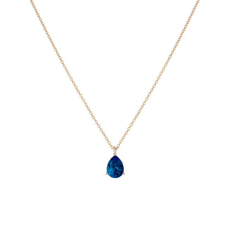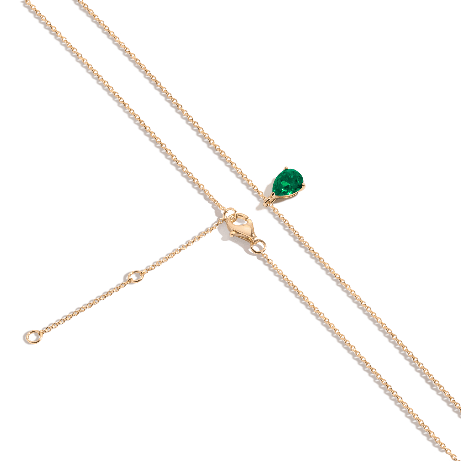 Prong set in gold vermeil with a 9x6mm (2ct) pear-cut AAA quality created White Sapphire, Emerald, Ruby, Blue Sapphire, or Aquamarine. Chain: 18' with 3 size adjustments. Lobster clasp. Thickness: 5mm, Weight: 2.5g.