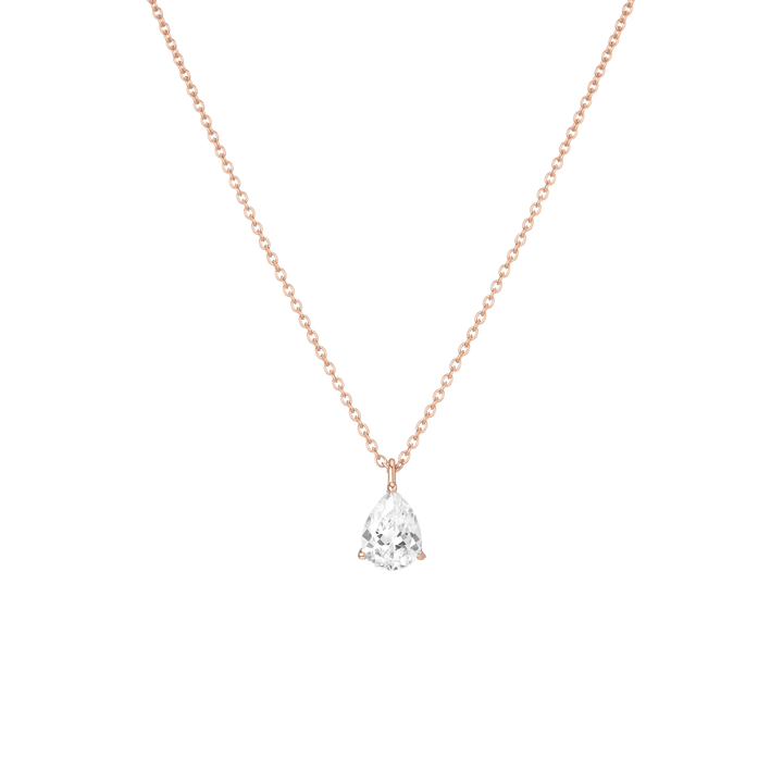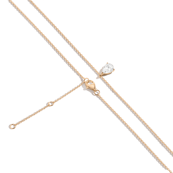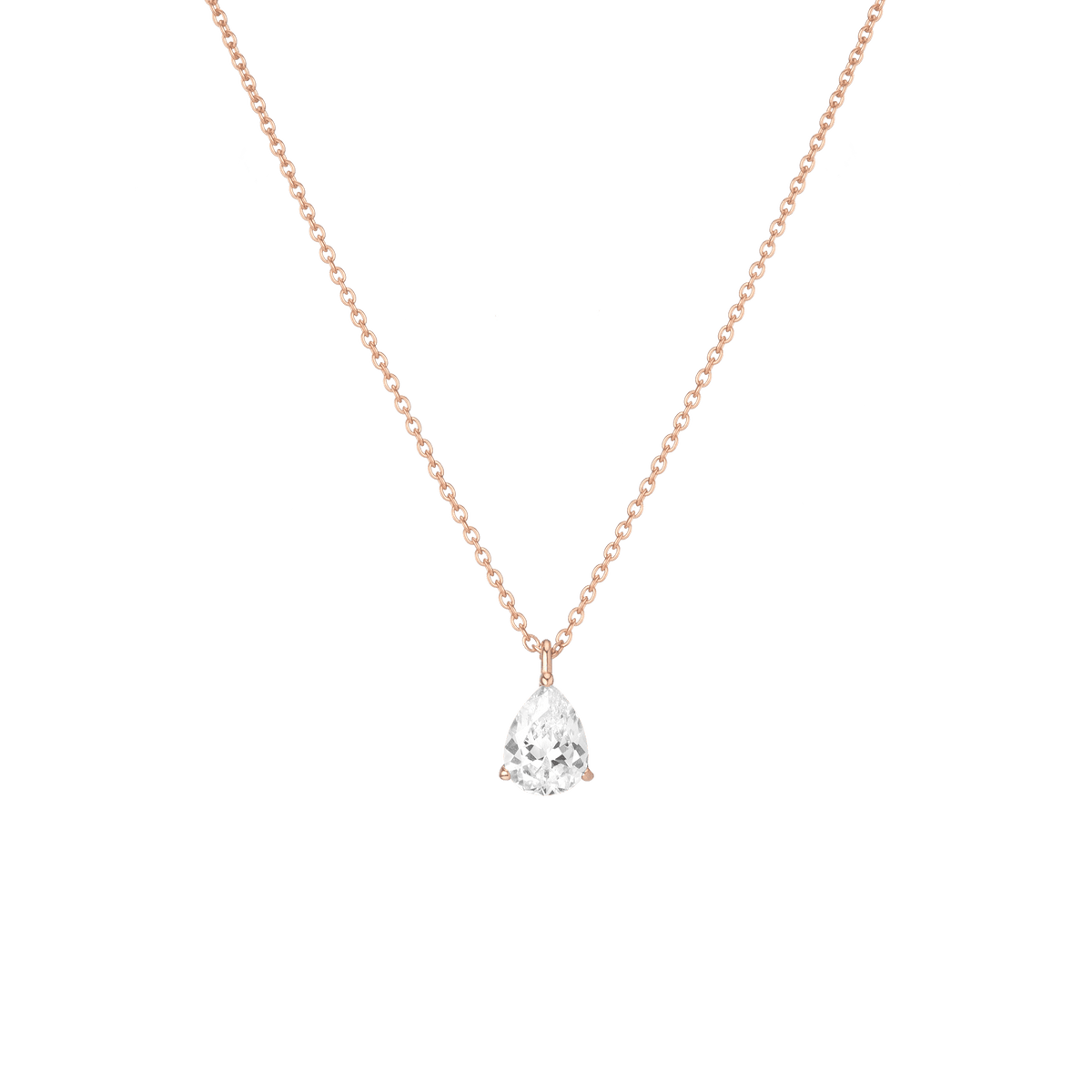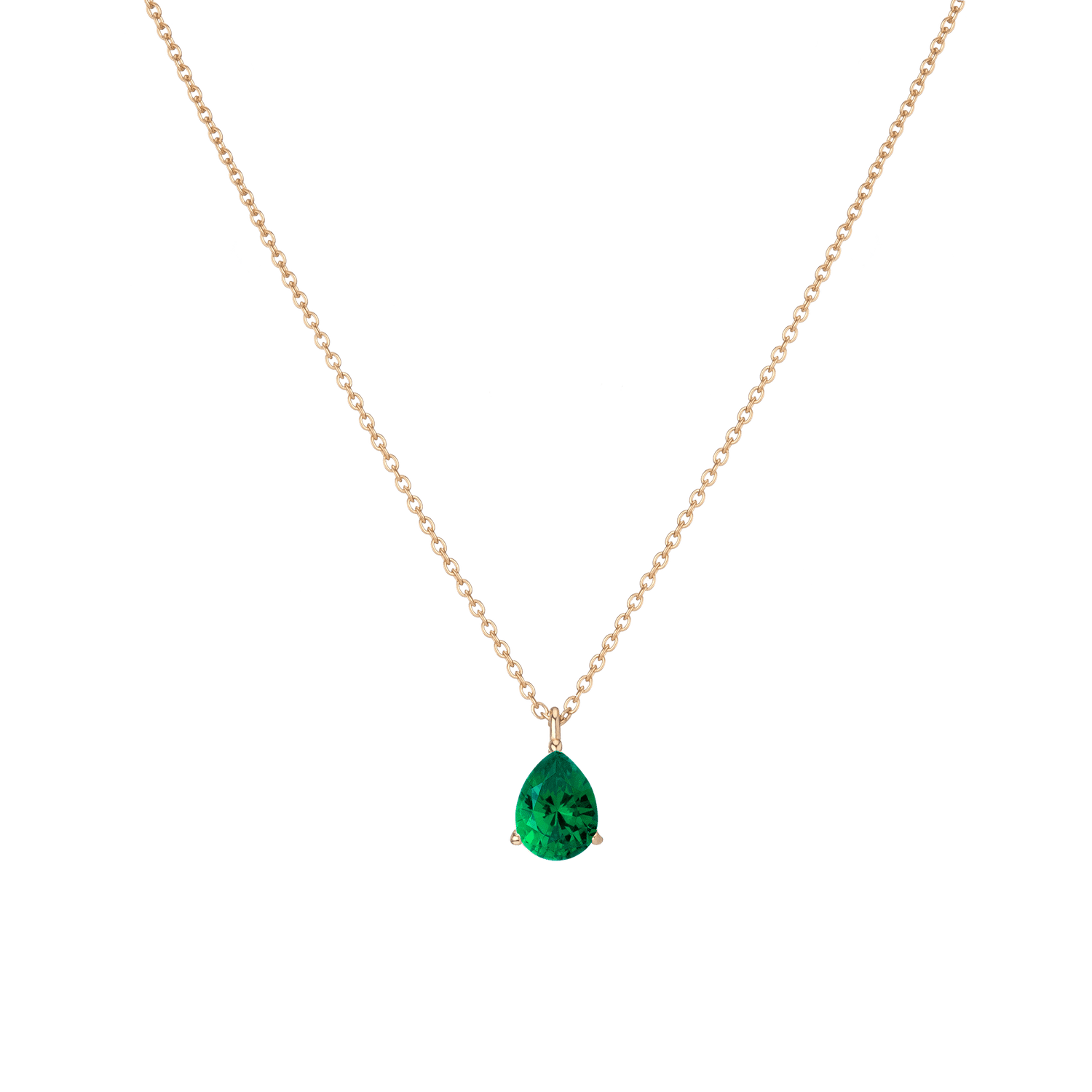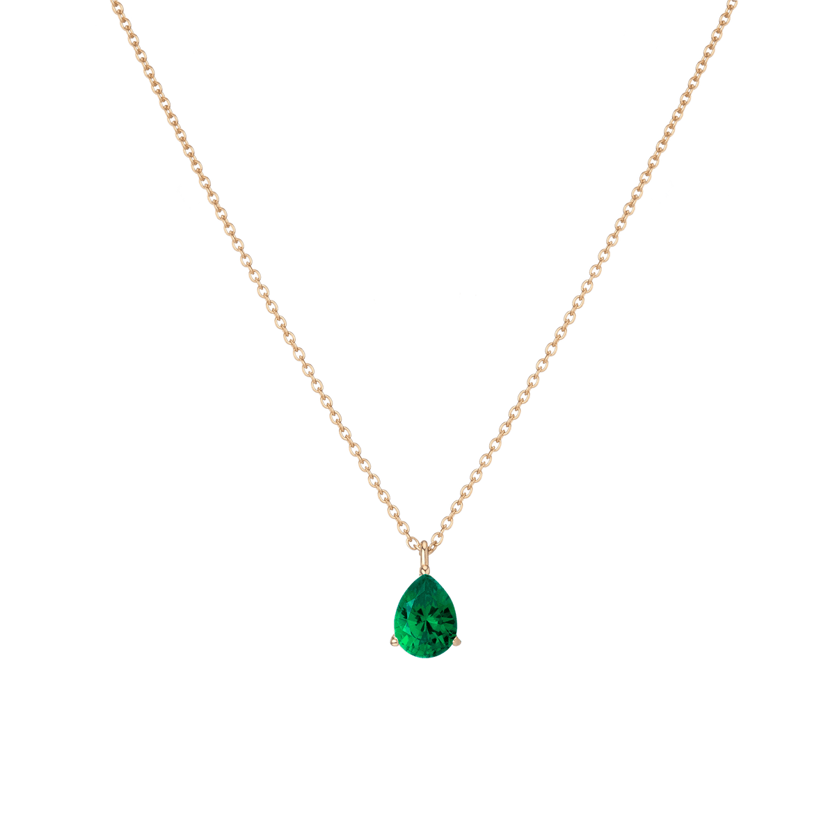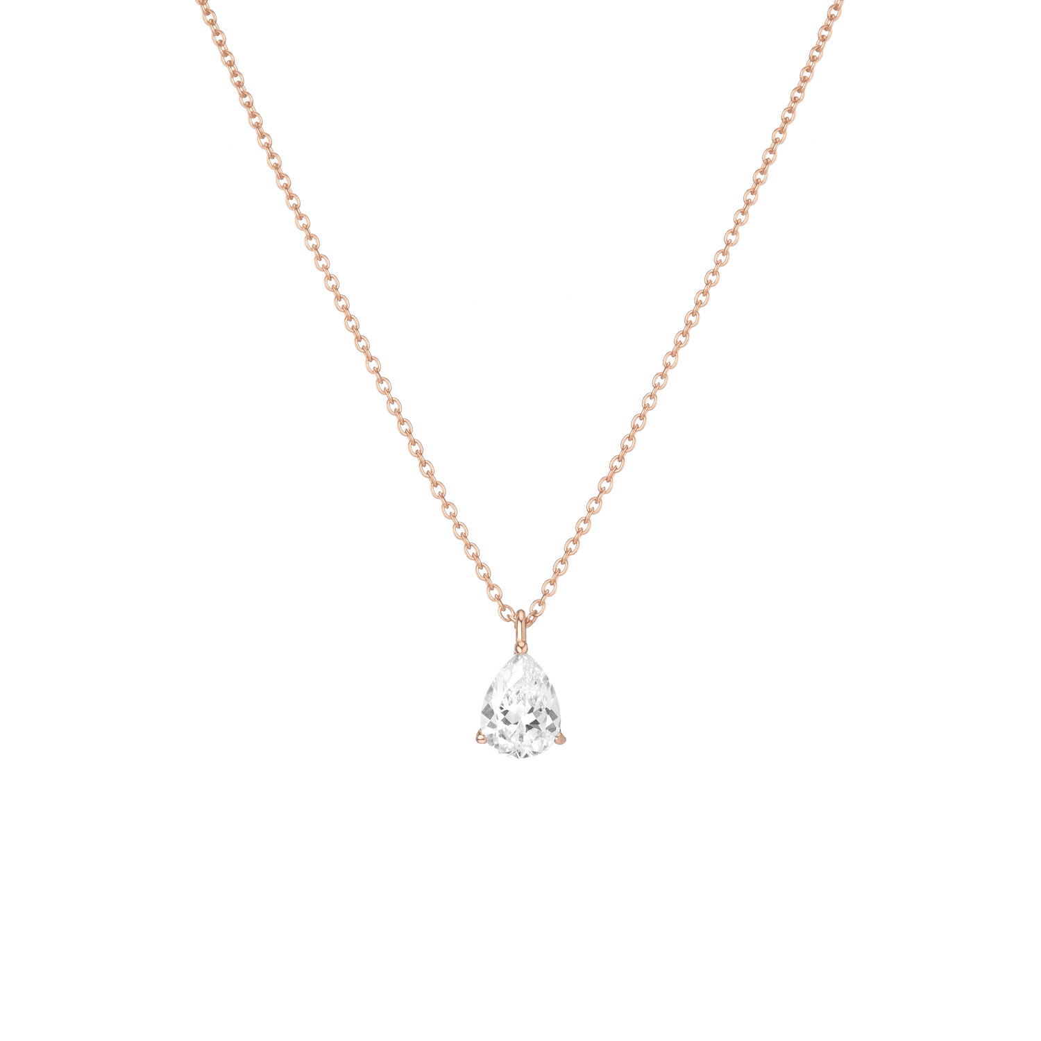 Prong set in gold vermeil with a 9x6mm (2ct) pear-cut AAA quality created White Sapphire, Emerald, Ruby, Blue Sapphire, or Aquamarine. Chain: 18' with 3 size adjustments. Lobster clasp. Thickness: 5mm, Weight: 2.5g.
