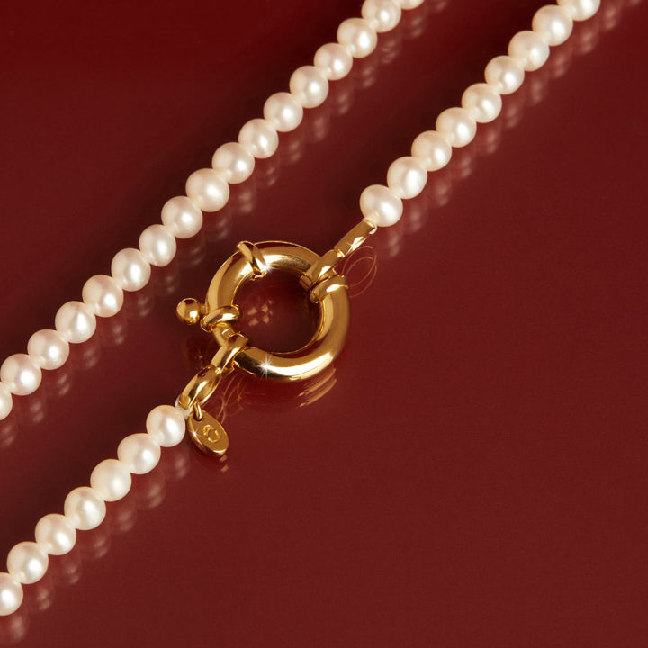 Hand-strung in gold vermeil with 4mm freshwater cultured pearls. Available in 16.5'' and 18'' lengths. Weight: 14g. Secured with oversized spring ring clasp.