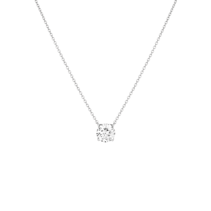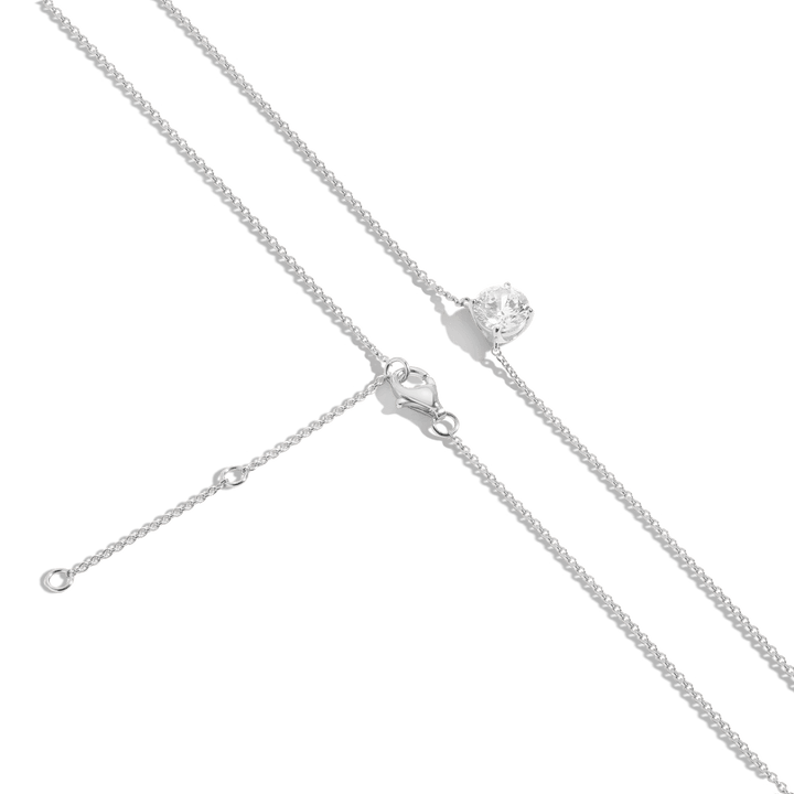 Prong set in vermeil with an 8mm (2ct) round-cut AAA quality created White Sapphire, Emerald, Ruby, Blue Sapphire, or Aquamarine. Chain is 18' with three adjustment sizes and a lobster clasp. Width: 8mm, Thickness: 5mm, Weight: 2.5g.