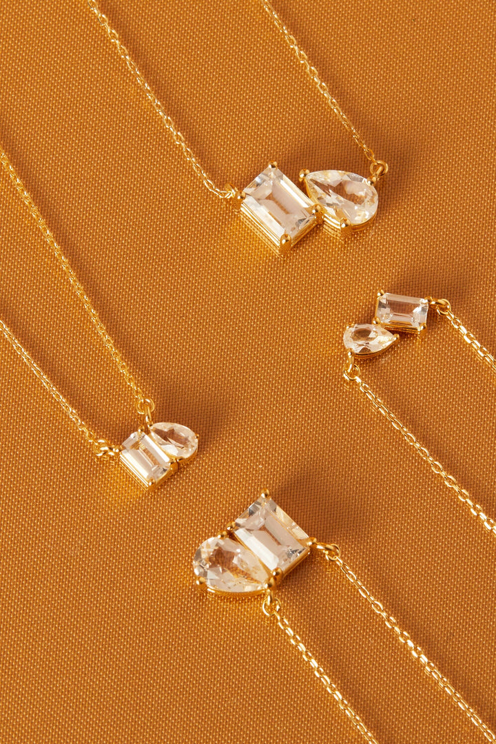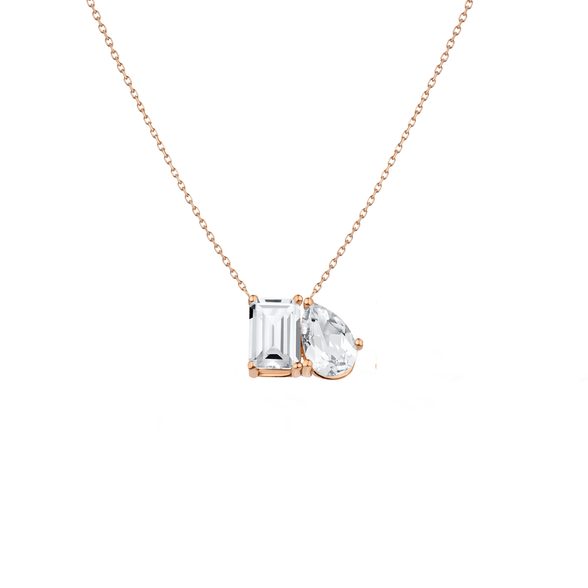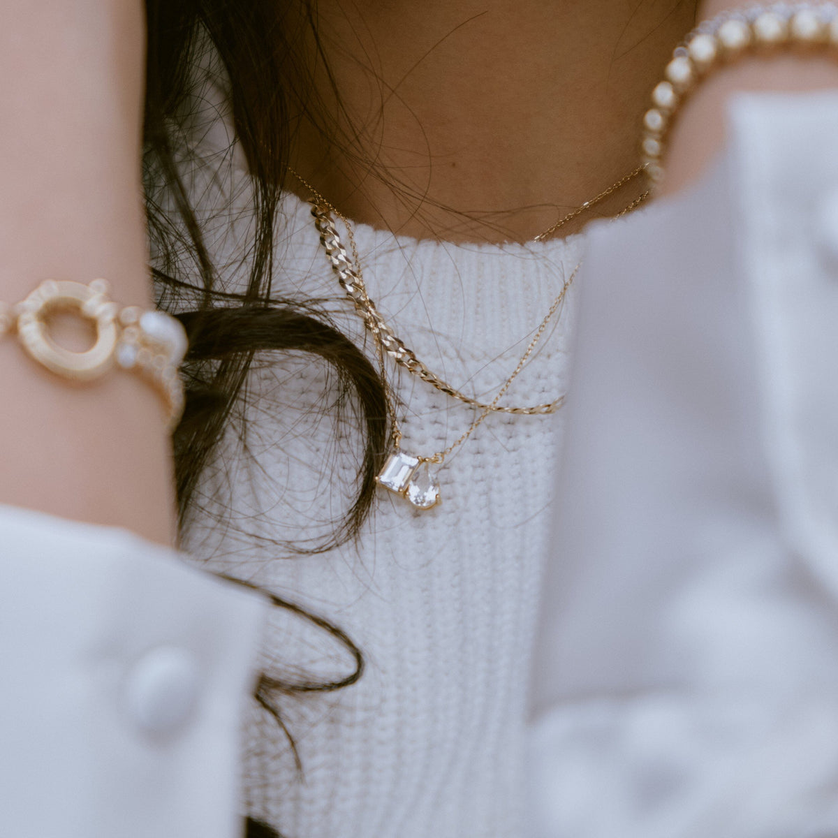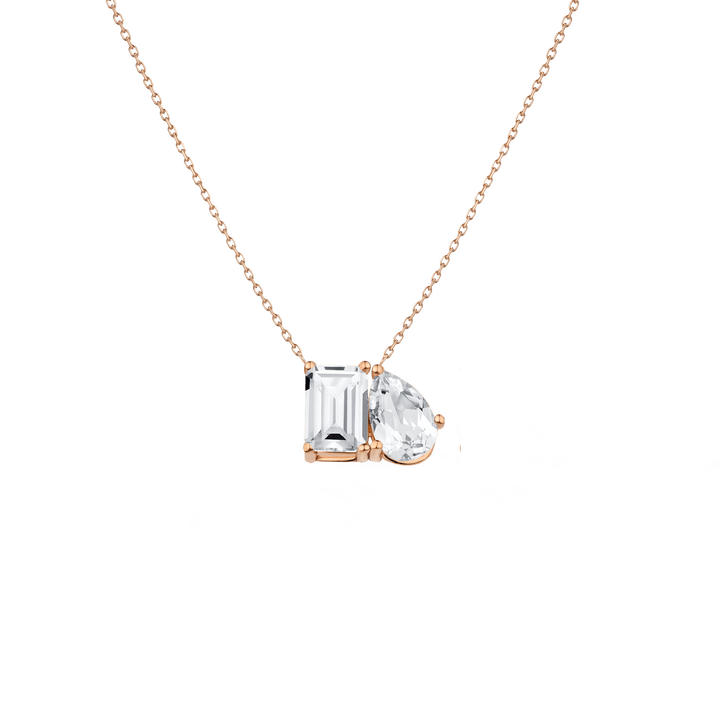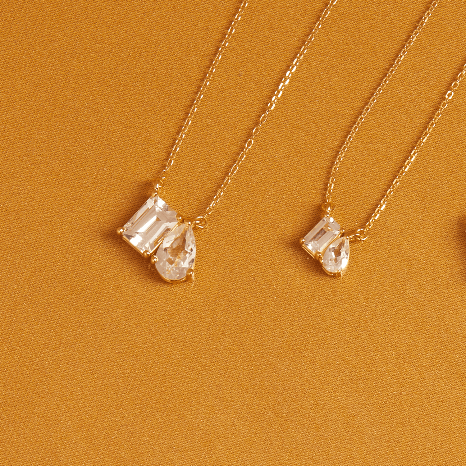 Handcrafted in 18k gold with 8x5mm pear and 7x5mm emerald-cut gemstones (1ct each). 18' chain with jump ring at 15.5'. Pendant: 8mm wide, 11mm long, 3.3mm thick. Total weight: 5.75g. Stones are lab-grown or natural.