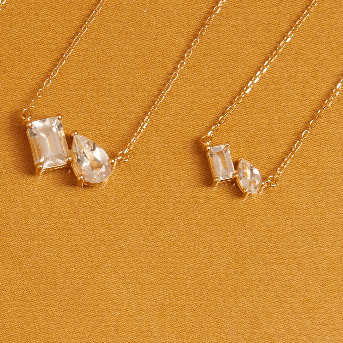 Crafted in gold vermeil with a 5x3mm pear-cut gemstone (0.29ct) and a 5x3mm emerald-cut gemstone (0.29ct). Pendant size: 7mm x 10mm. Thickness: 4.4mm. Chain: 18' with jump ring at 15.5'. Weight: 3.5g. Includes both lab-grown and natural gemstones.