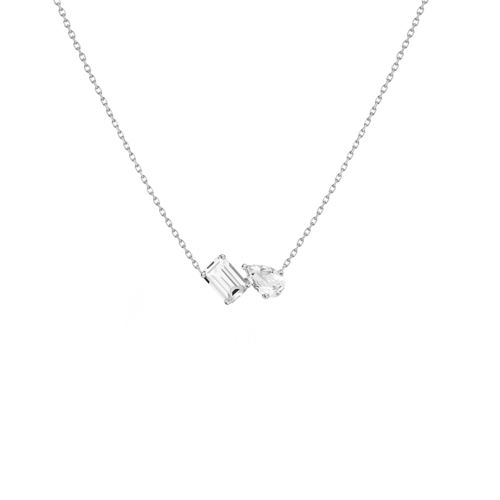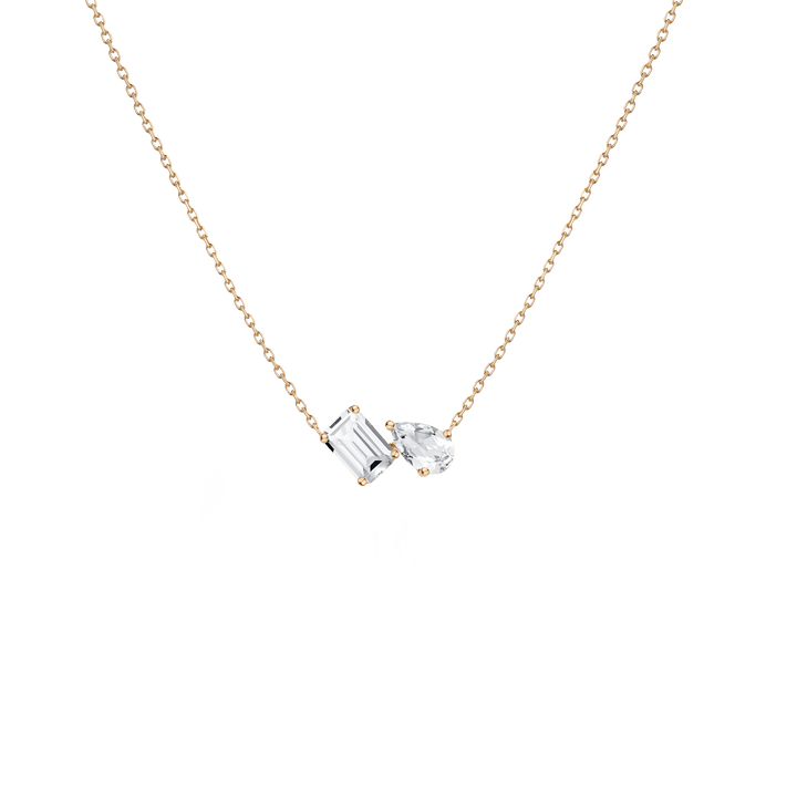 Handcrafted in 18k gold with a 5x3mm pear-cut gemstone (0.29ct) and a 5x3mm emerald-cut gemstone (0.29ct). Vintage prong setting. Pendant dimensions: 7mm x 10mm. Thickness: 4.4mm. Chain: 18' with jump ring at 15.5'. Weight: 3.5g. Stones are lab-grown or natural.