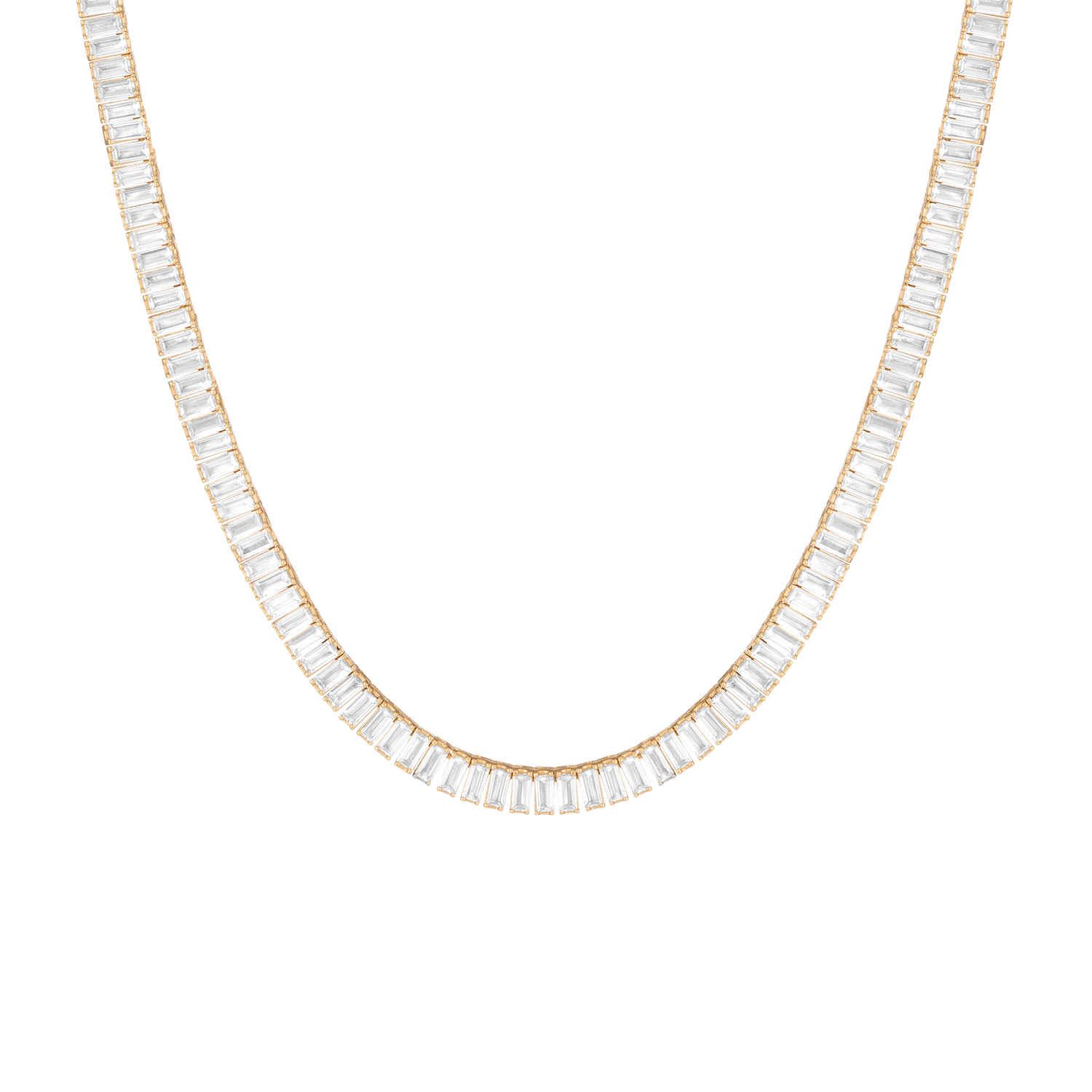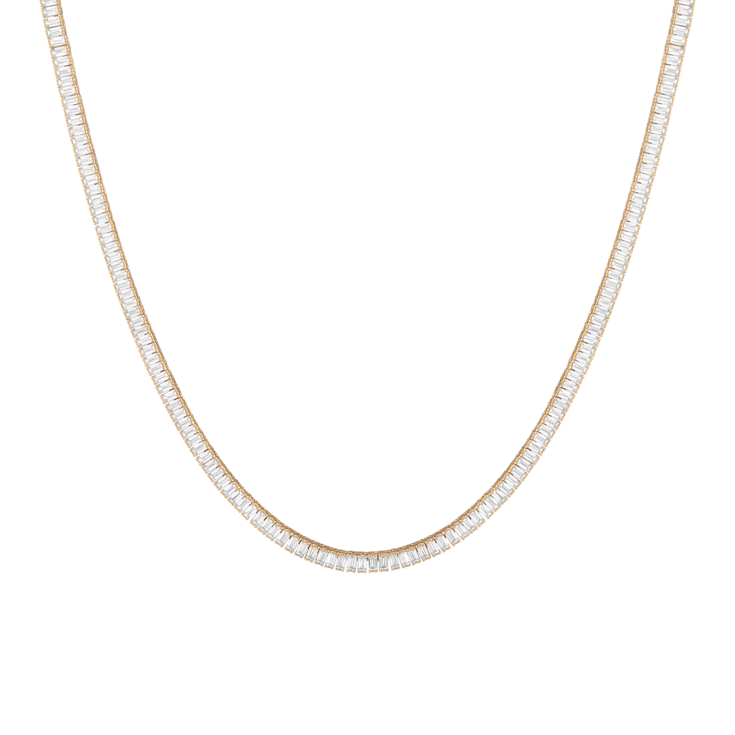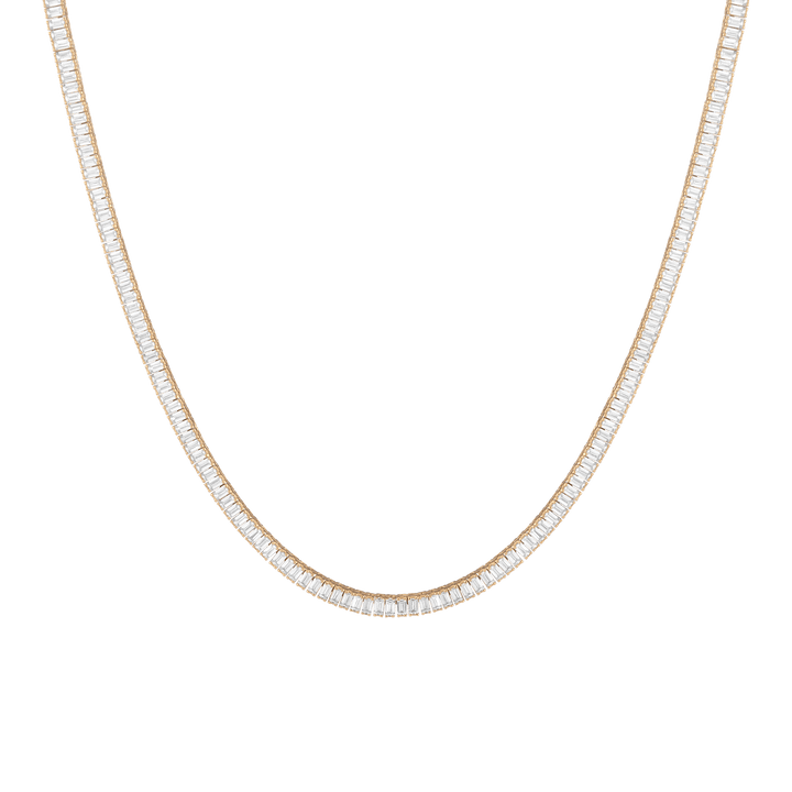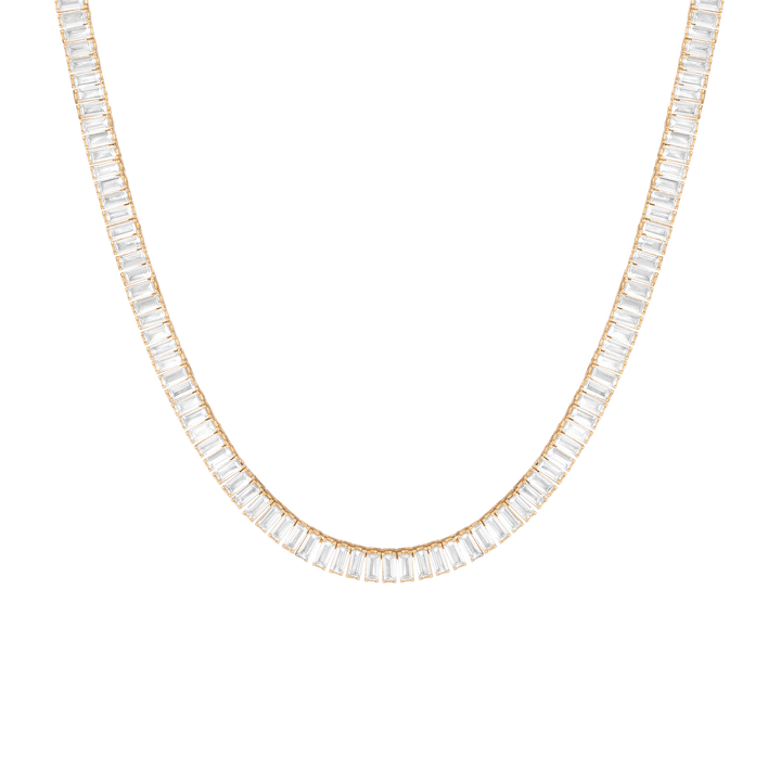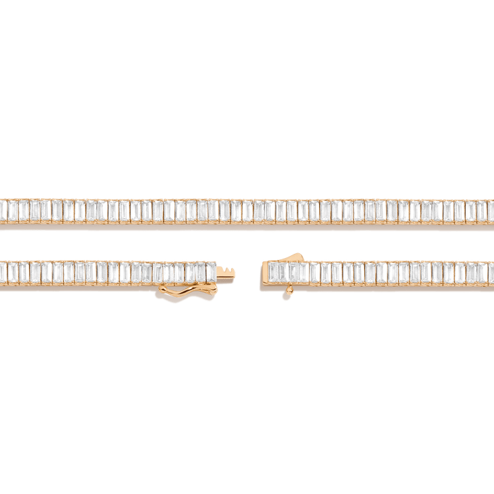 Made in gold vermeil with AAA quality baguette lab-grown white sapphires. 13 tcw: 3x1.5mm; 27 tcw: 4x2mm. Necklace length: 16''. Width: 3.5mm or 5mm. Thickness: 2.75mm. Weight: 21.5g or 31.6g. Box clasp with safety hook.