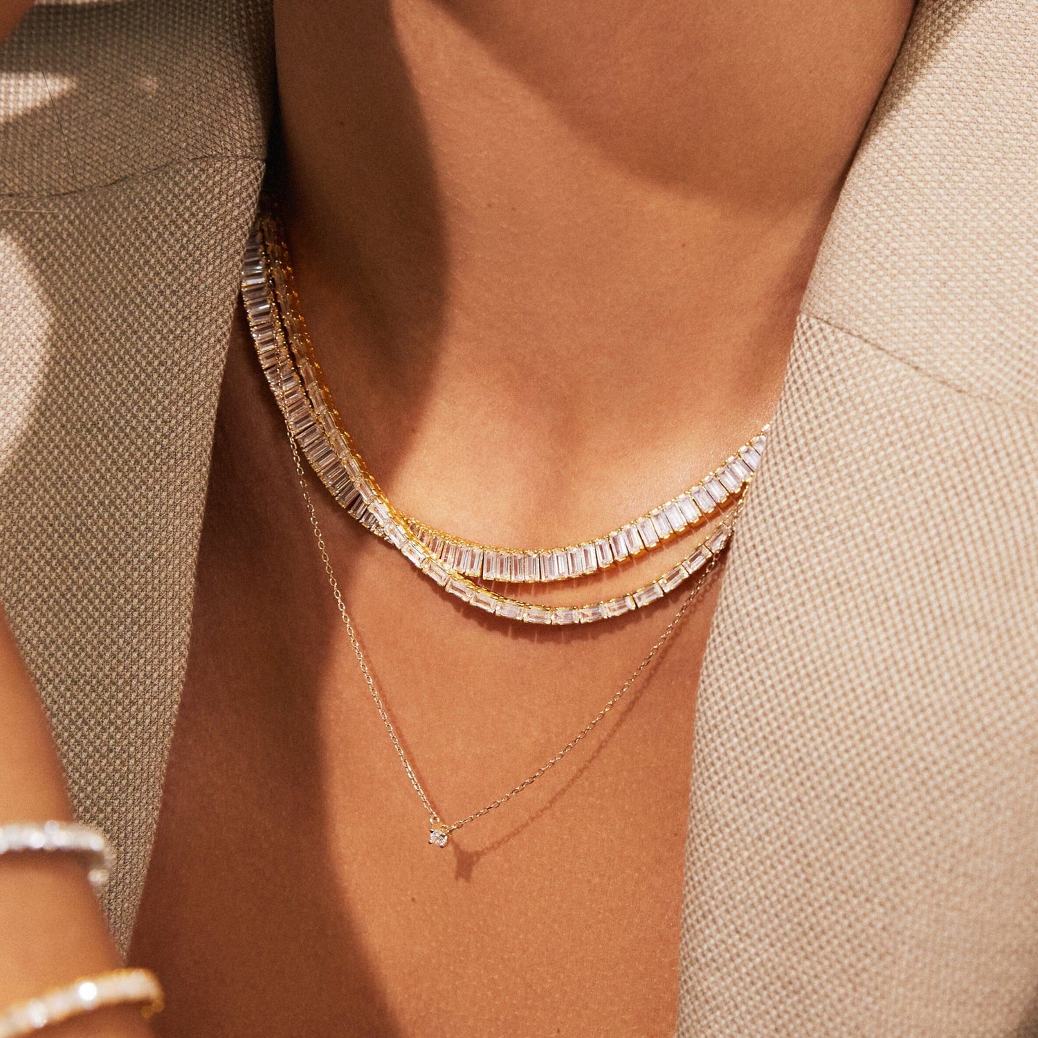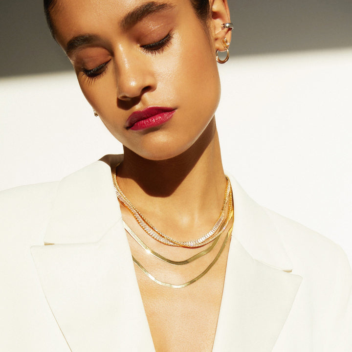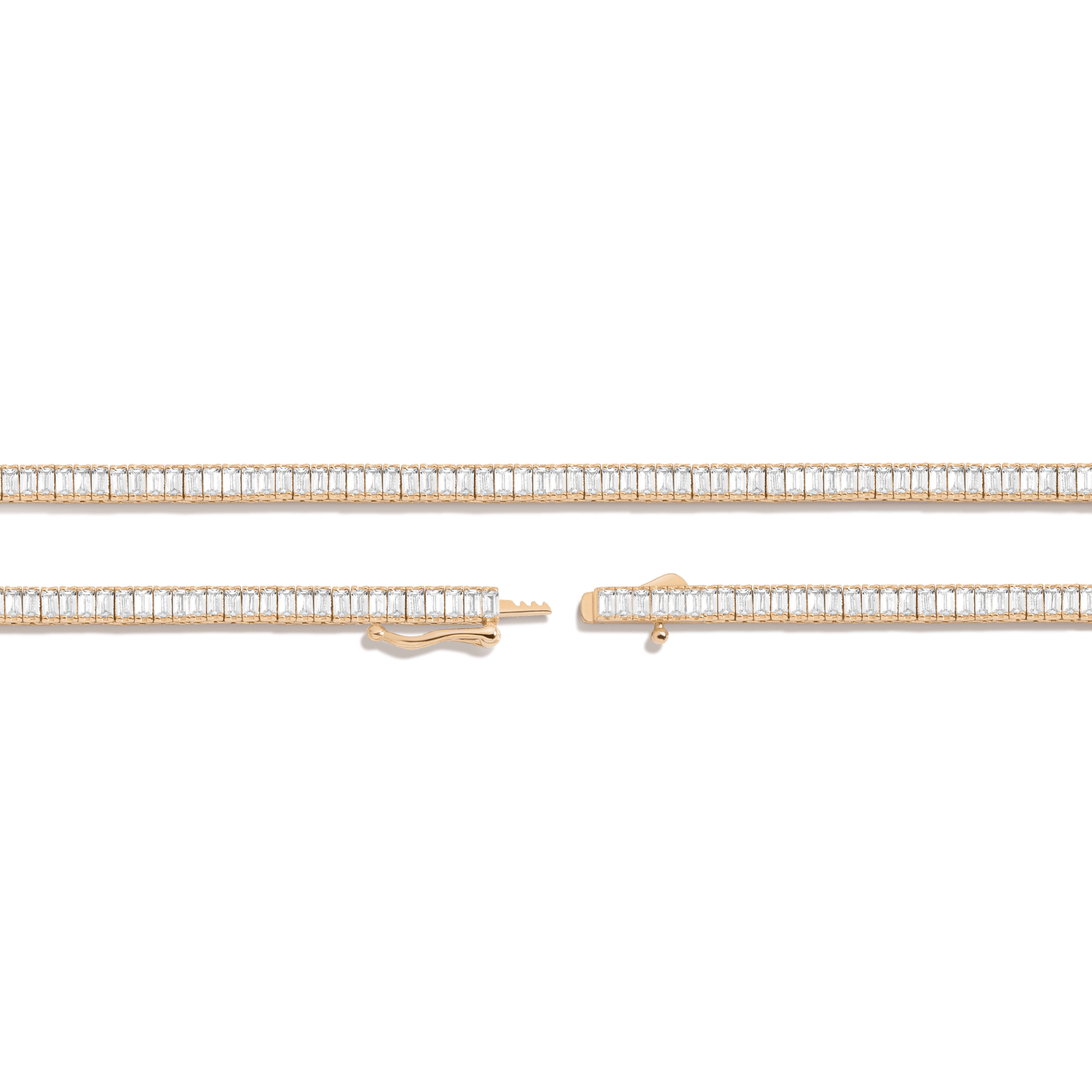 Made in gold vermeil with AAA quality baguette lab-grown white sapphires. 13 tcw: 3x1.5mm; 27 tcw: 4x2mm. Necklace length: 16''. Width: 3.5mm or 5mm. Thickness: 2.75mm. Weight: 21.5g or 31.6g. Box clasp with safety hook.