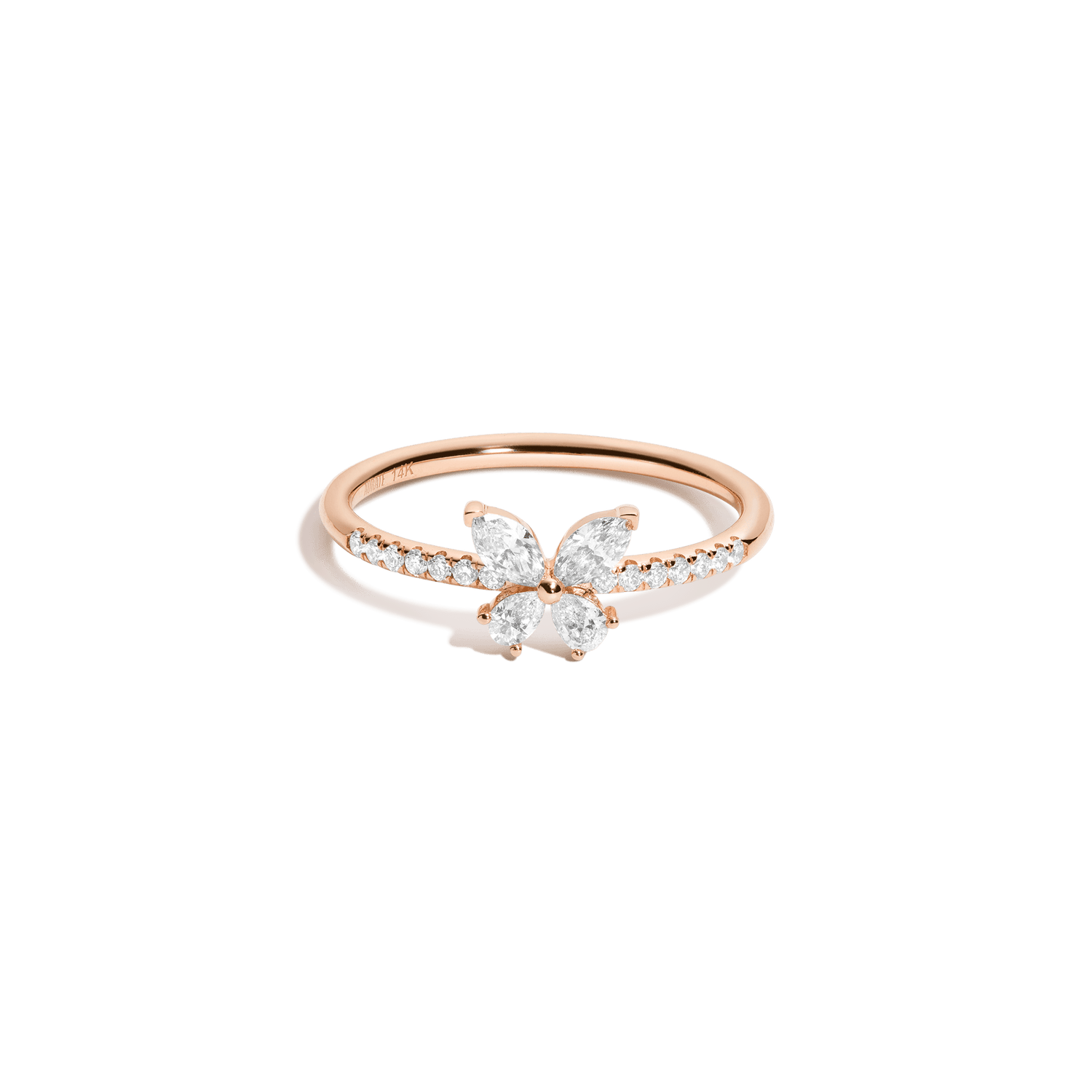 Handcrafted in 14k gold with 0.4 carats of GH SI lab grown diamonds: 2 marquise (4x2.2mm), 2 pear (4x2mm), and 14 round (1.1mm). Width: 7.5mm, thickness: 3.6mm. Weight: 3g.