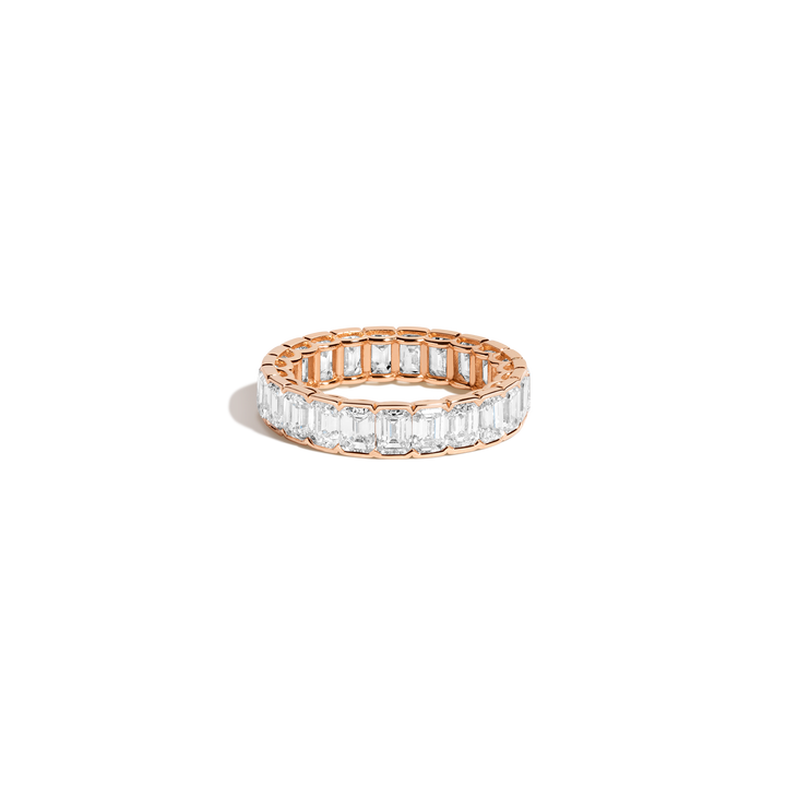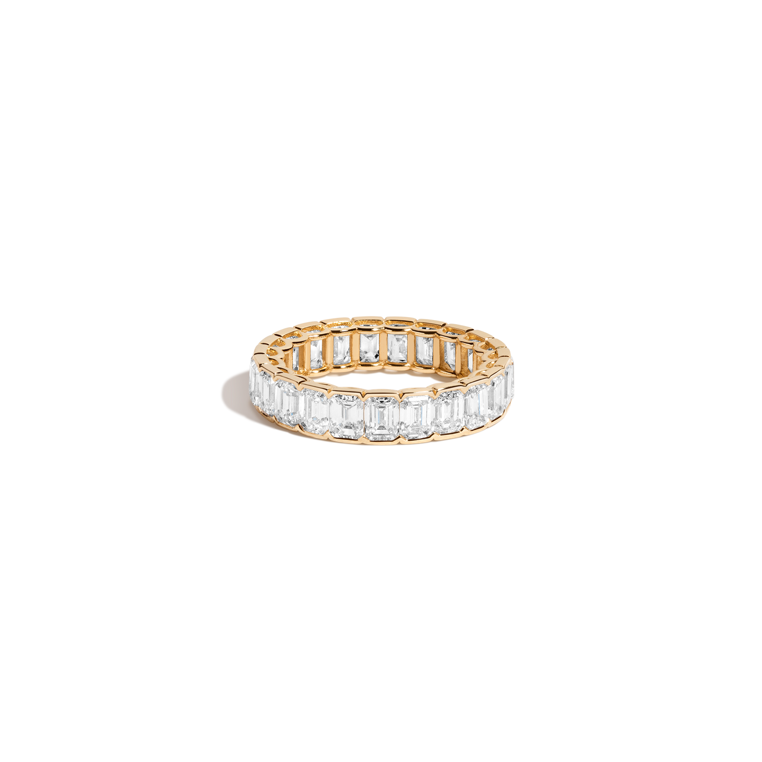 This Emerald Lab Grown Diamond Semi-Bezel Eternity Ring by Aurate (18k) brings warmth and richness to the eternity silhouette. Each emerald-cut diamond is semi-bezel set for durability and brilliance, making this ring a luminous tribute to lasting beauty and conscious craftsmanship.