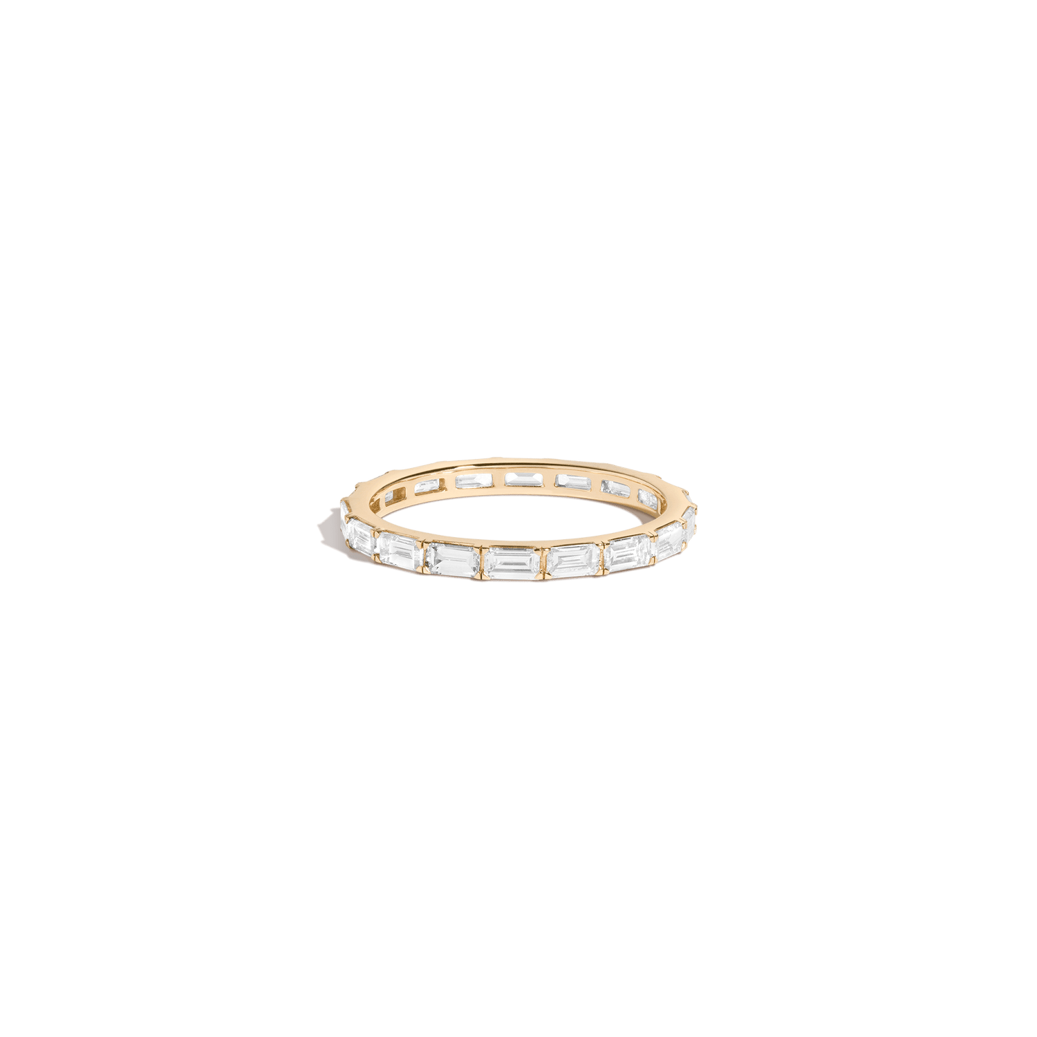 Handcrafted in 18k solid gold with GH SI-quality lab-grown baguette diamonds totaling 1.17 carats. Each diamond measures 3.2 x 1.8mm (0.065ct). The ring is 2mm wide, 2mm thick, and weighs 2.3g.