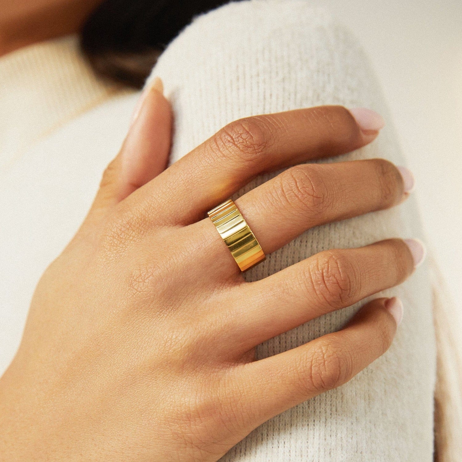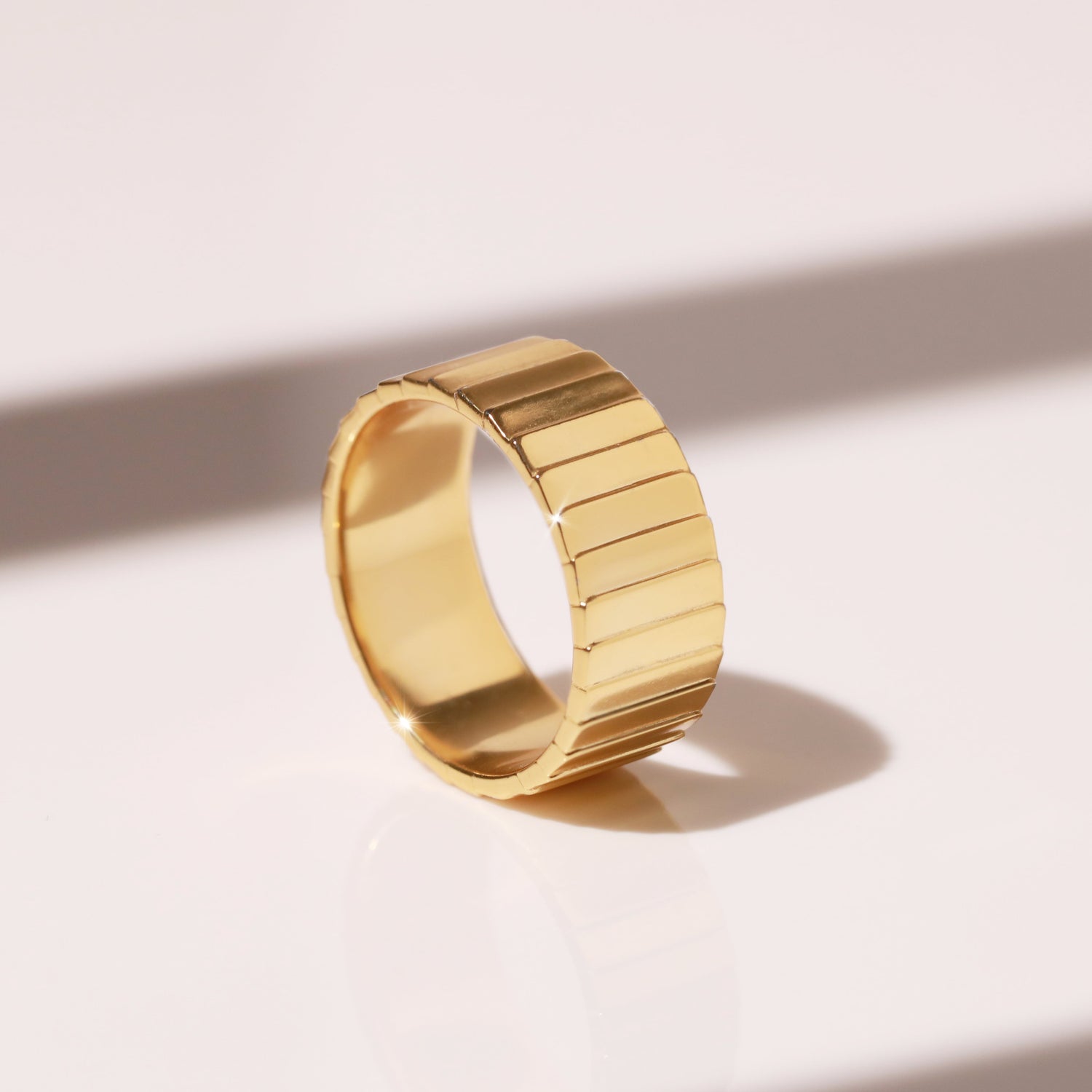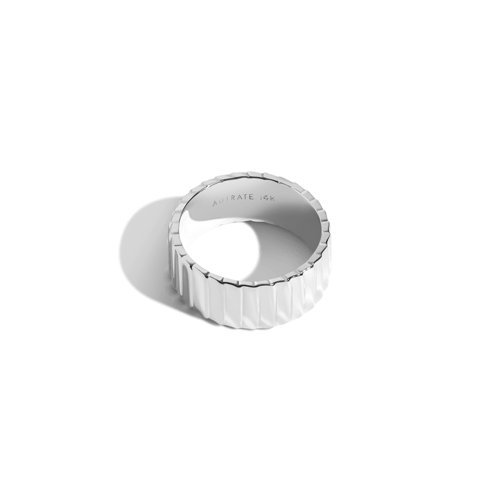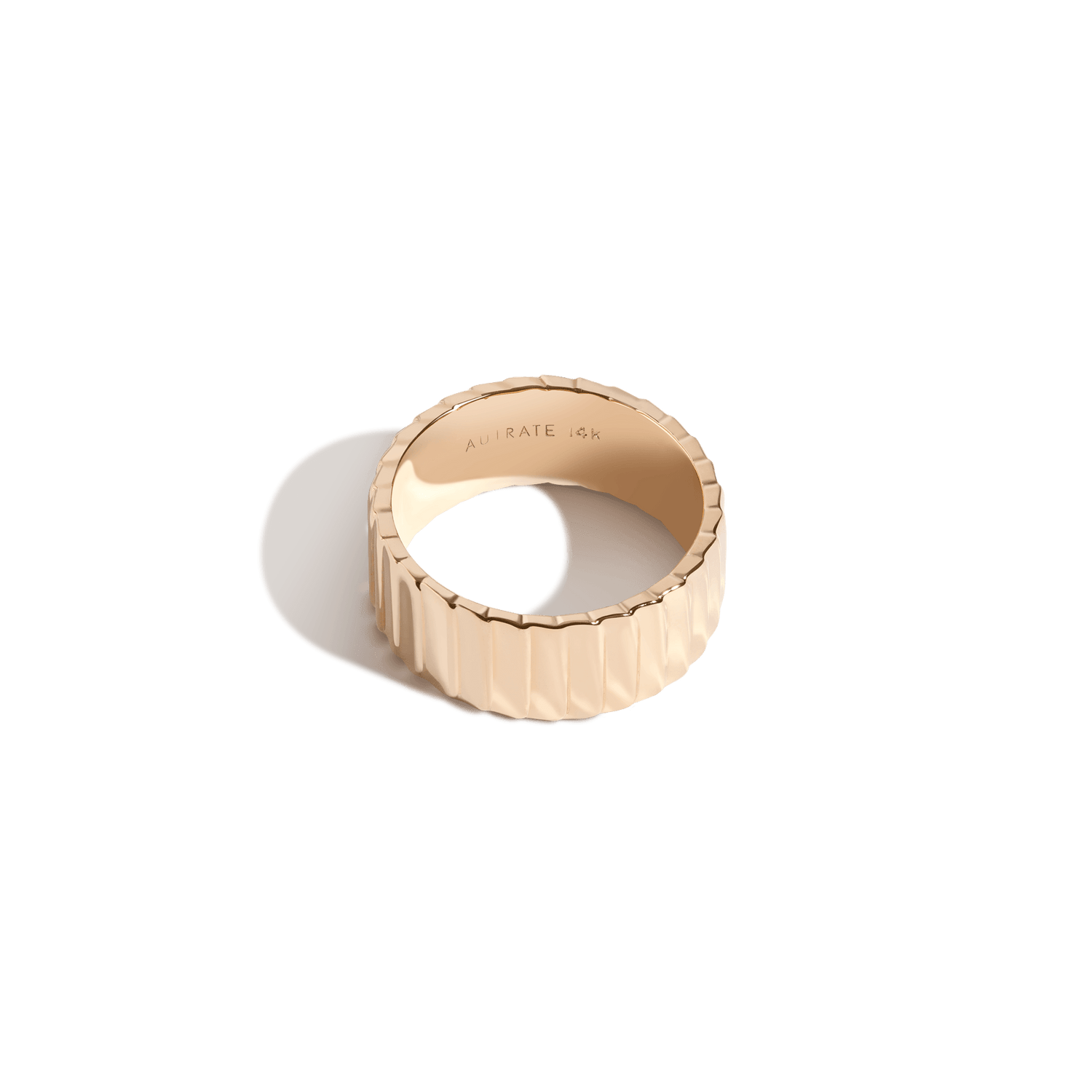This Infinity Ring by Aurate in vermeil offers a sculptural and symbolic expression of eternal style. Vertically carved ridges encircle its surface, creating an eye-catching texture that reflects light beautifully. With its solid, timeless form, this statement ring carries the strength of forever in a sleek, wearable shape.