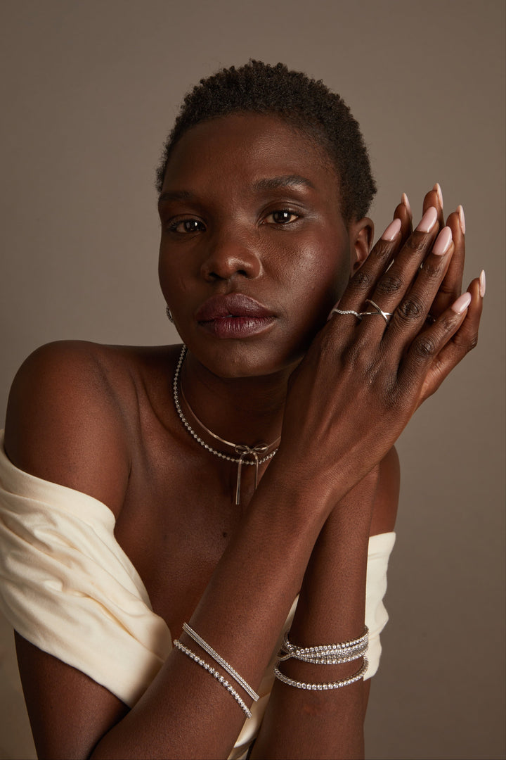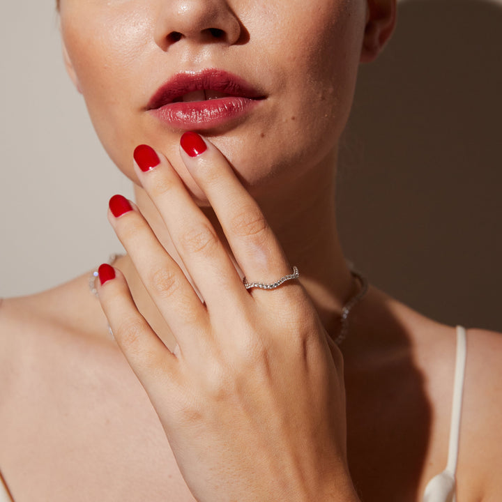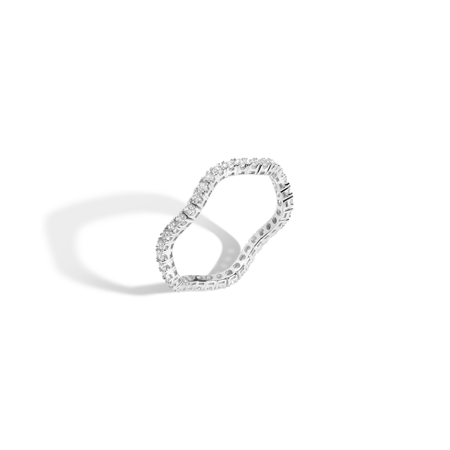 This Lab Grown White Sapphire Wave Ring by Aurate is a sparkling tide of sophistication. Featuring 40 white sapphires that ripple across the finger, the design flows with graceful motion and delicate shimmer. Ideal on its own or layered with the matching bracelet, it’s the essence of everyday elegance.