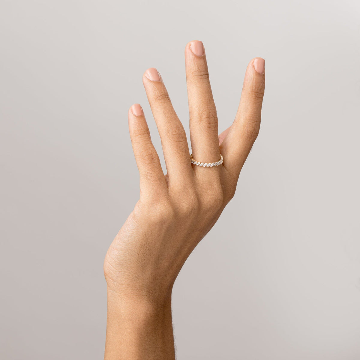 This Marquise Diamond Eternity Ring by Aurate is a radiant tribute to elegance and grace. Featuring natural marquise-cut diamonds in a refined French pavé setting, the design glimmers with an ethereal charm. Set in 18k gold, it’s the perfect harmony of drama and delicacy—ideal for stacking or wearing solo as a defining signature.