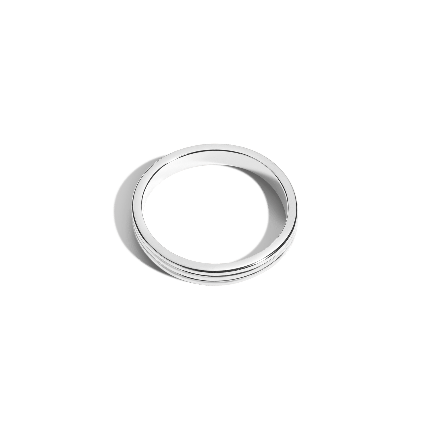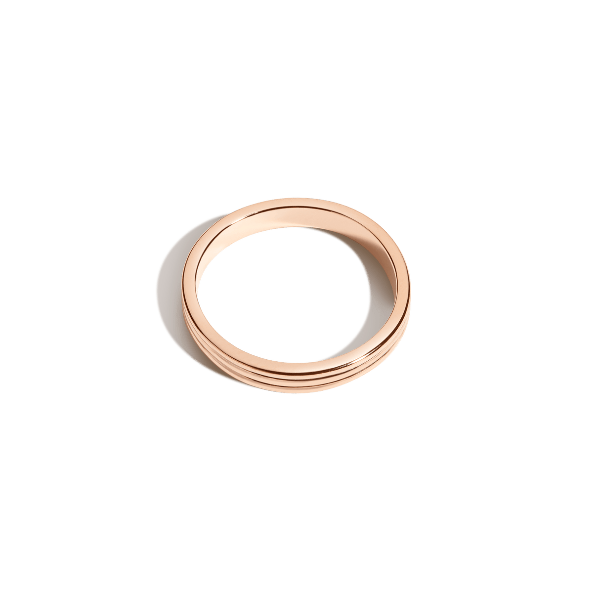 Crafted in 18k gold with three domed, polished rows. Width: 3mm, Thickness: 2mm, Weight: 3.5g.