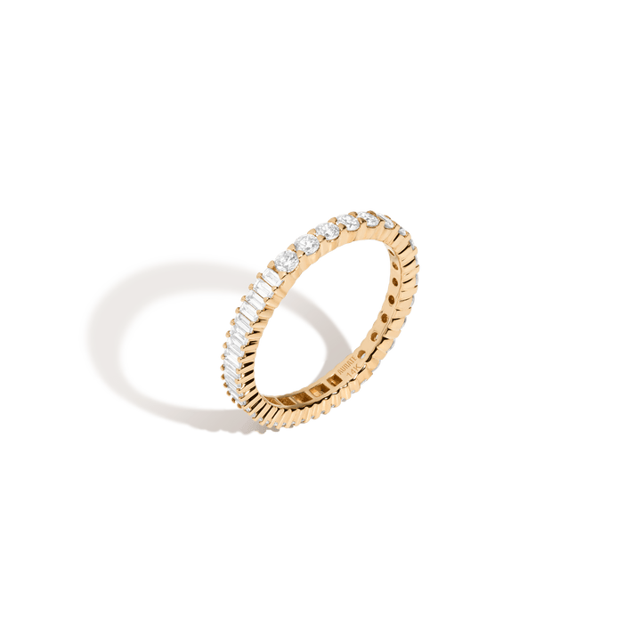 Handcrafted in 14k recycled gold with GH/SI quality round (2.2mm, 0.03ct) and baguette (2.2x1.1mm, 0.02ct) lab-grown diamonds. Total carat weight: 1.07tcw. Width: 2.5mm. Thickness: 1.4mm. Weight: 3g.