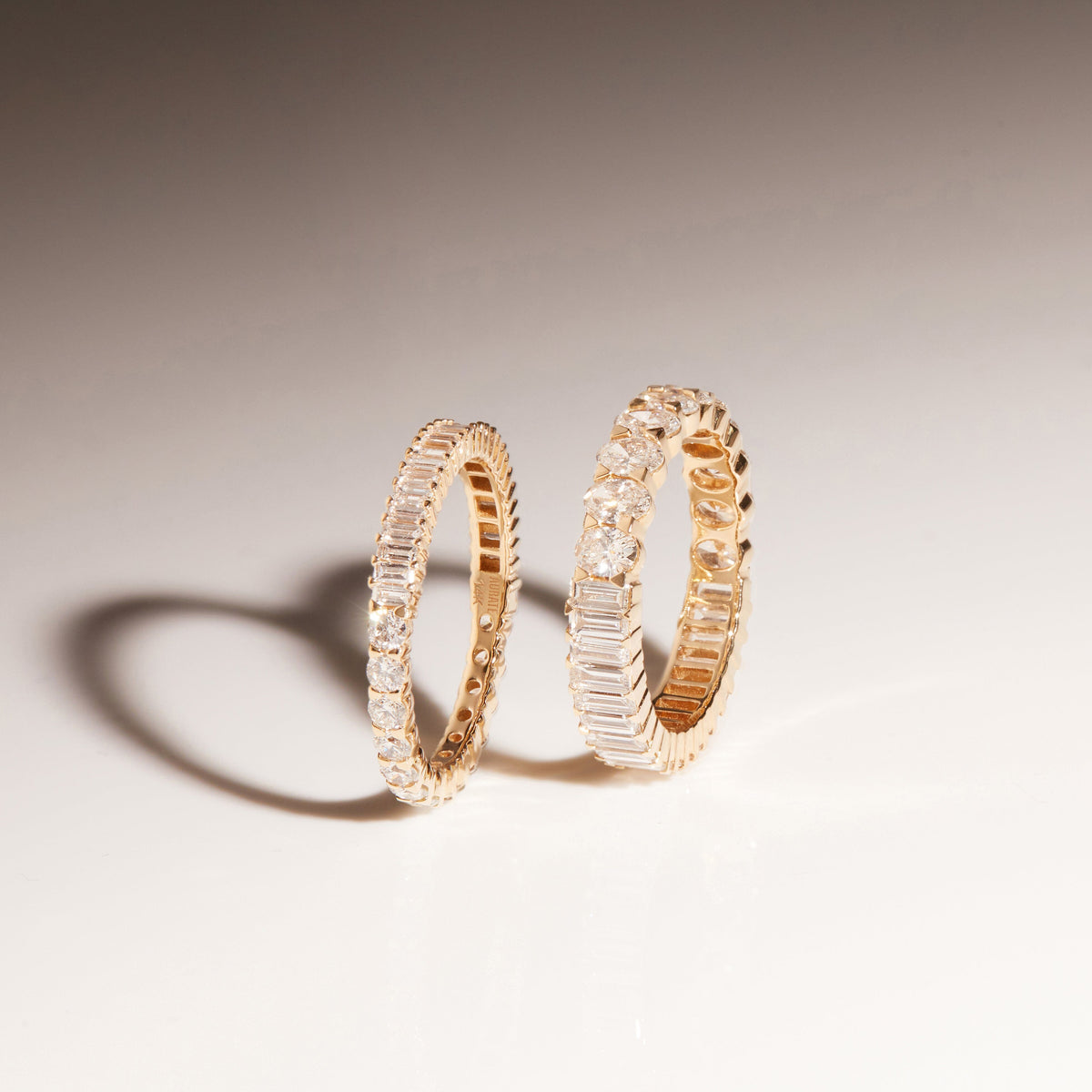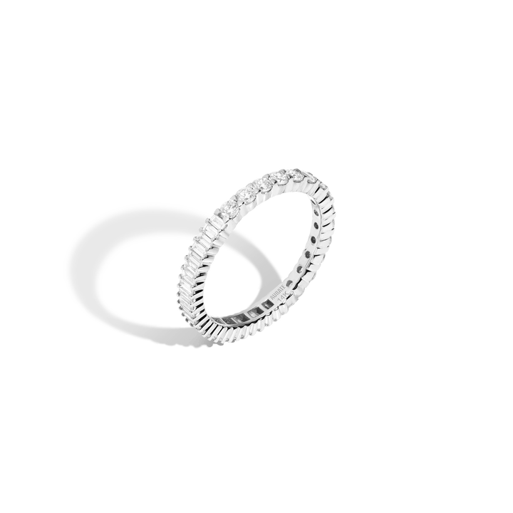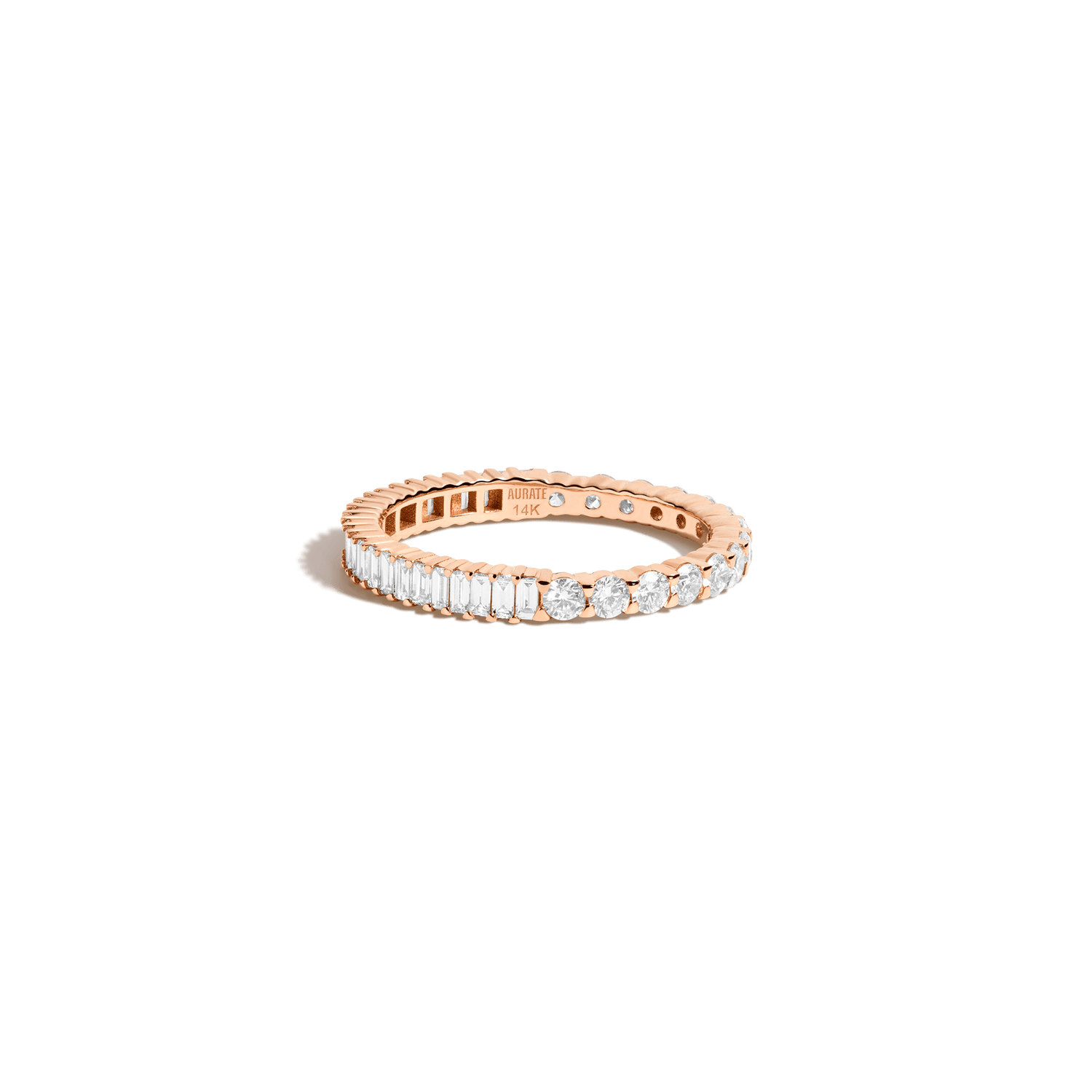 This Mini Two-in-One Lab Grown Diamond Eternity Ring by Aurate (14k) offers versatile brilliance with dual perspectives. One half sparkles with round lab-grown diamonds, while the other gleams with baguette cuts, all prong-set in sustainable gold. Flip it to suit your mood or let both sides shine at once—this piece embodies playful elegance and modern design.