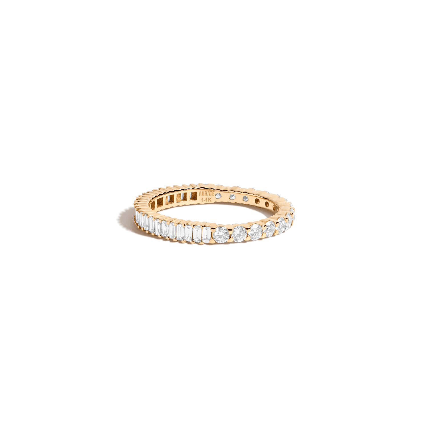 This Mini Two-in-One Lab Grown Diamond Eternity Ring by Aurate (18k) takes duality to new heights with a richer hue. Featuring alternating rows of baguette and round diamonds, its reversible design brings variety and luxury into perfect harmony. A statement of sustainability and personal style.